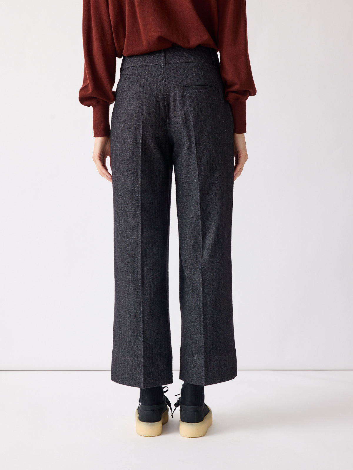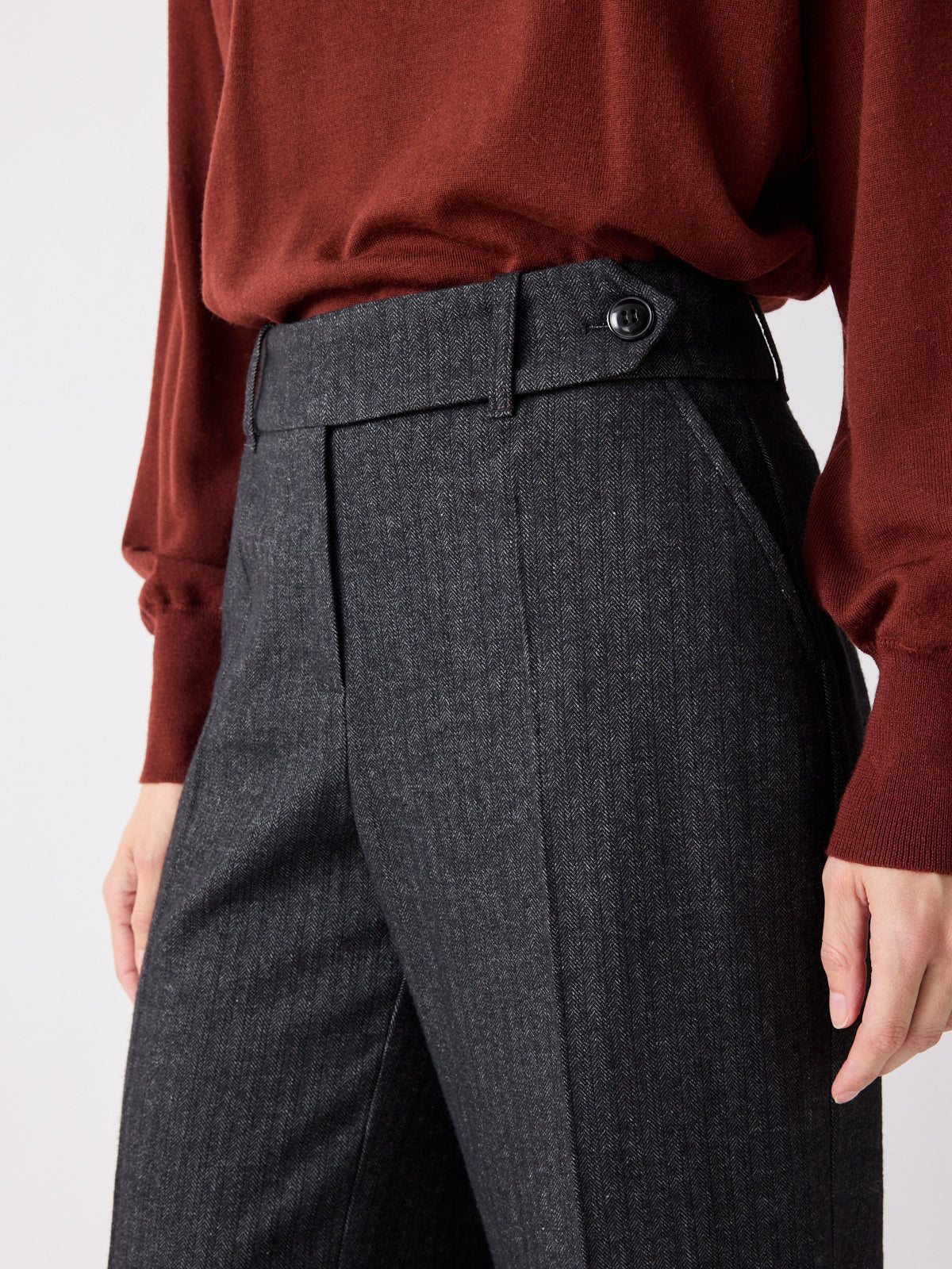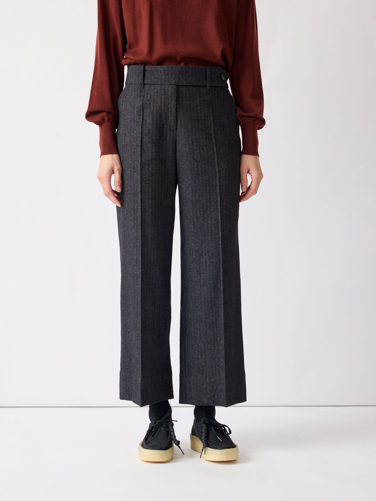 These trousers are crafted from dark grey fabric with a unique woven texture and subtle linear effect, adding visual depth and understated elegance. Designed with a mid-rise waist, relaxed straight leg, cropped ankle length, and an asymmetric button closure.