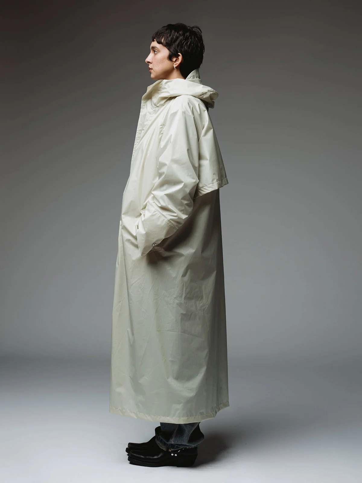 It falls to the ankles for optimal protection against the rain. Its subtle flared cut and storm flap at the back highlight its refined silhouette. The high zip closure is protected by a storm flap, and the cuffs are adjustable with snap buttons.
