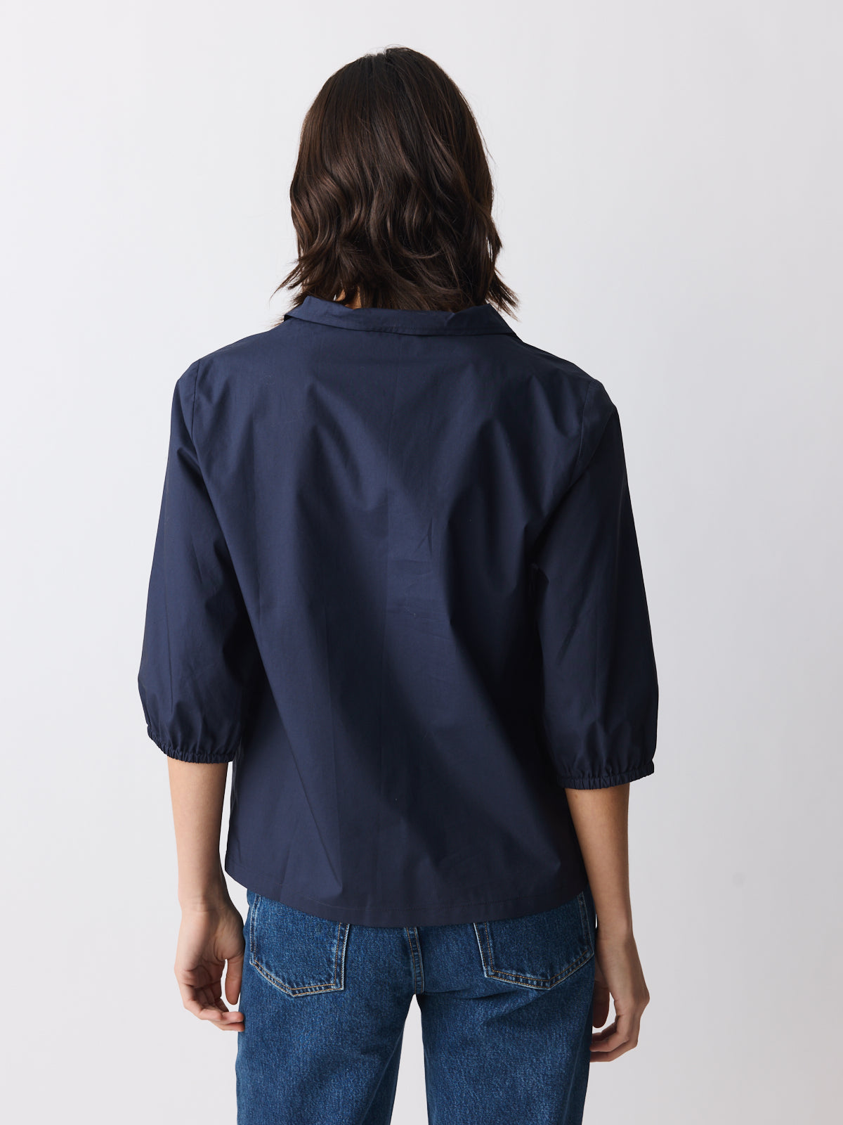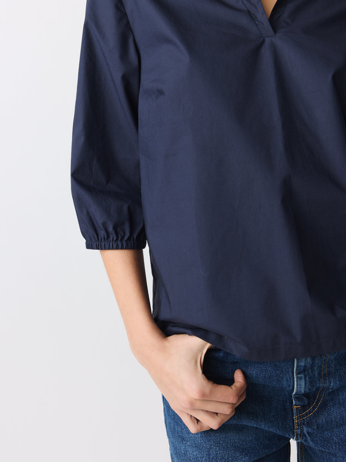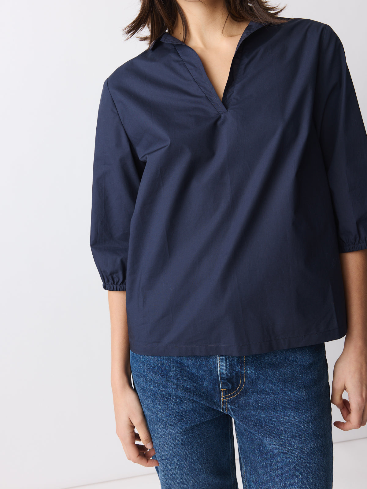 A well-loved design from last season revisited in navy cotton, this top returns with the same easy appeal. It features a V-neck with a small polo collar, 3/4 sleeves with elasticated hems and a straight, regular fit.