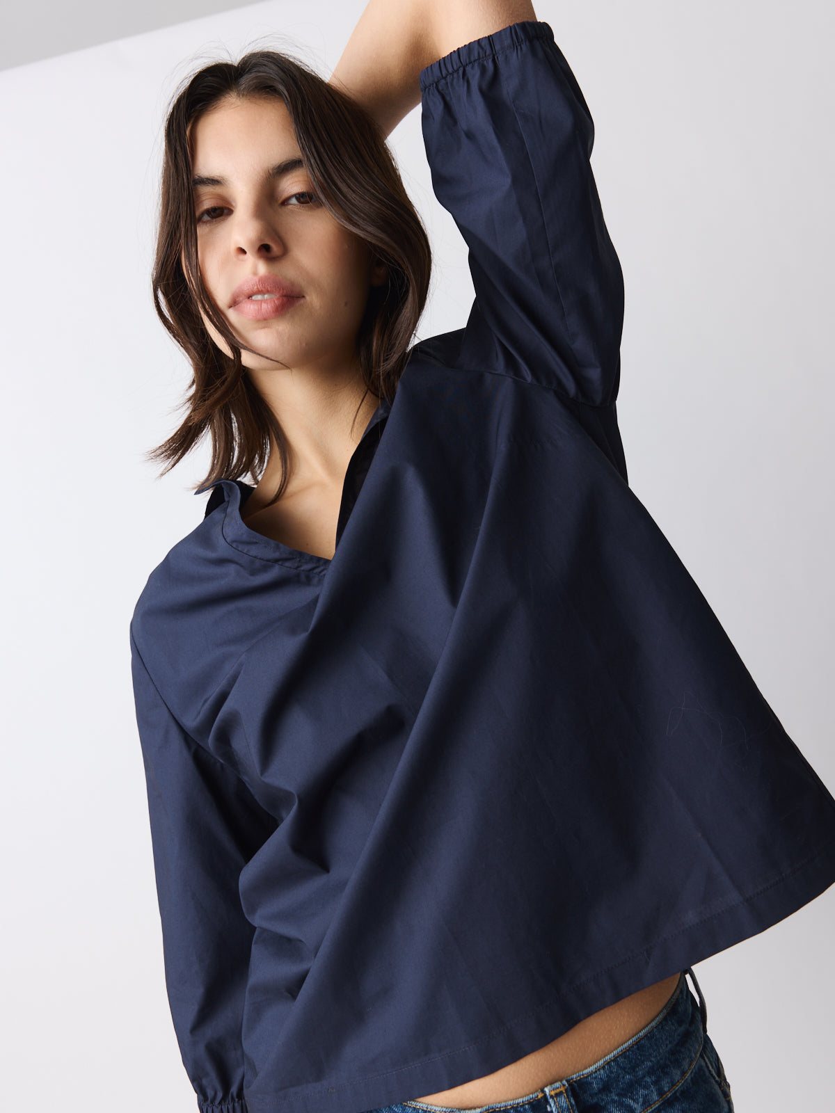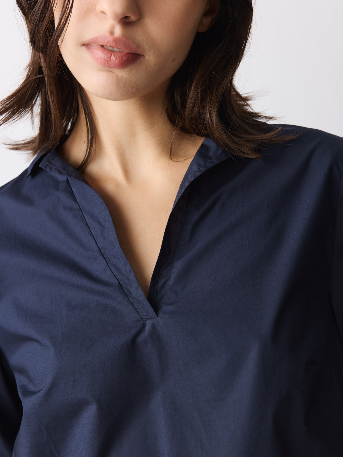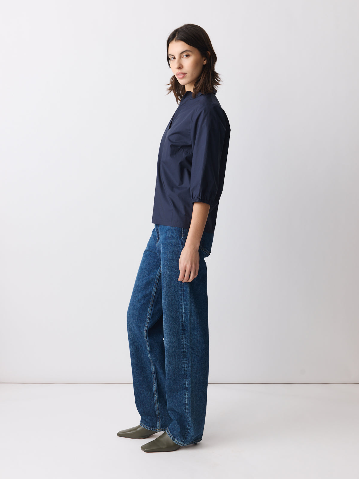 A well-loved design from last season revisited in navy cotton, this top returns with the same easy appeal. It features a V-neck with a small polo collar, 3/4 sleeves with elasticated hems and a straight, regular fit.