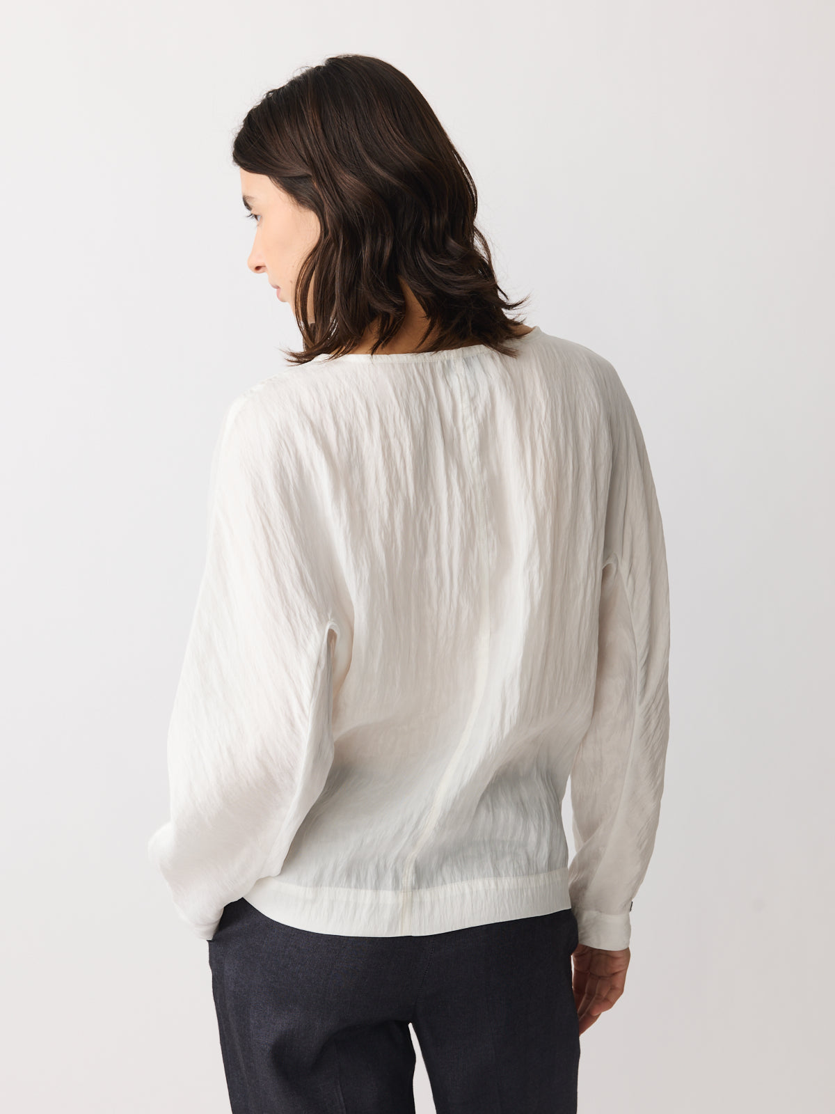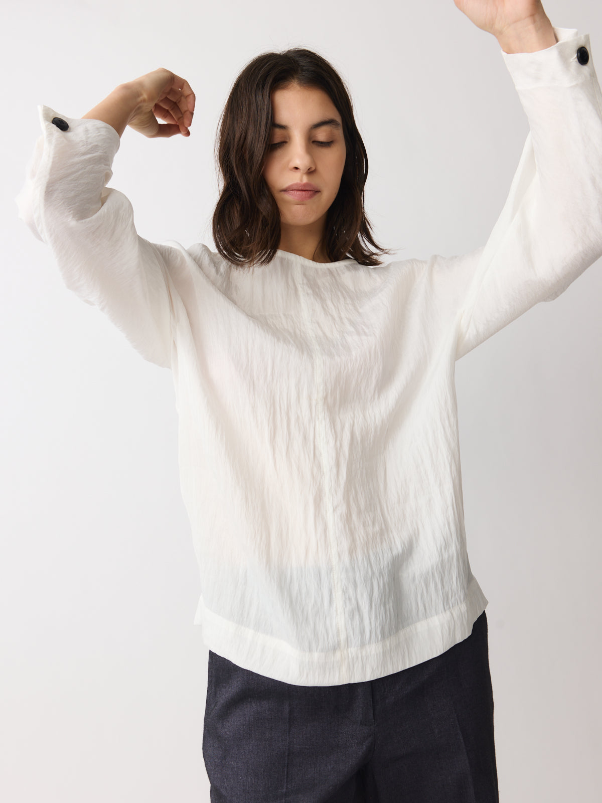 In a mother-of-pearl cream tone with a softly wavy surface, this top stands out through its lightweight lyocell blend fabric. Extremely light in feel, it features a boat-inspired neckline, long sleeves and adjustable cuffs that create a subtle balloon shape.