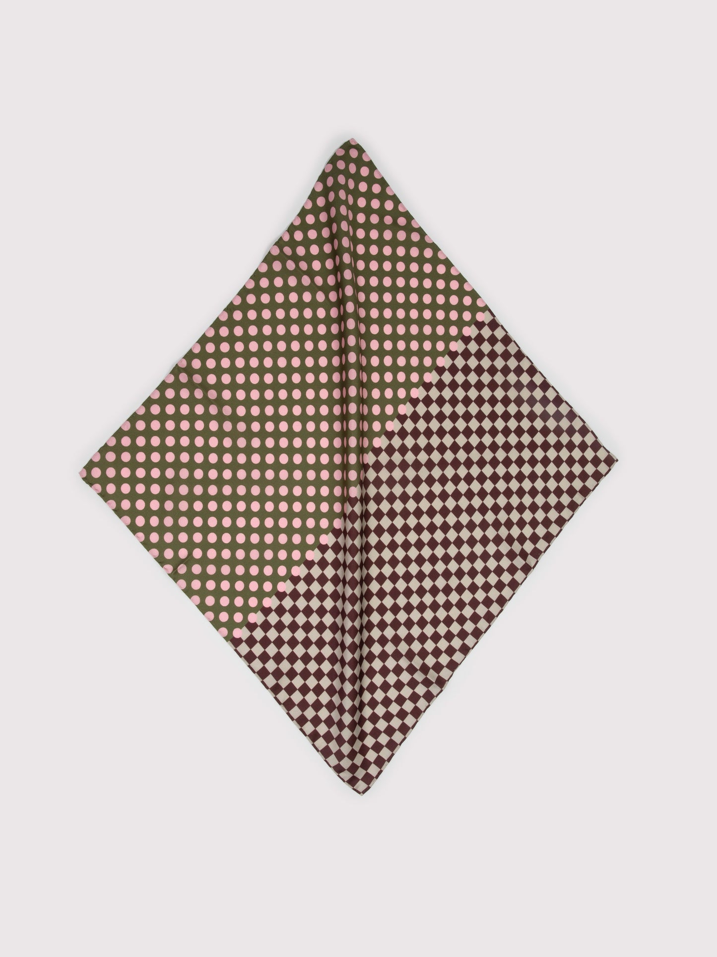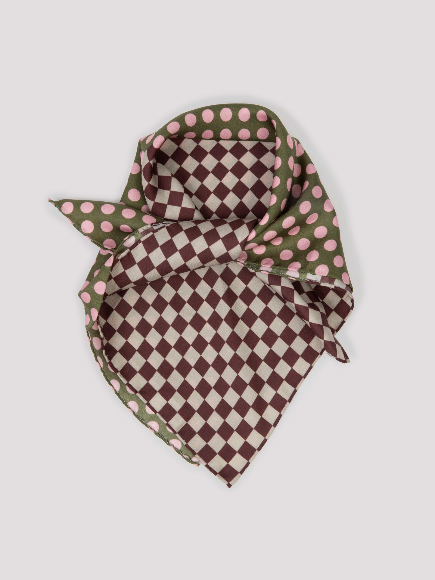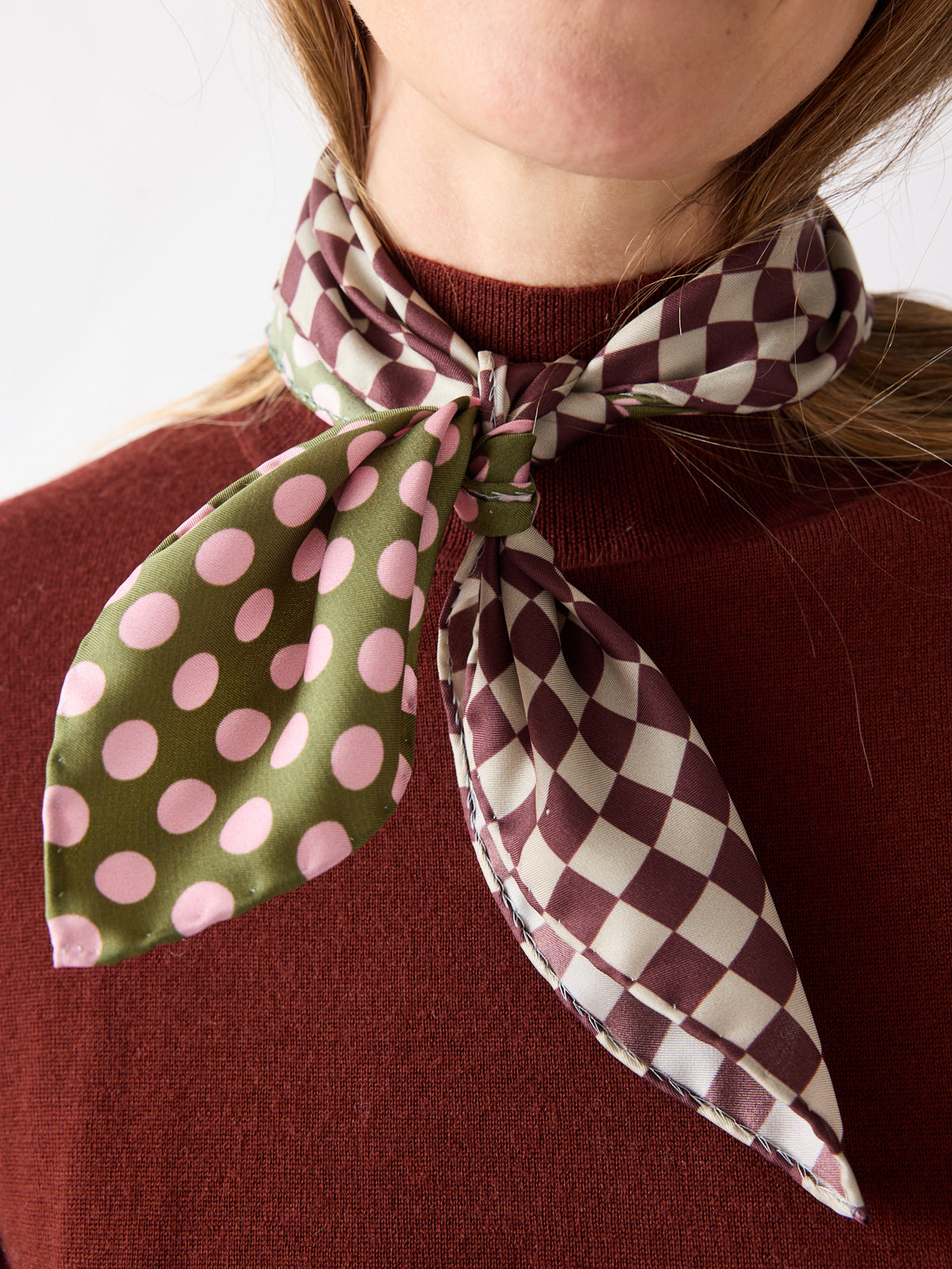 A playful little square scarf combining two distinct patterns: burgundy and cream checks meet salmon pink polkas on a green background. The earthy colour palette keeps this fun graphical pattern grounded.