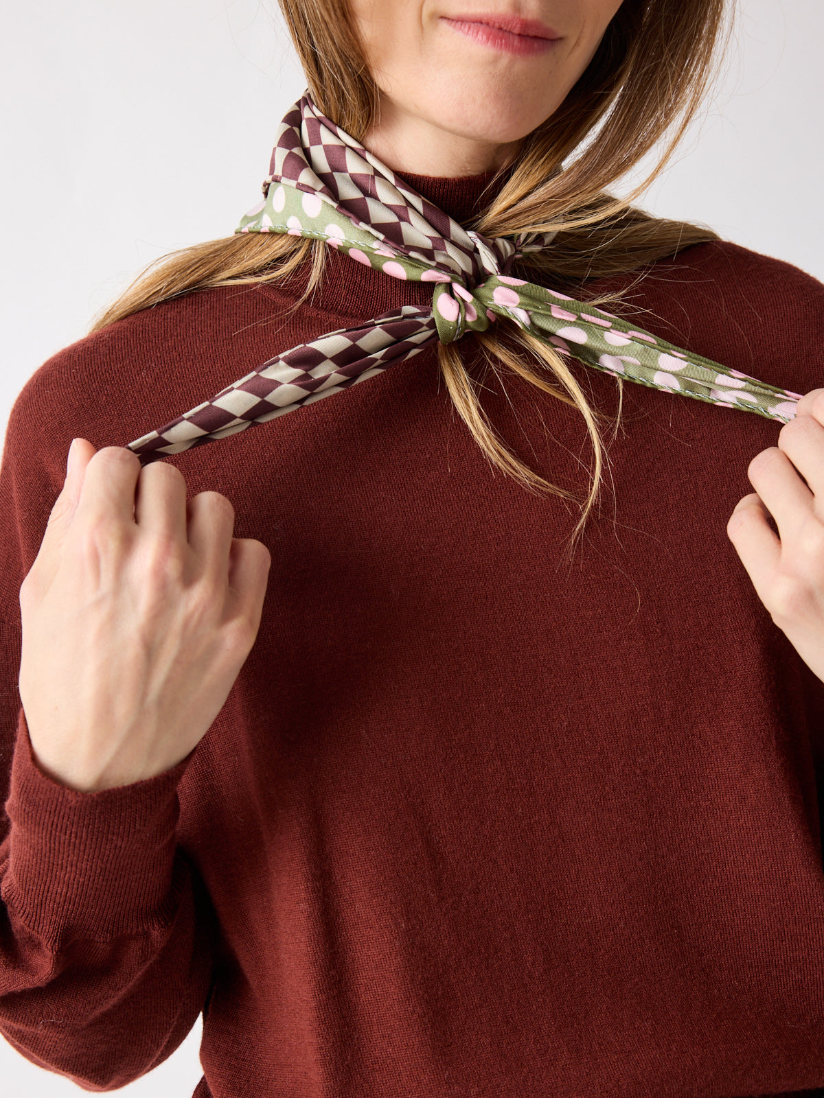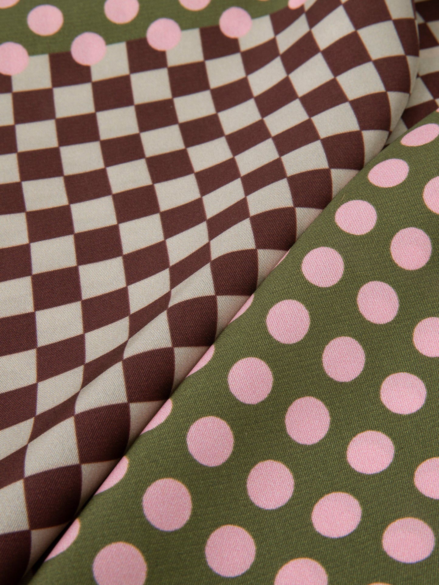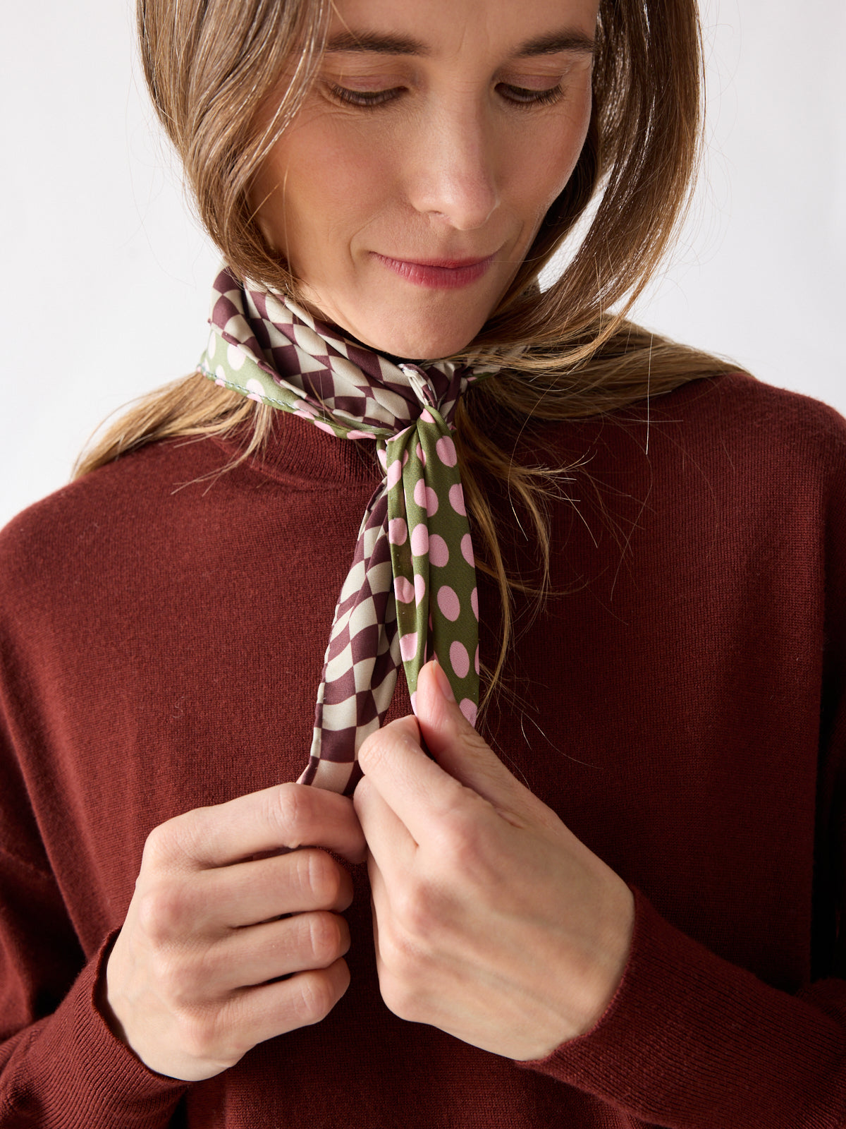 A playful little square scarf combining two distinct patterns: burgundy and cream checks meet salmon pink polkas on a green background. The earthy colour palette keeps this fun graphical pattern grounded.