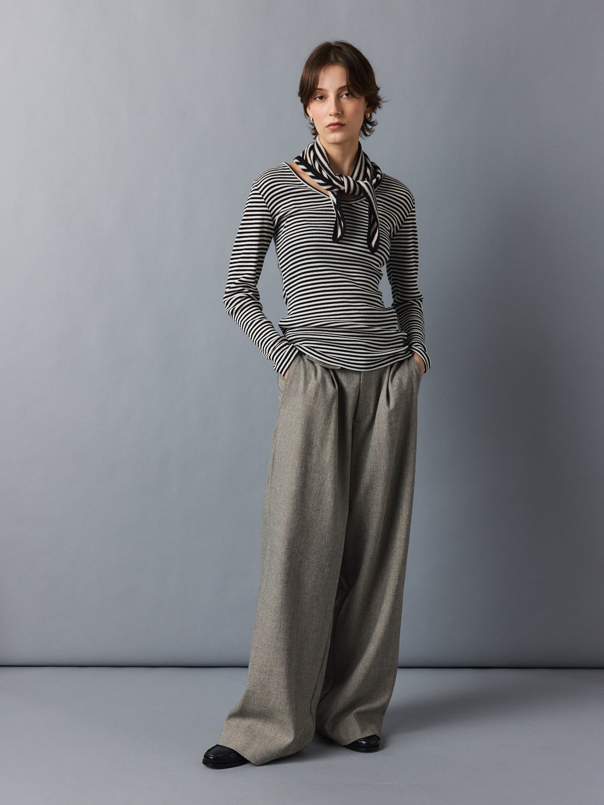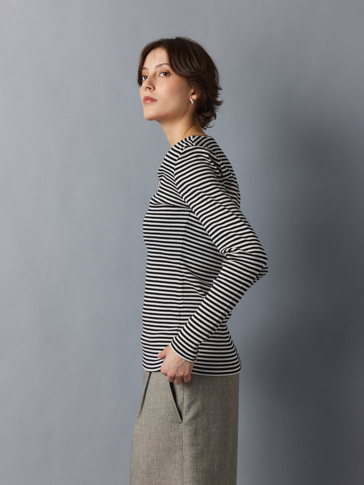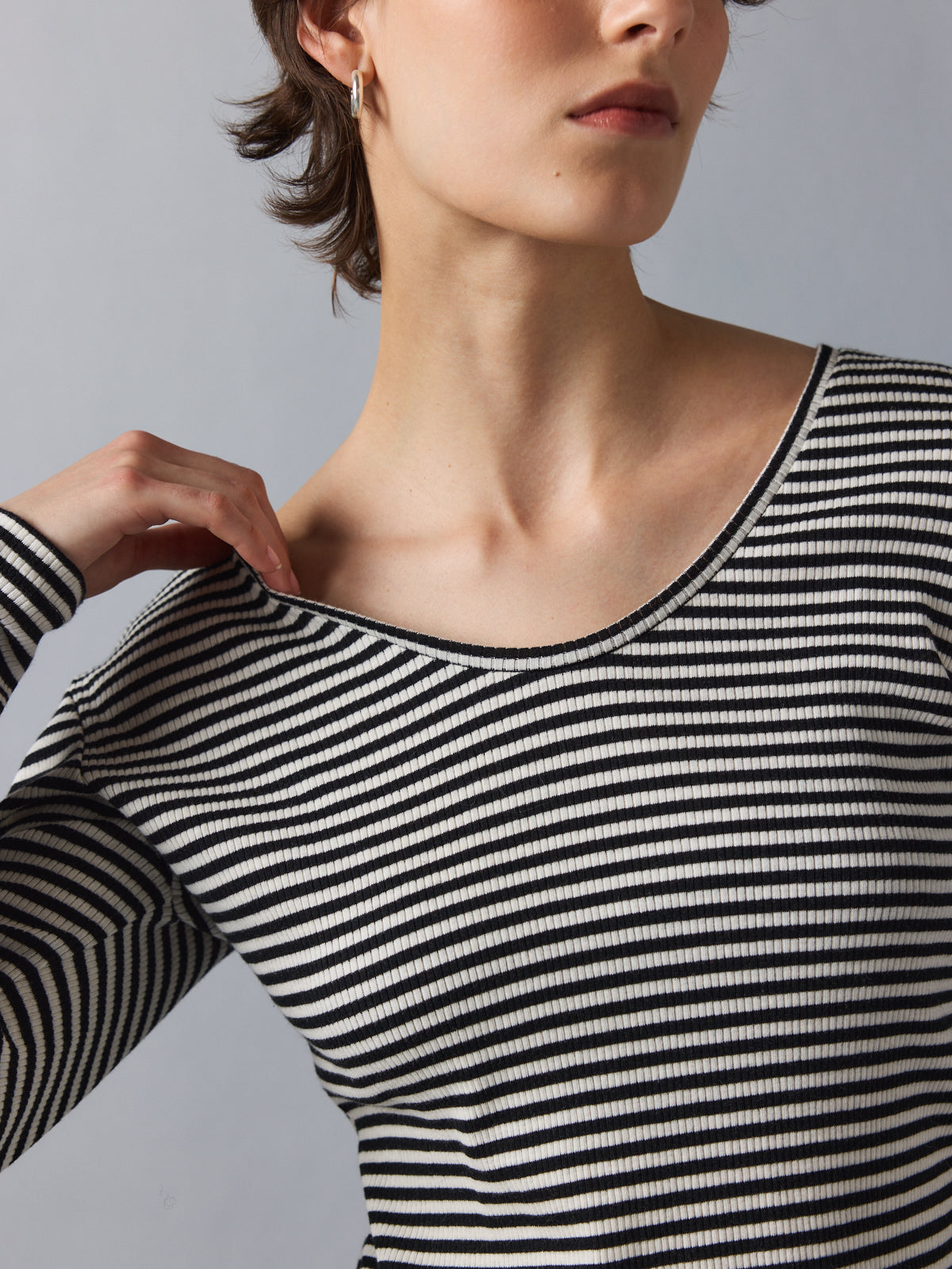 This T-shirt features cream and black stripes in an 80% cotton, 20% cashmere rib knit. The neat, close-to-the-body fit and natural stretch enhance its graphic look, while cashmere adds gentle warmth. Designed with a deep round neckline and long sleeves.
