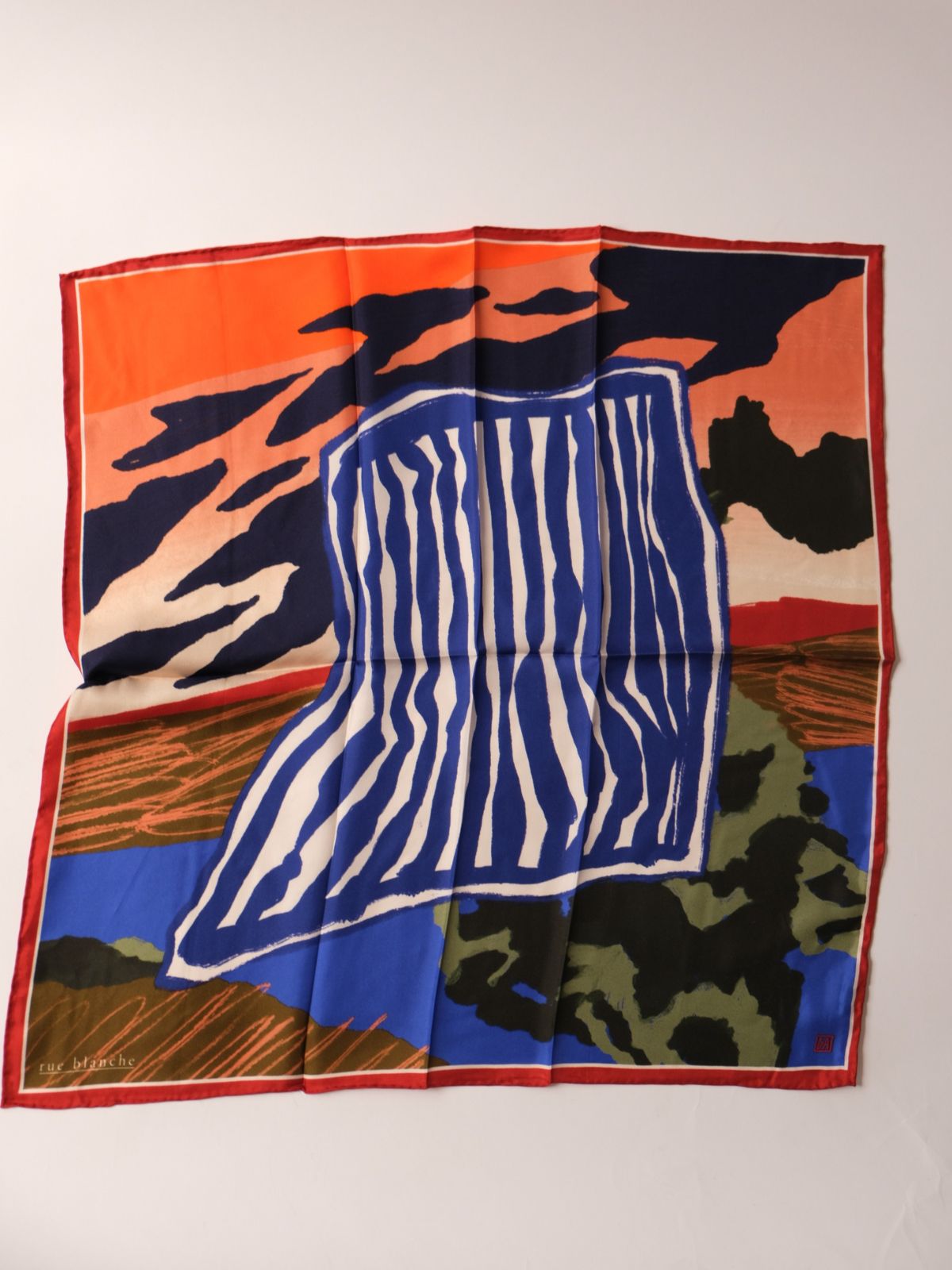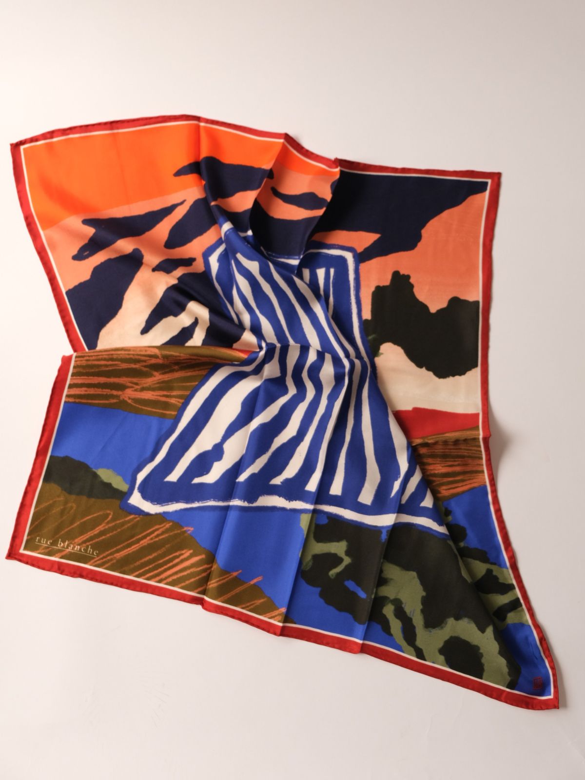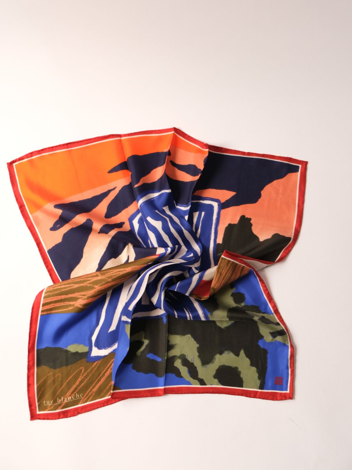 A square silk scarf featuring a vivid landscape painted by artist Gaëlle de Laveleye. In this third collaboration, her composition blends deep, warm and bright colours. A flowing royal blue scarf appears within the scene. The scarf is framed by a bold red border and a rolled rim. Lightweight and soft, this is a timeless piece to return to year after year.