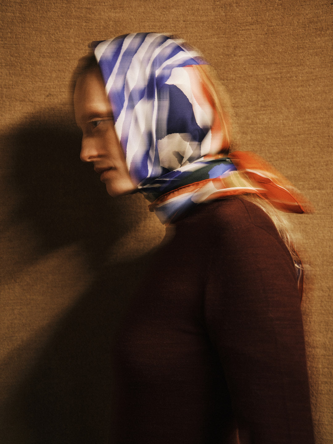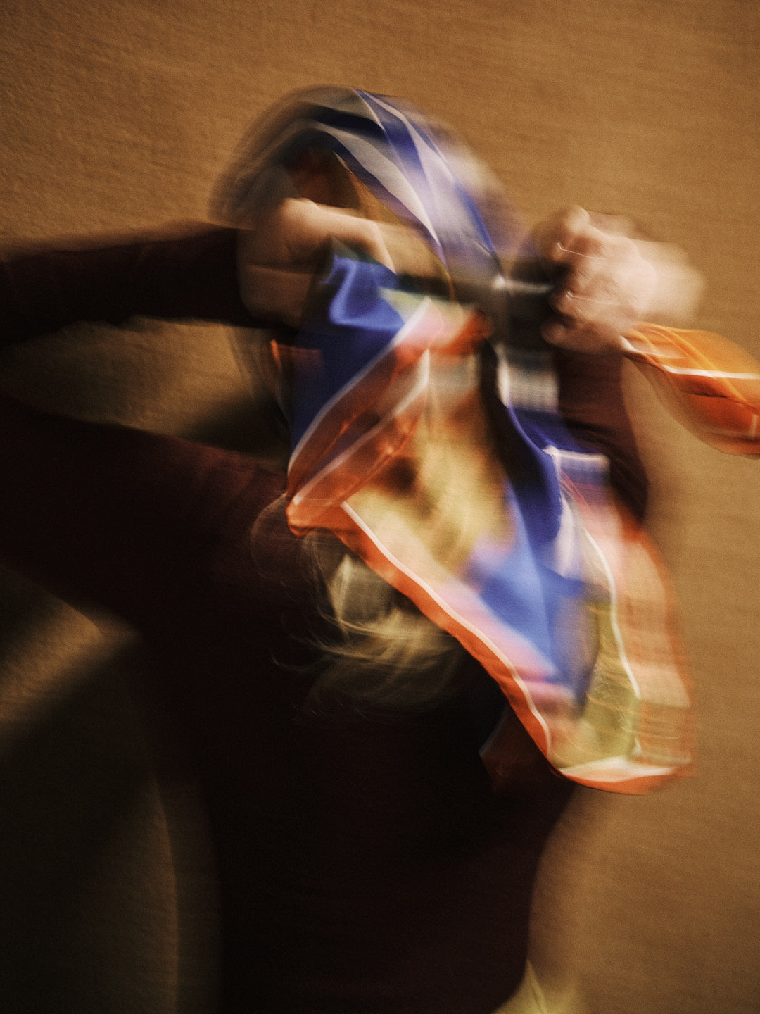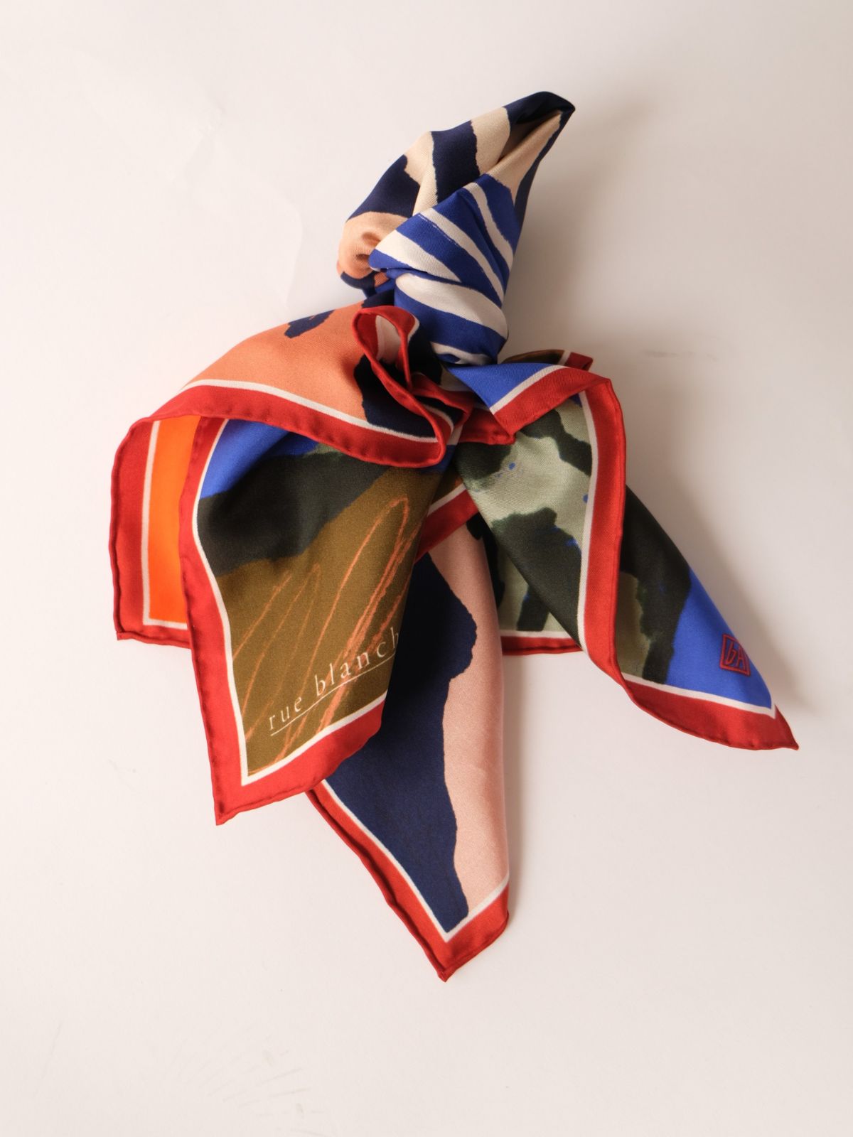 A square silk scarf featuring a vivid landscape painted by artist Gaëlle de Laveleye. In this third collaboration, her composition blends deep, warm and bright colours. A flowing royal blue scarf appears within the scene. The scarf is framed by a bold red border and a rolled rim. Lightweight and soft, this is a timeless piece to return to year after year.