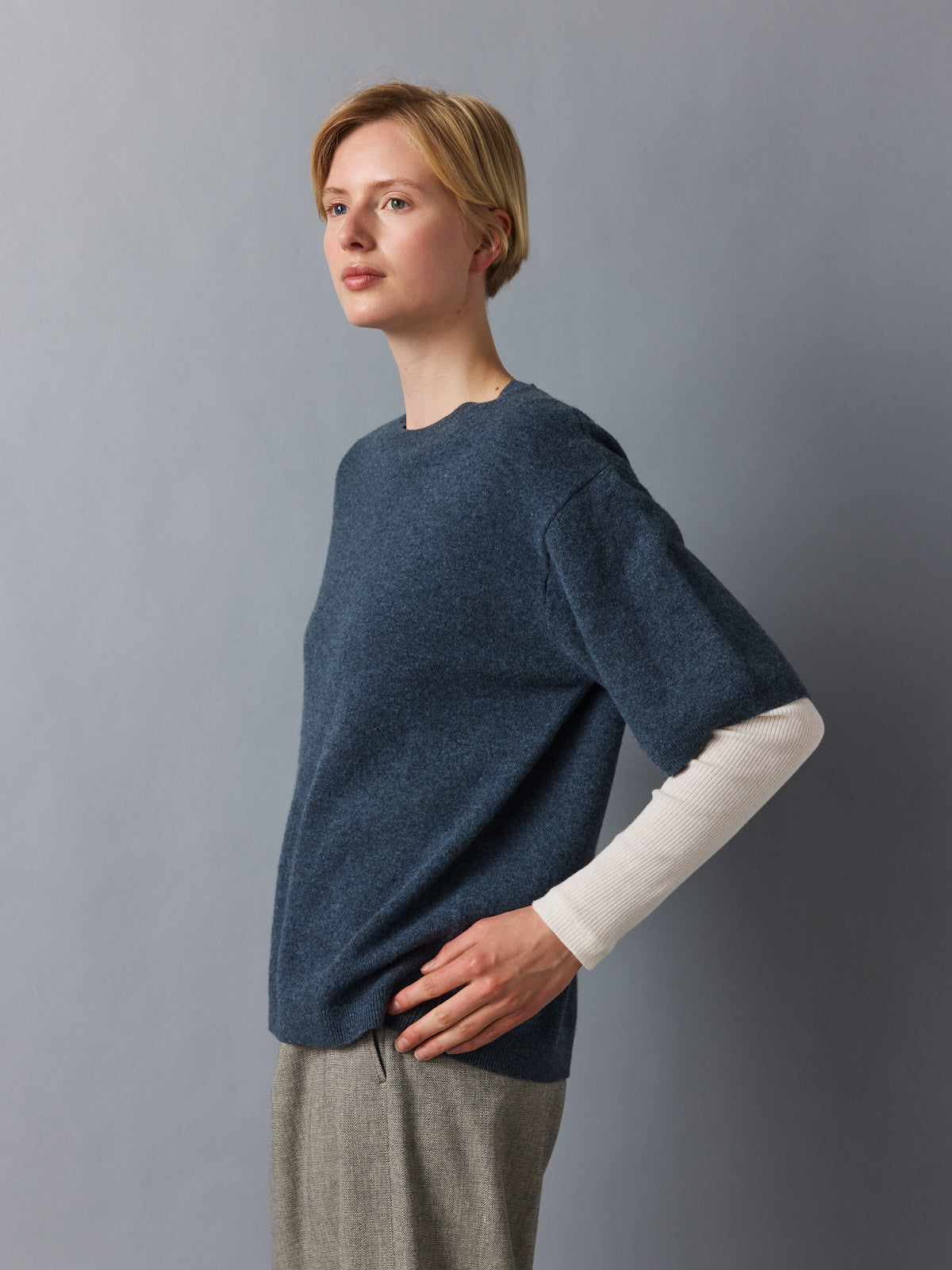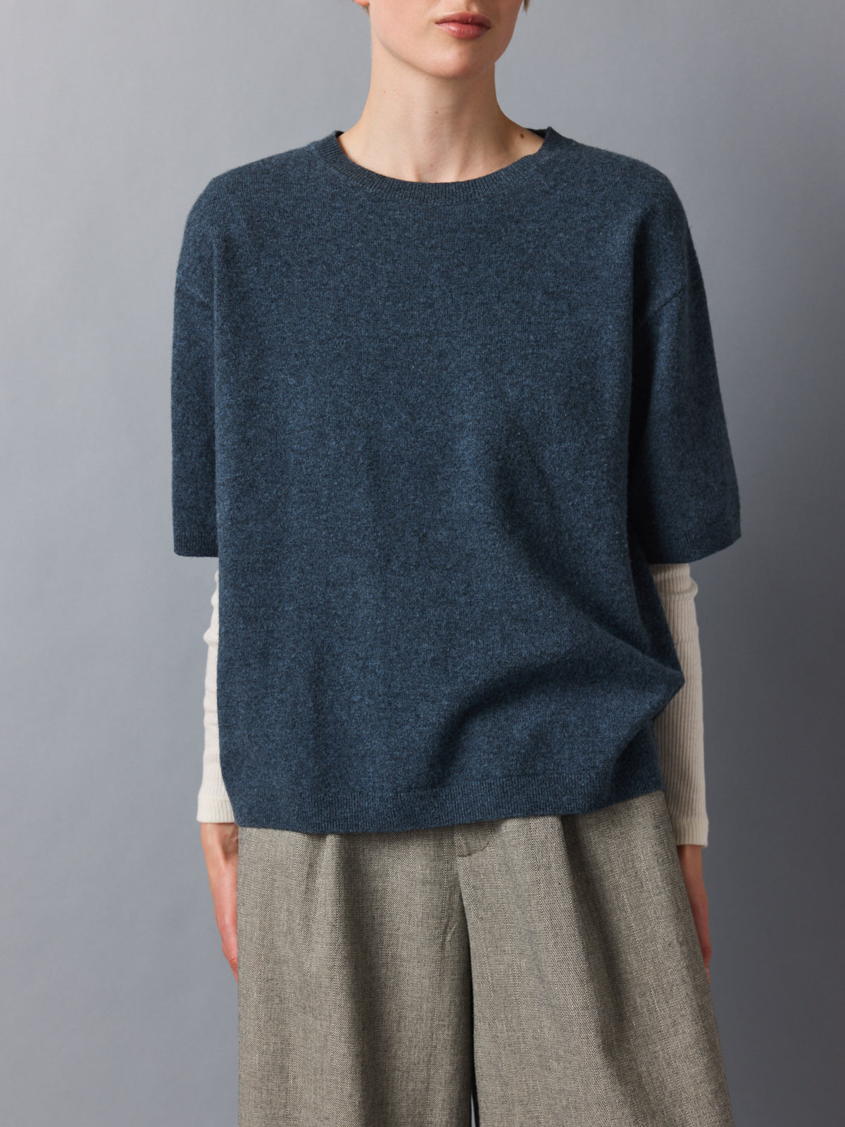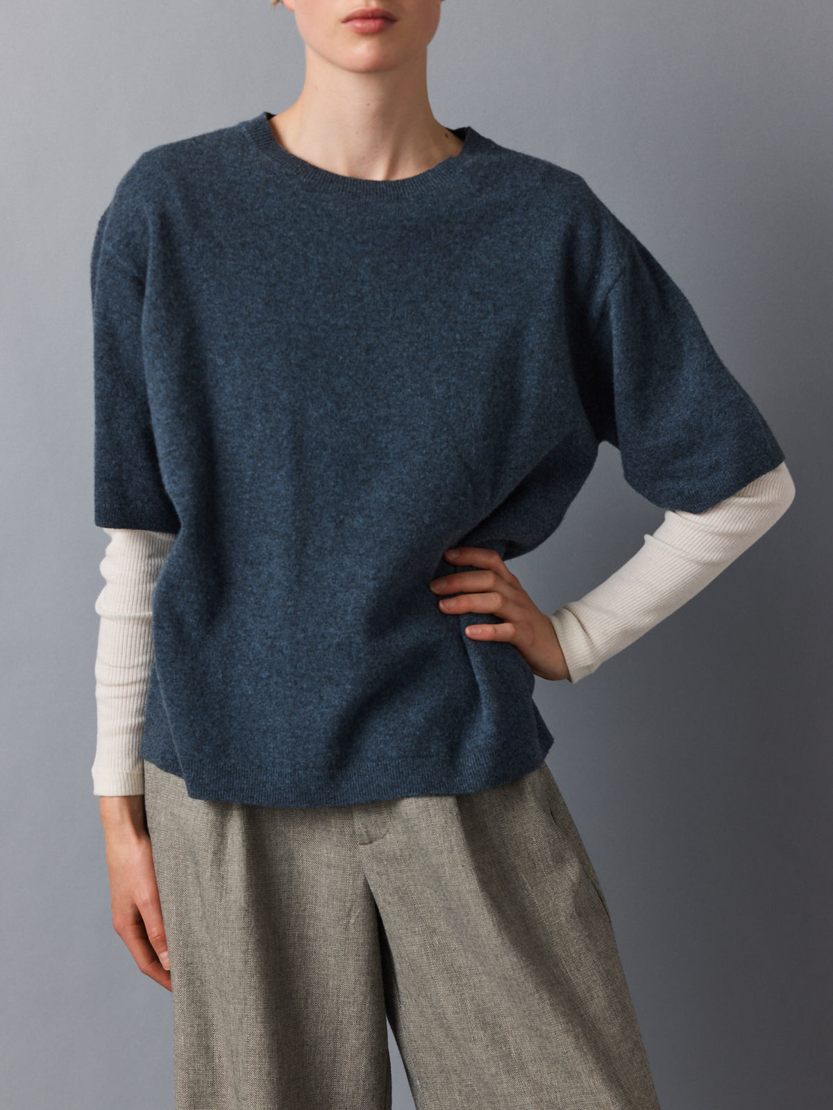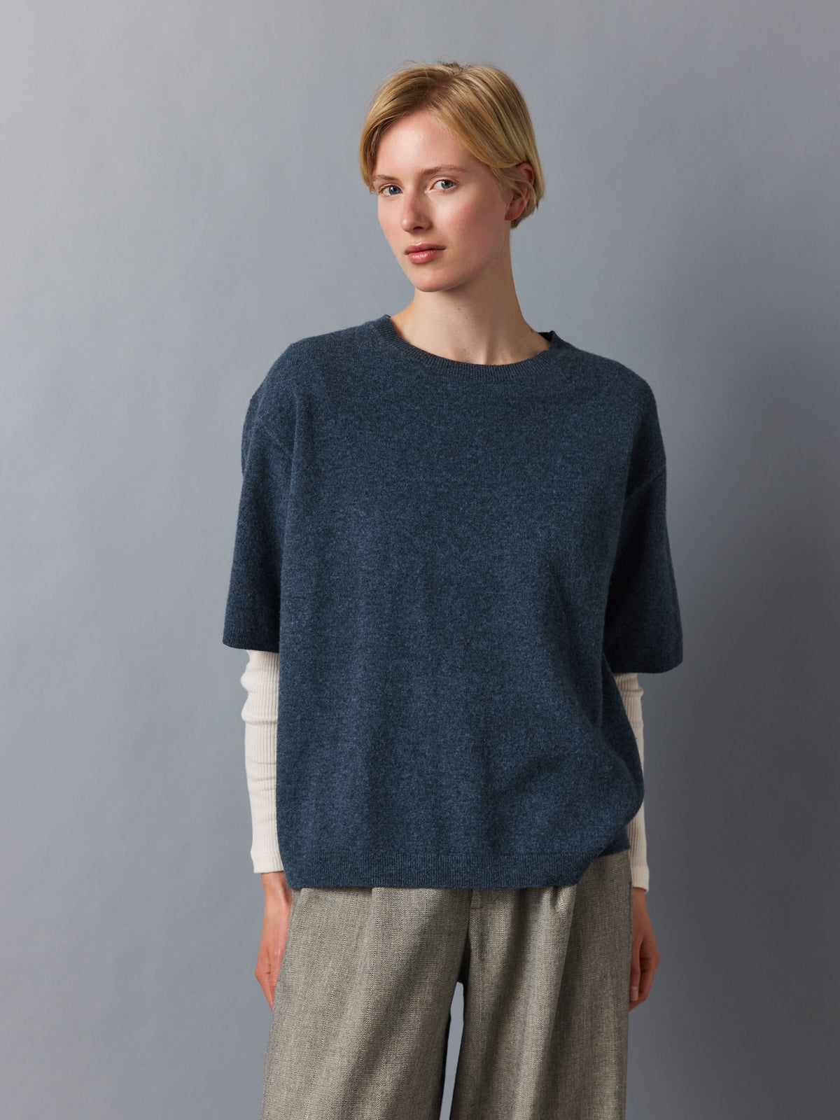 This short-sleeved sweater in subtly mélange river blue is knitted from extrafine merino wool for a soft feel. Featuring a round neckline, dropped shoulders, and a boxy fit with ribbed trims.