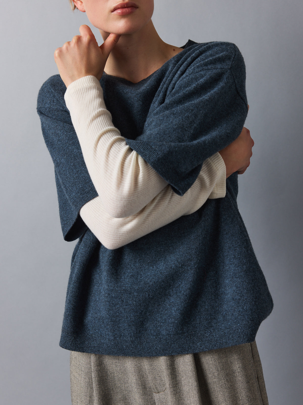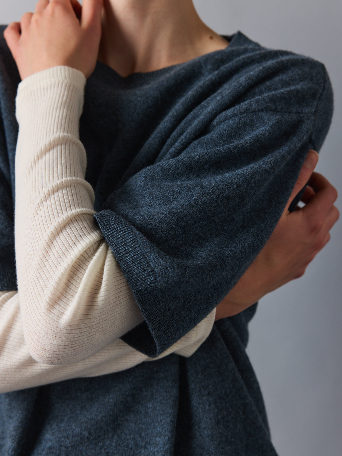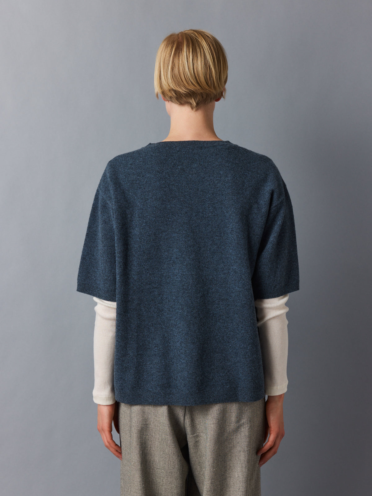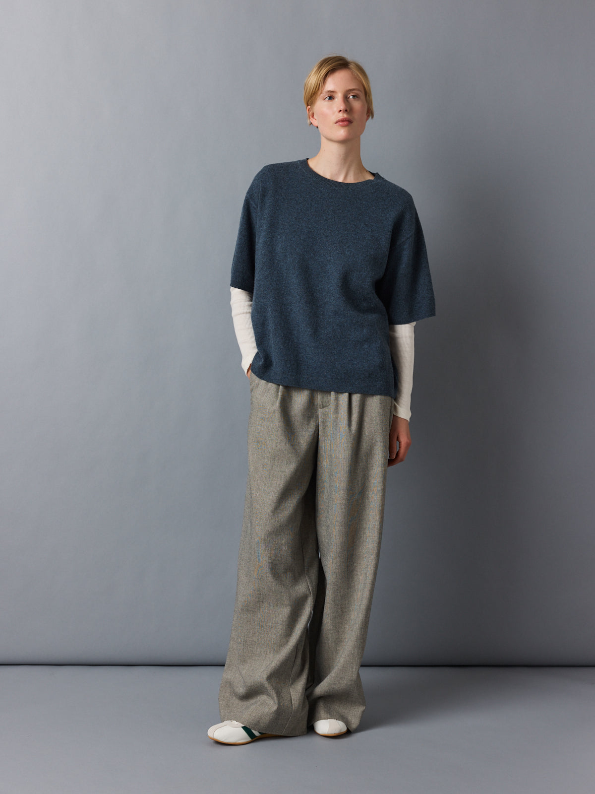 This short-sleeved sweater in subtly mélange river blue is knitted from extrafine merino wool for a soft feel. Featuring a round neckline, dropped shoulders, and a boxy fit with ribbed trims.
