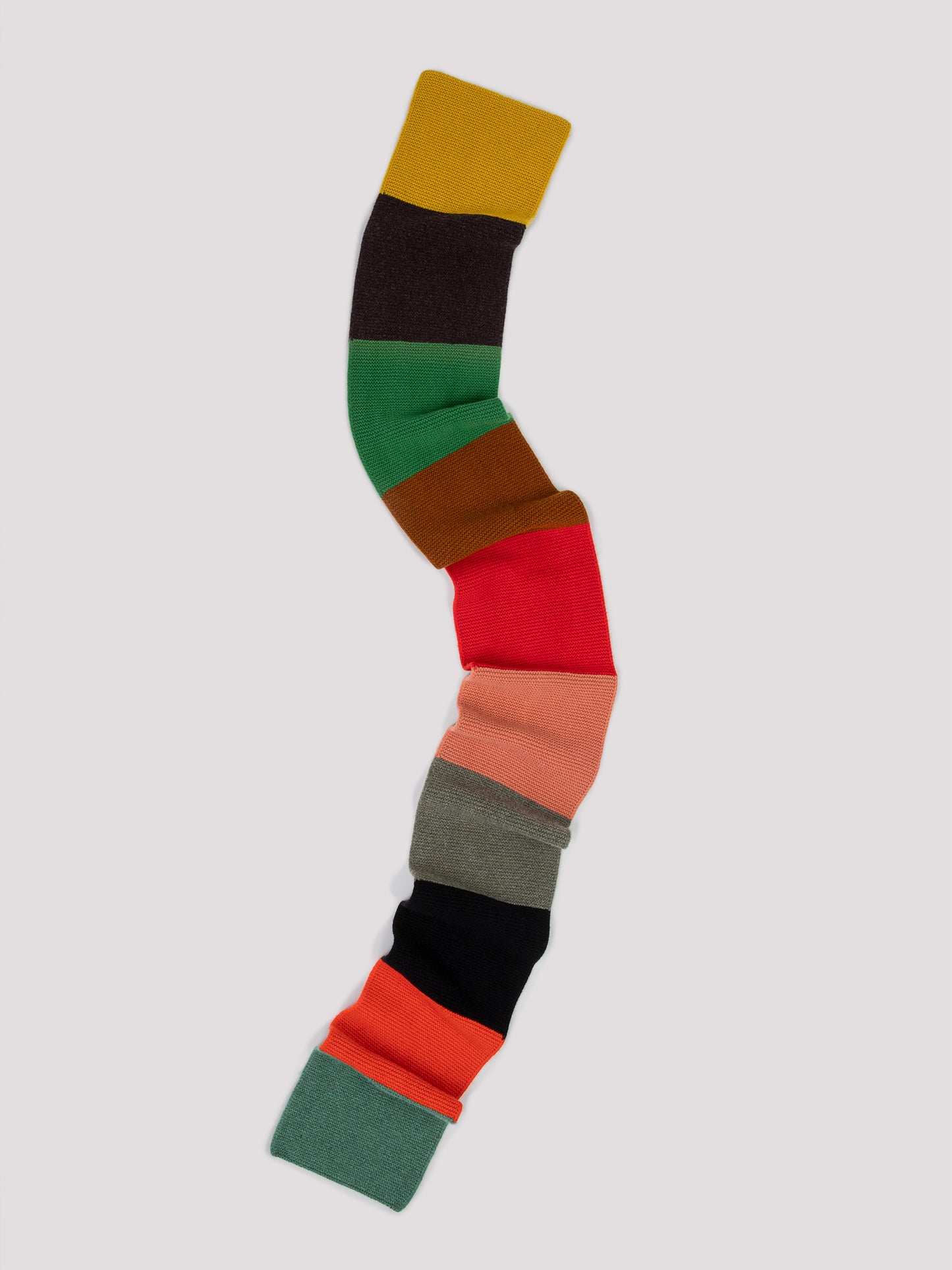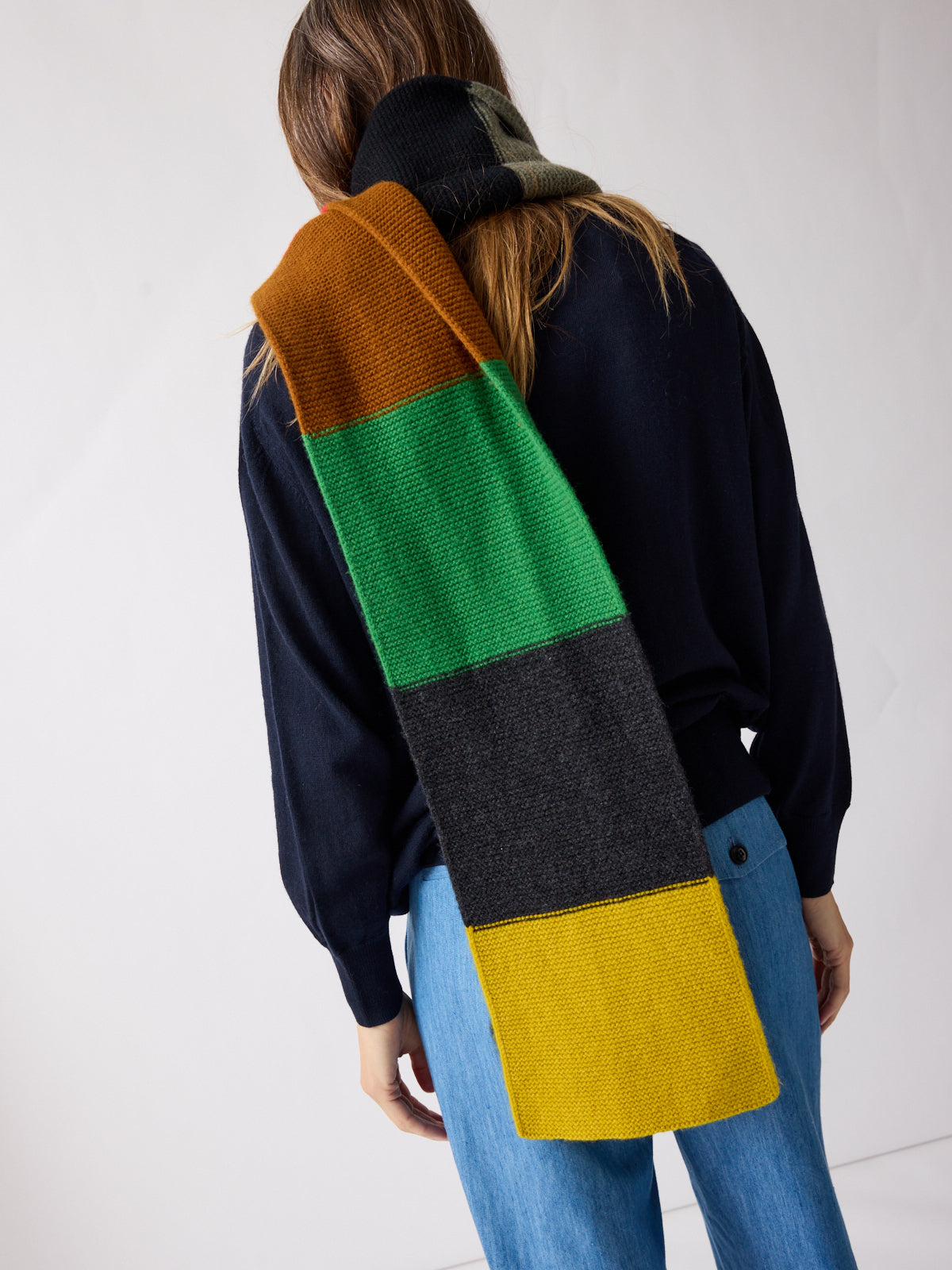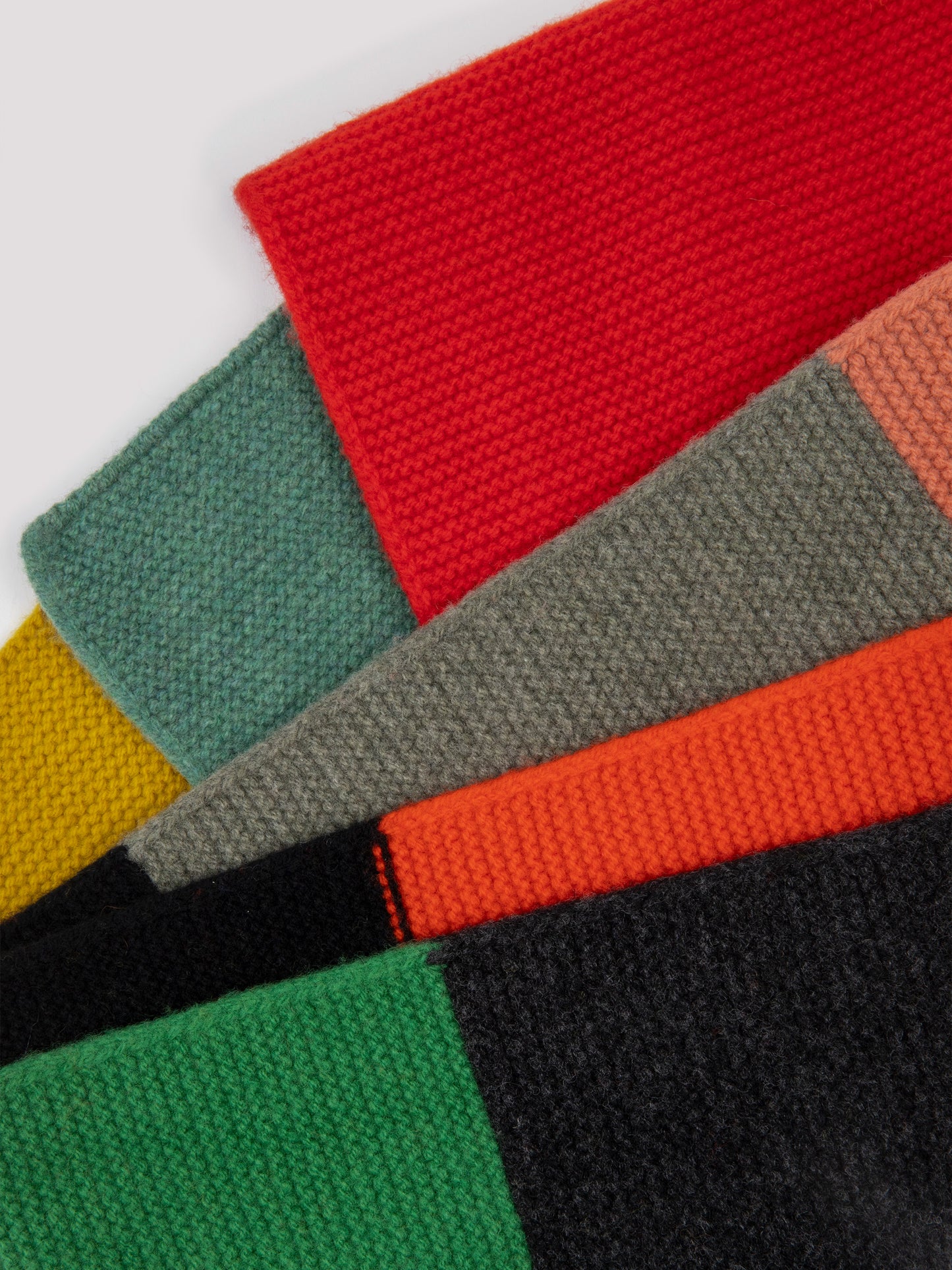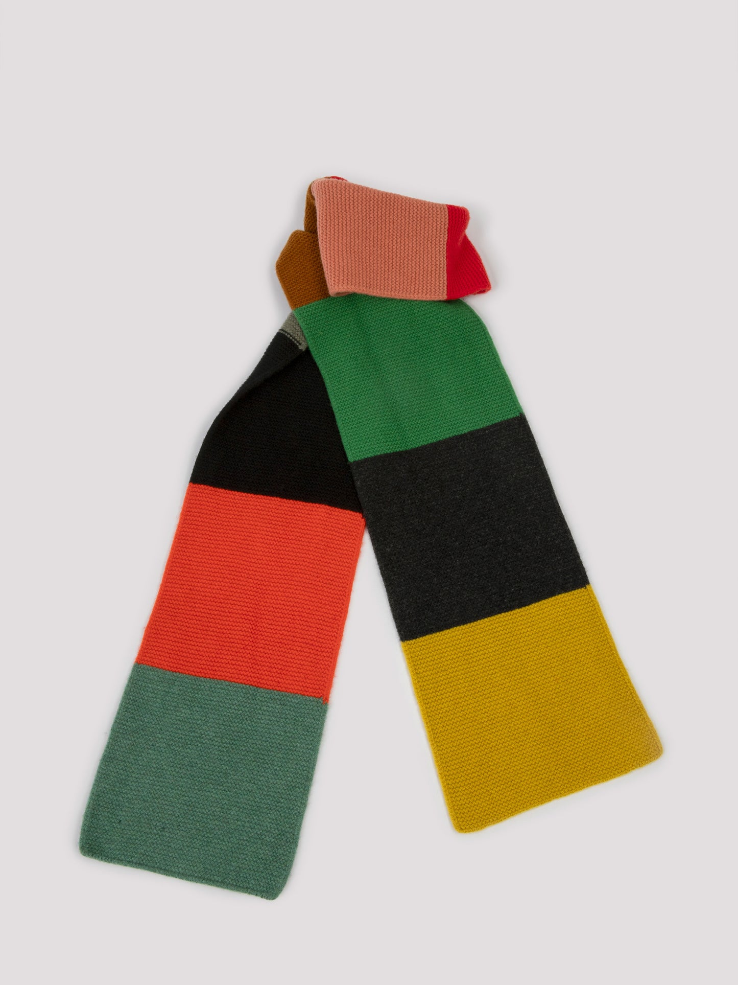 A hand-knit look scarf in ten vibrant blocks of colour. Generously sized to wrap once or twice around the neck, it brings warmth and playful style to your winter wardrobe. Made in southwest Scotland using traditional techniques and hand finishing