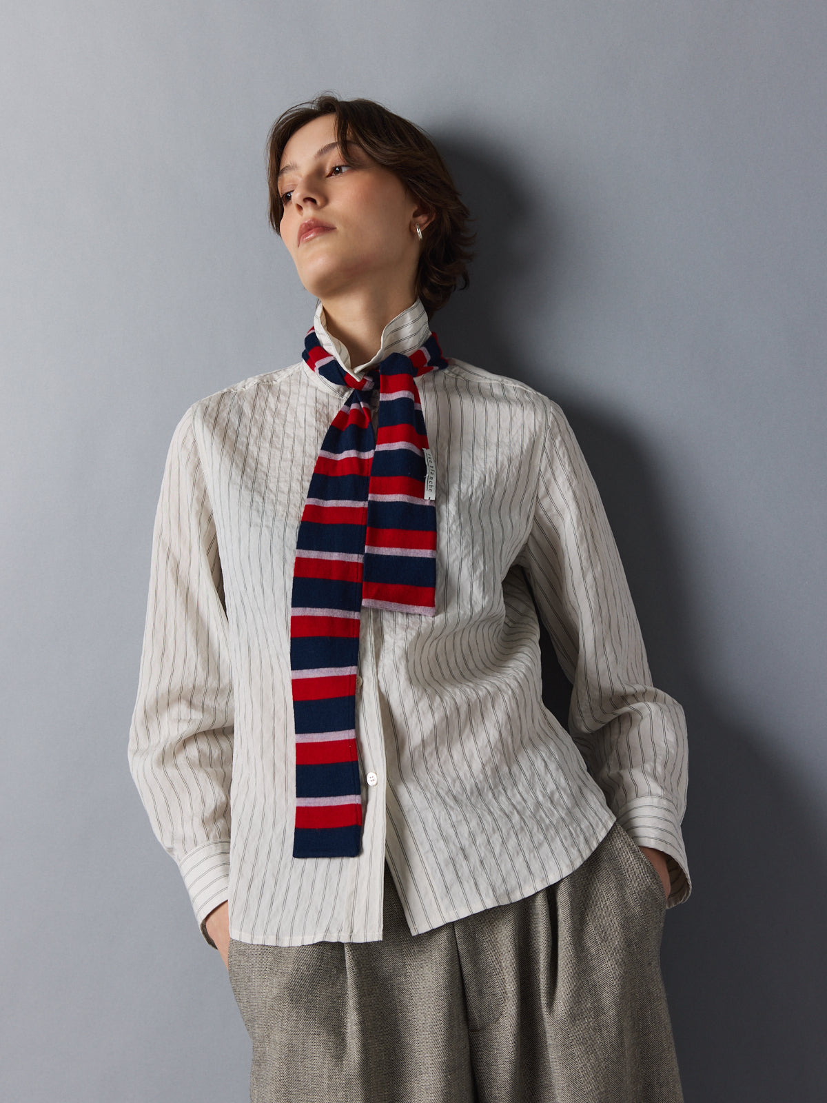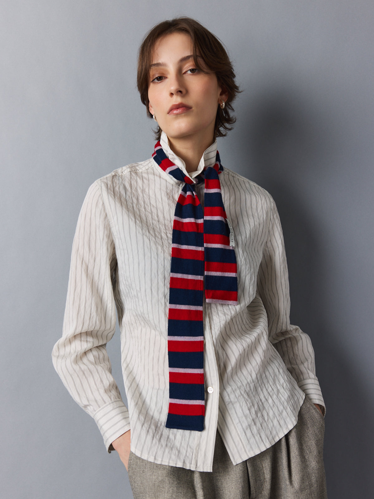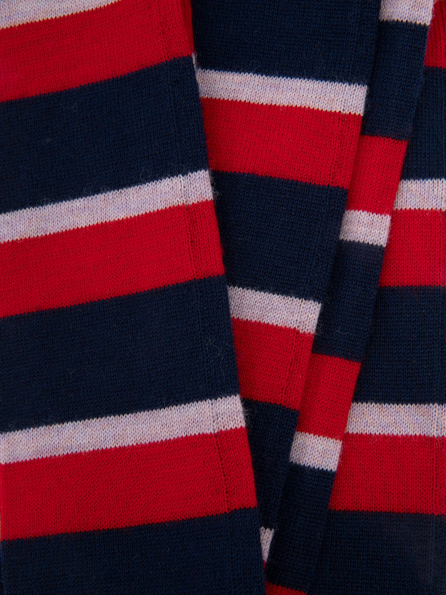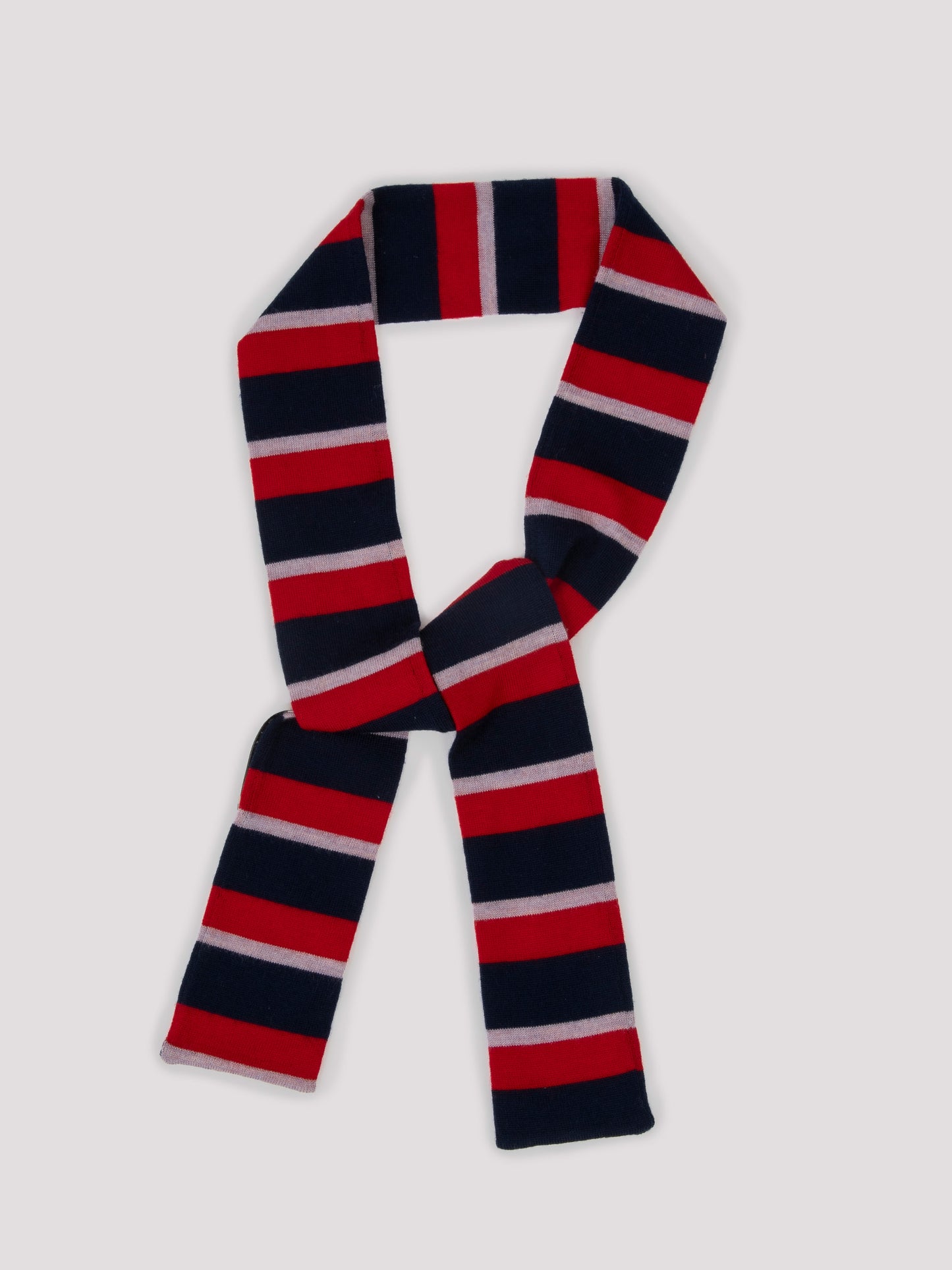 A soft, lightweight scarf that plays with colour and proportion. Knitted in fine merino wool with stripes of navy, pink, and bright red, it brings a vivid accent to your seasonal wardrobe.