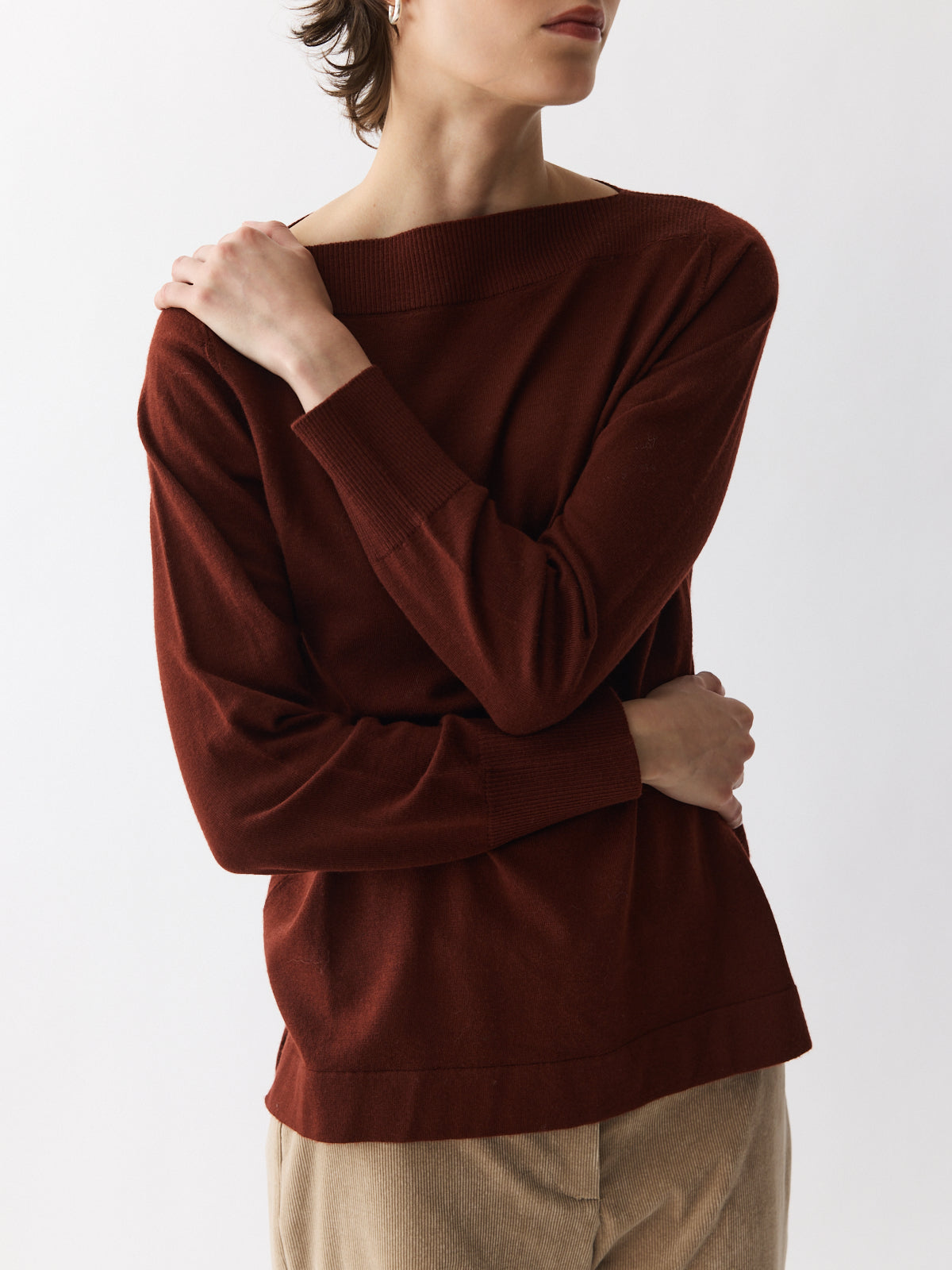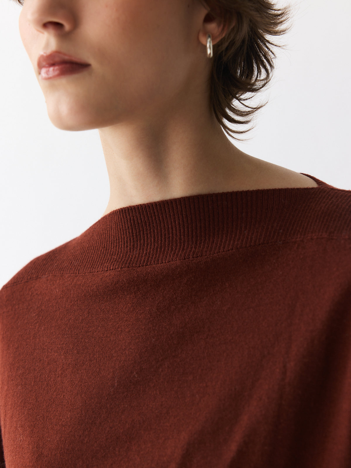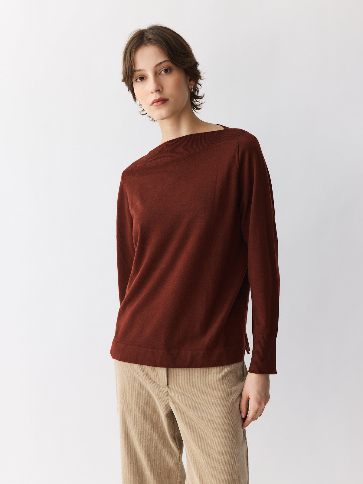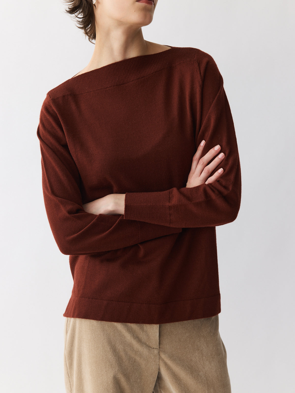 The classic boat neck sweater is redefined in a looser, more relaxed fit with side slits for effortless styling. Crafted from fine brownish bordeaux merino wool, it drapes fluidly with natural softness and lightness.