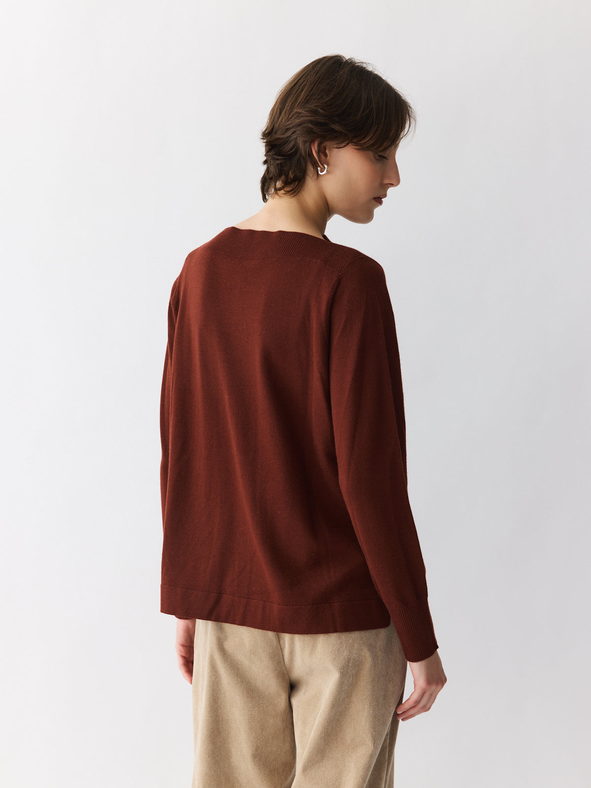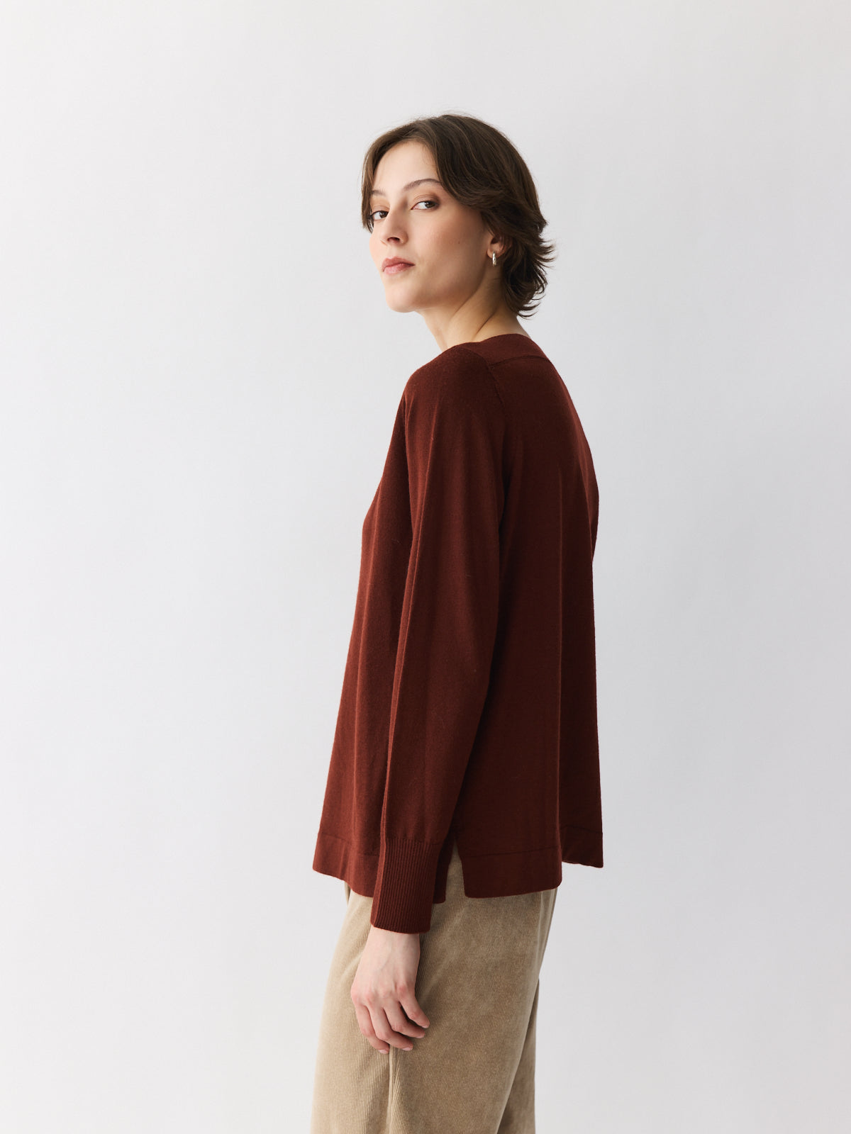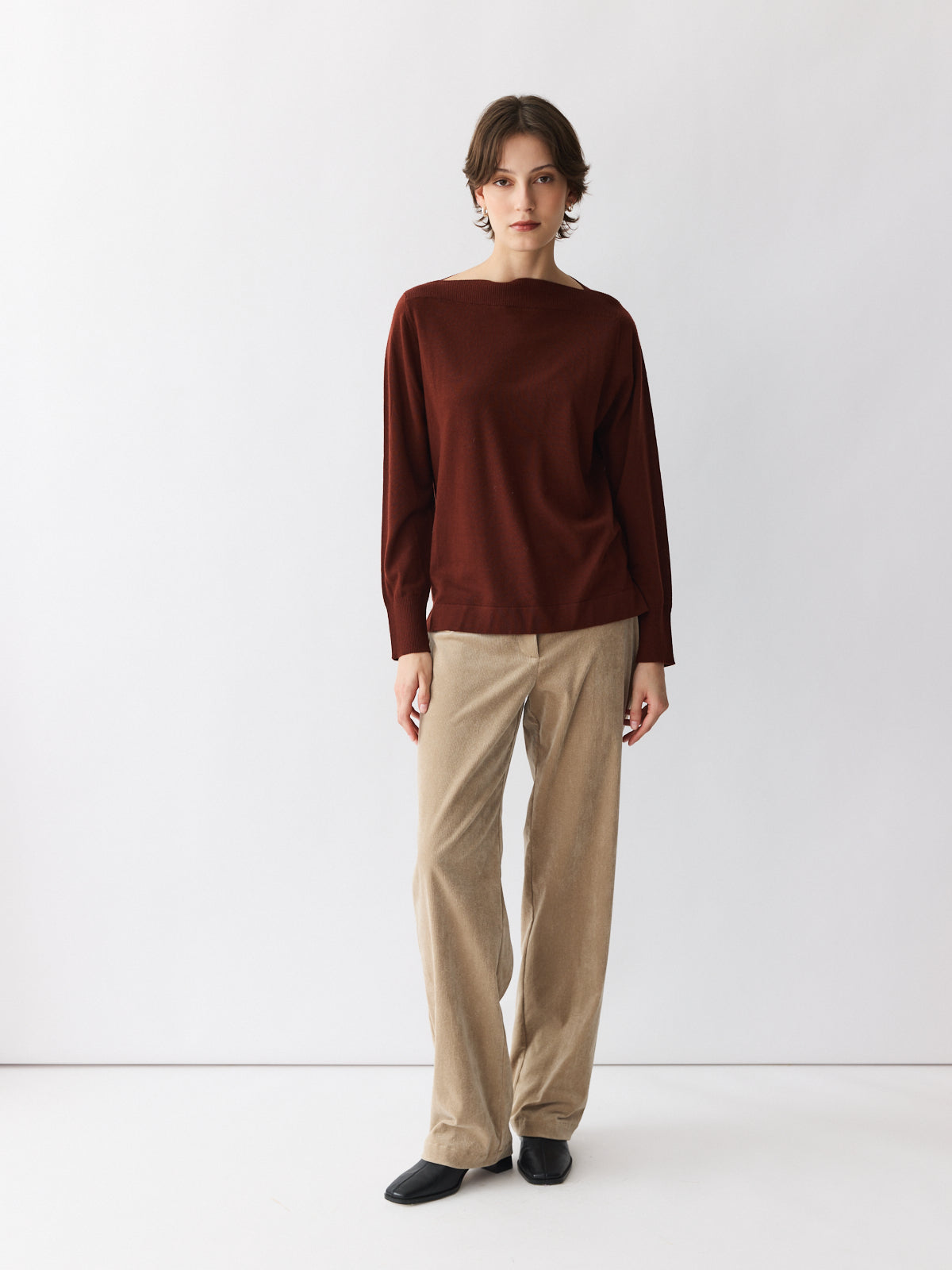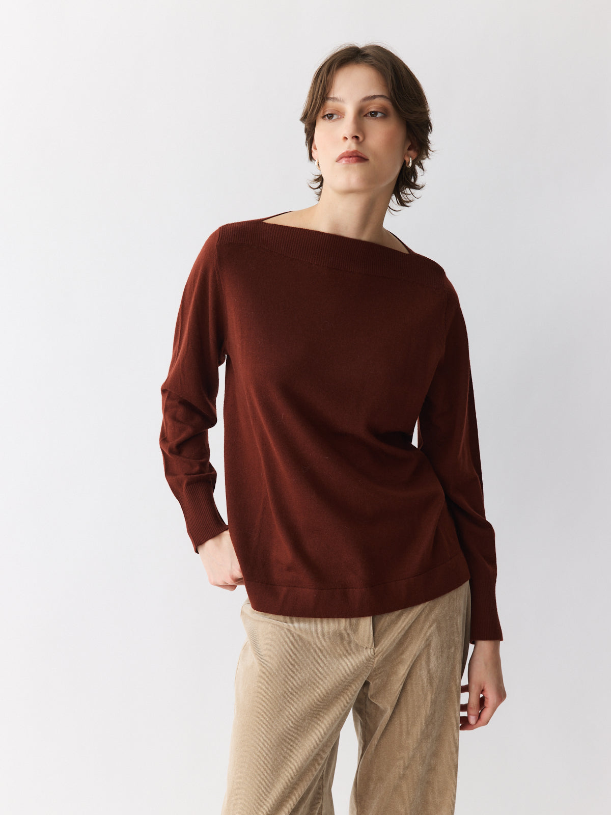 The classic boat neck sweater is redefined in a looser, more relaxed fit with side slits for effortless styling. Crafted from fine brownish bordeaux merino wool, it drapes fluidly with natural softness and lightness.
