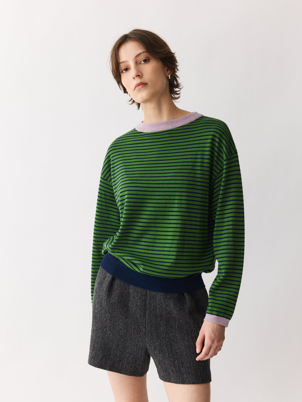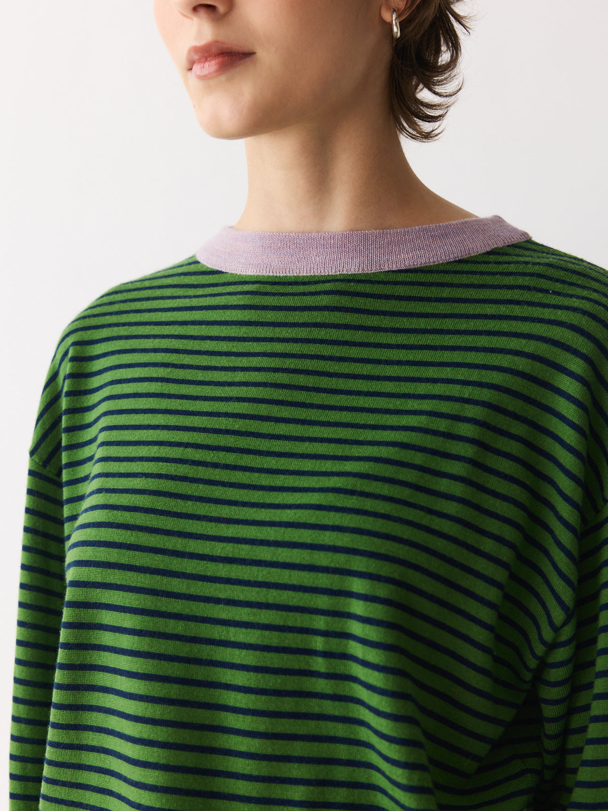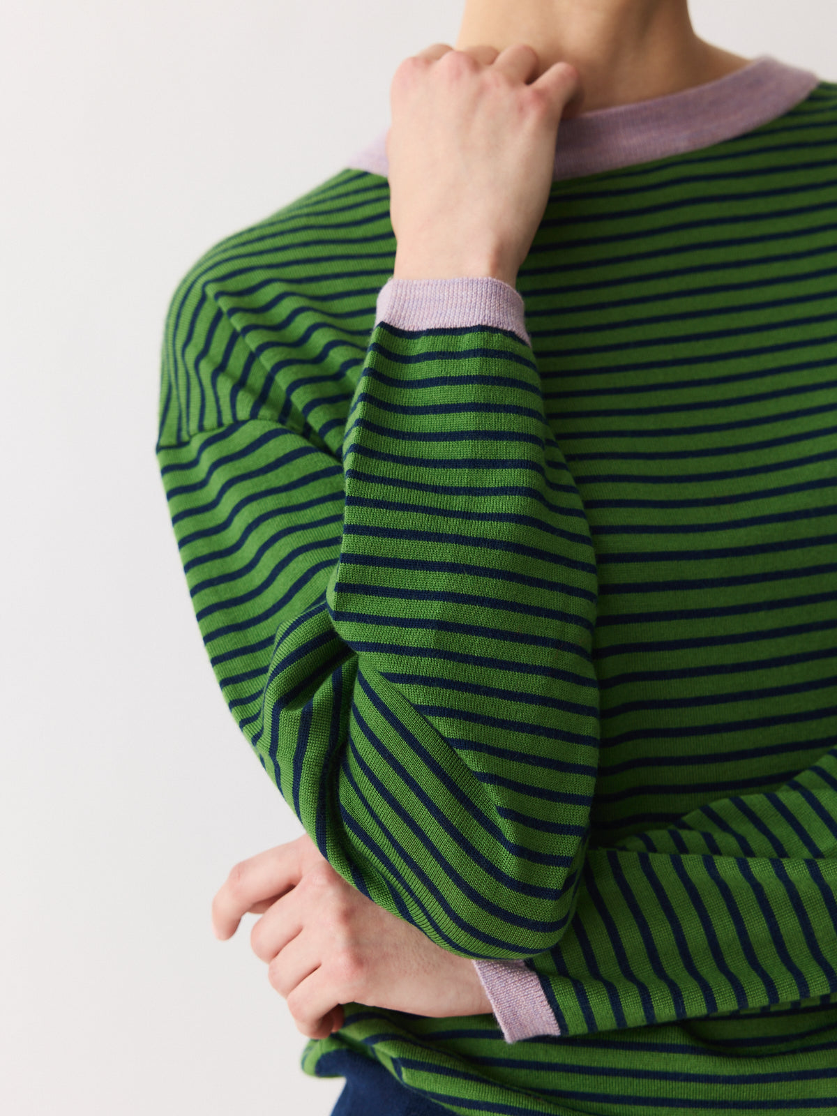 A nod to retro homewear, reimagined in soft merino. This striped sweater blends dark grass green, navy, and mauve in a relaxed silhouette with dropped shoulders and a fitted waistband. Contrasting trims at the collar, cuffs, and hem add a nostalgic charm.
