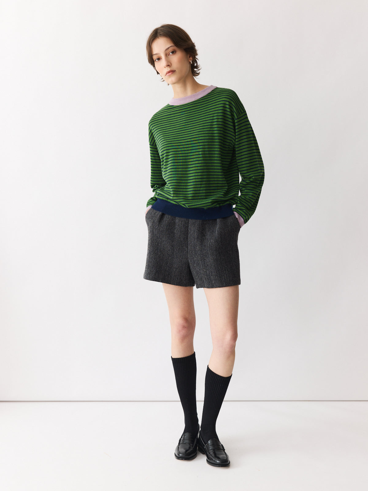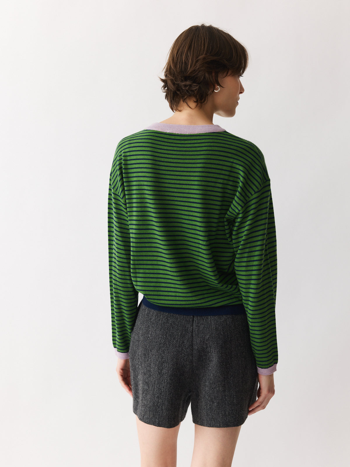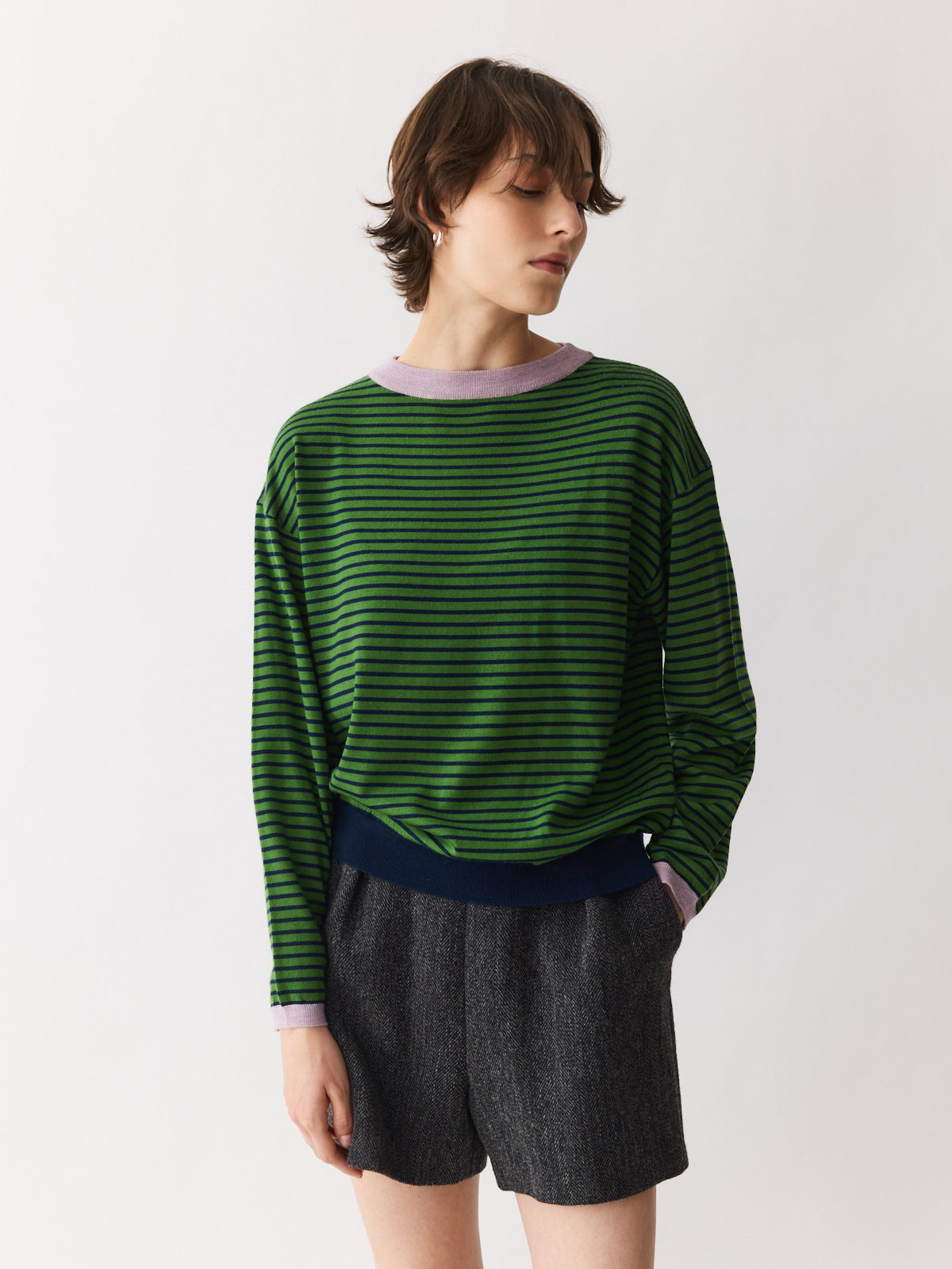 A nod to retro homewear, reimagined in soft merino. This striped sweater blends dark grass green, navy, and mauve in a relaxed silhouette with dropped shoulders and a fitted waistband. Contrasting trims at the collar, cuffs, and hem add a nostalgic charm.