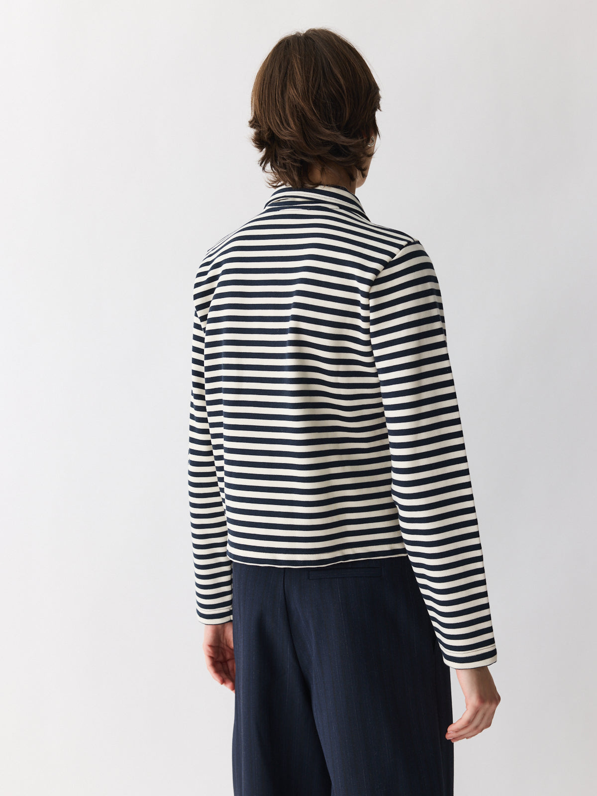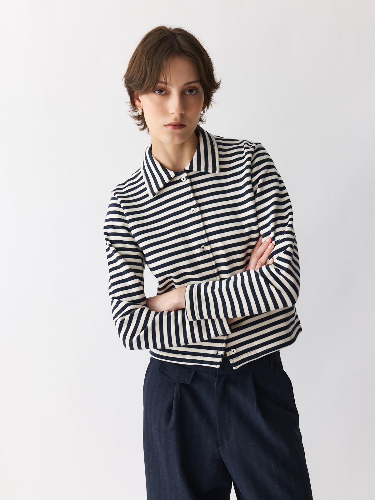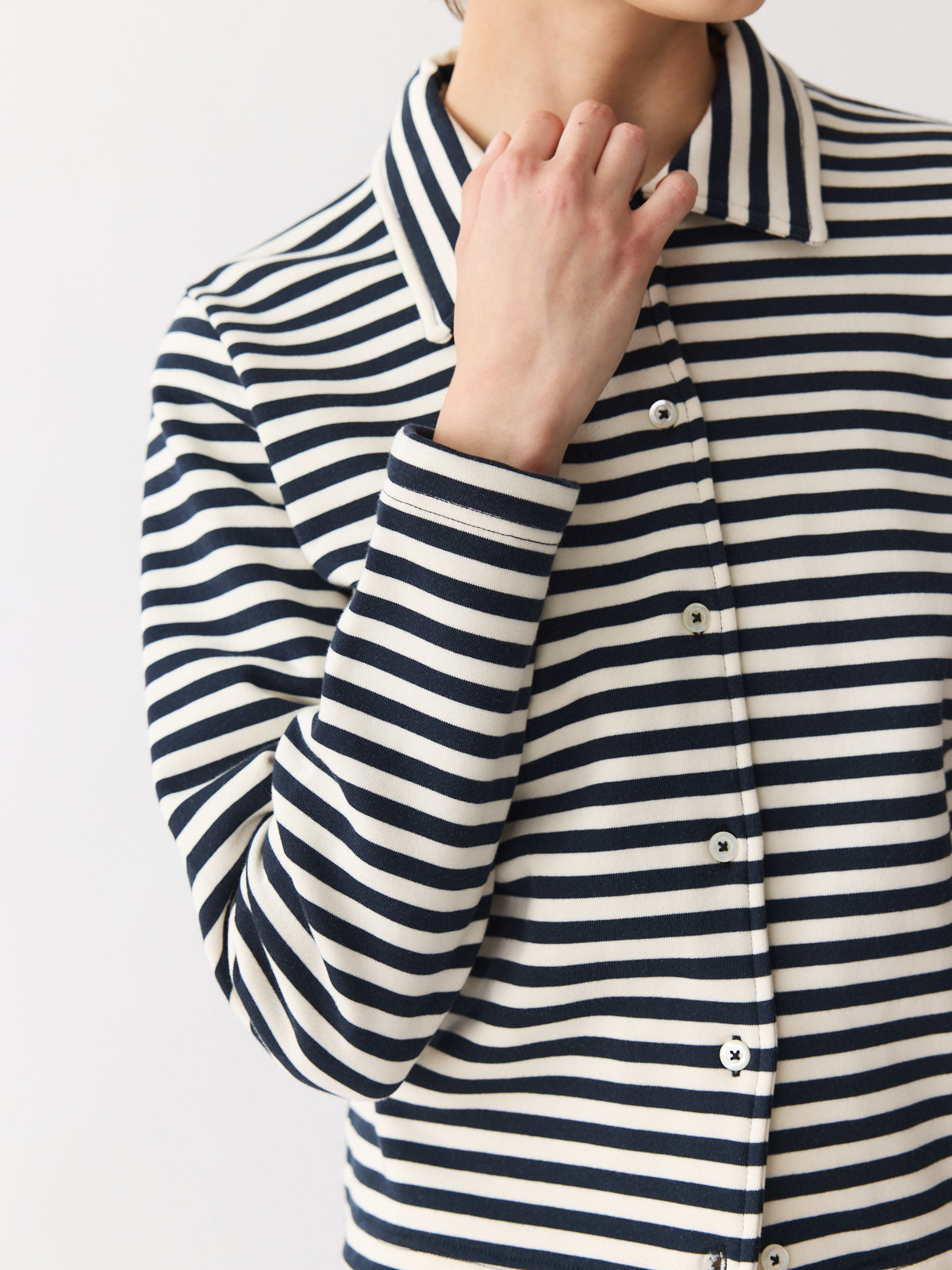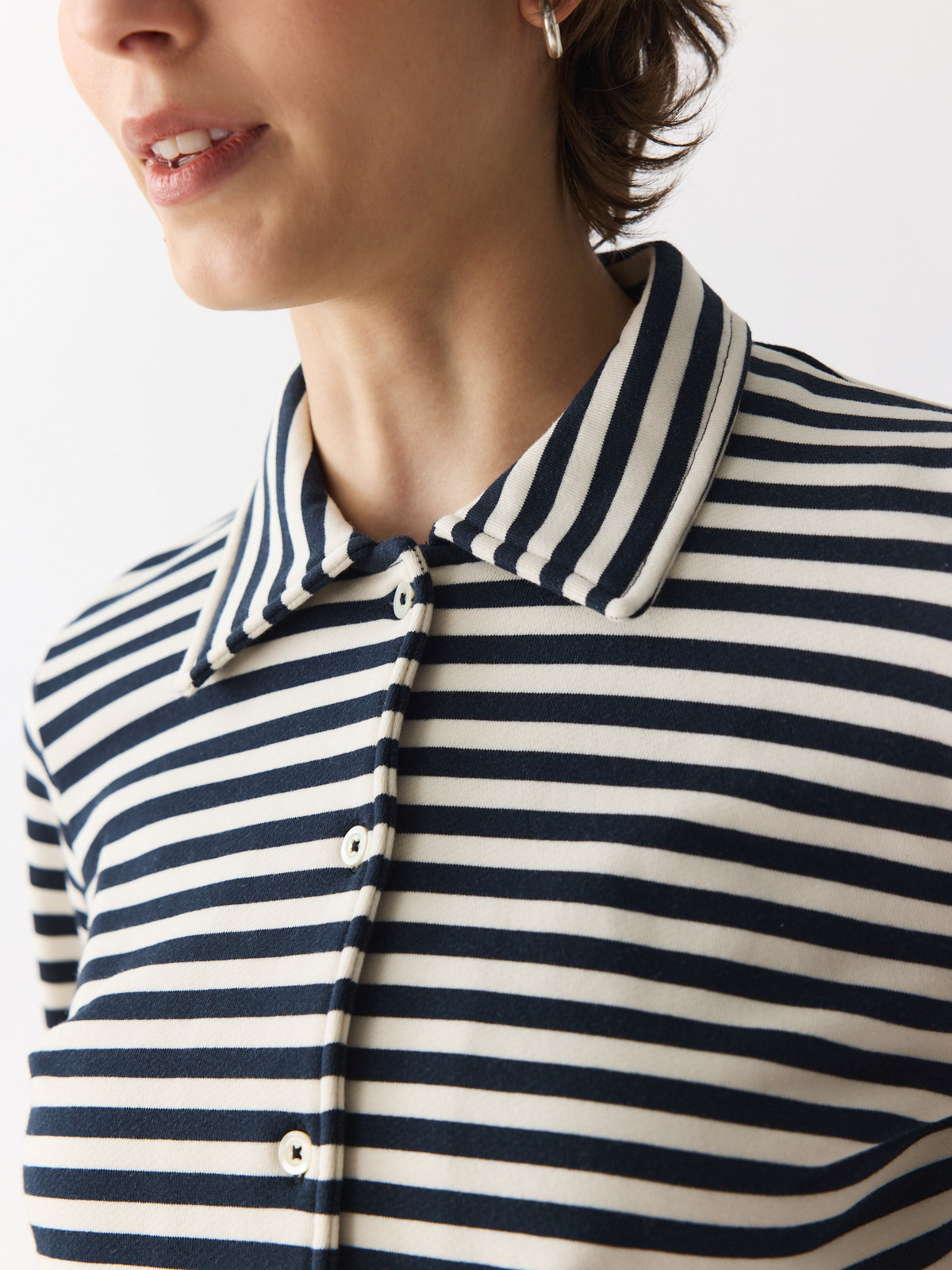 A refined take on the classic polo. This long-sleeved striped shirt pairs a generous collar with a straight fit and dark blue–white stripes in thick organic cotton. The fabric’s structured ease offers a confident silhouette with a clean, graphic rhythm.
