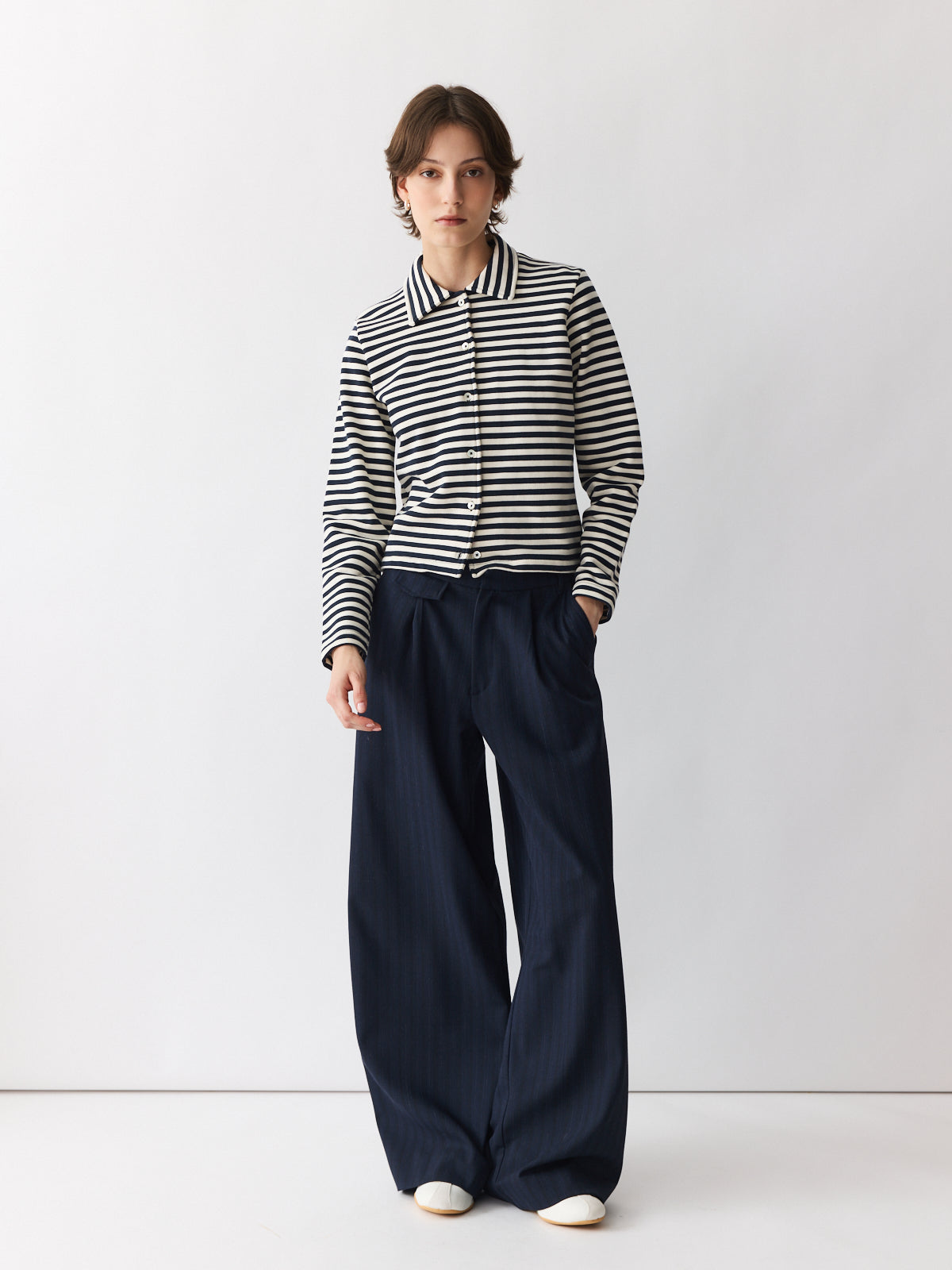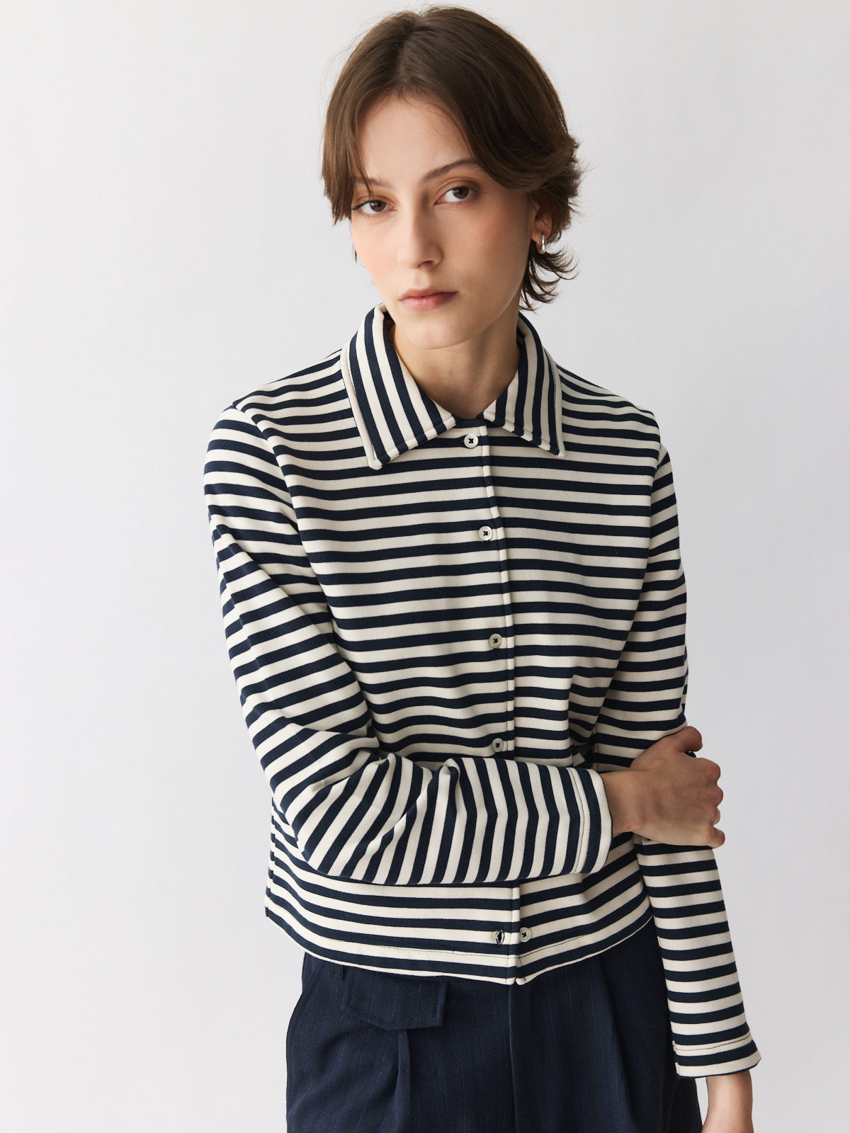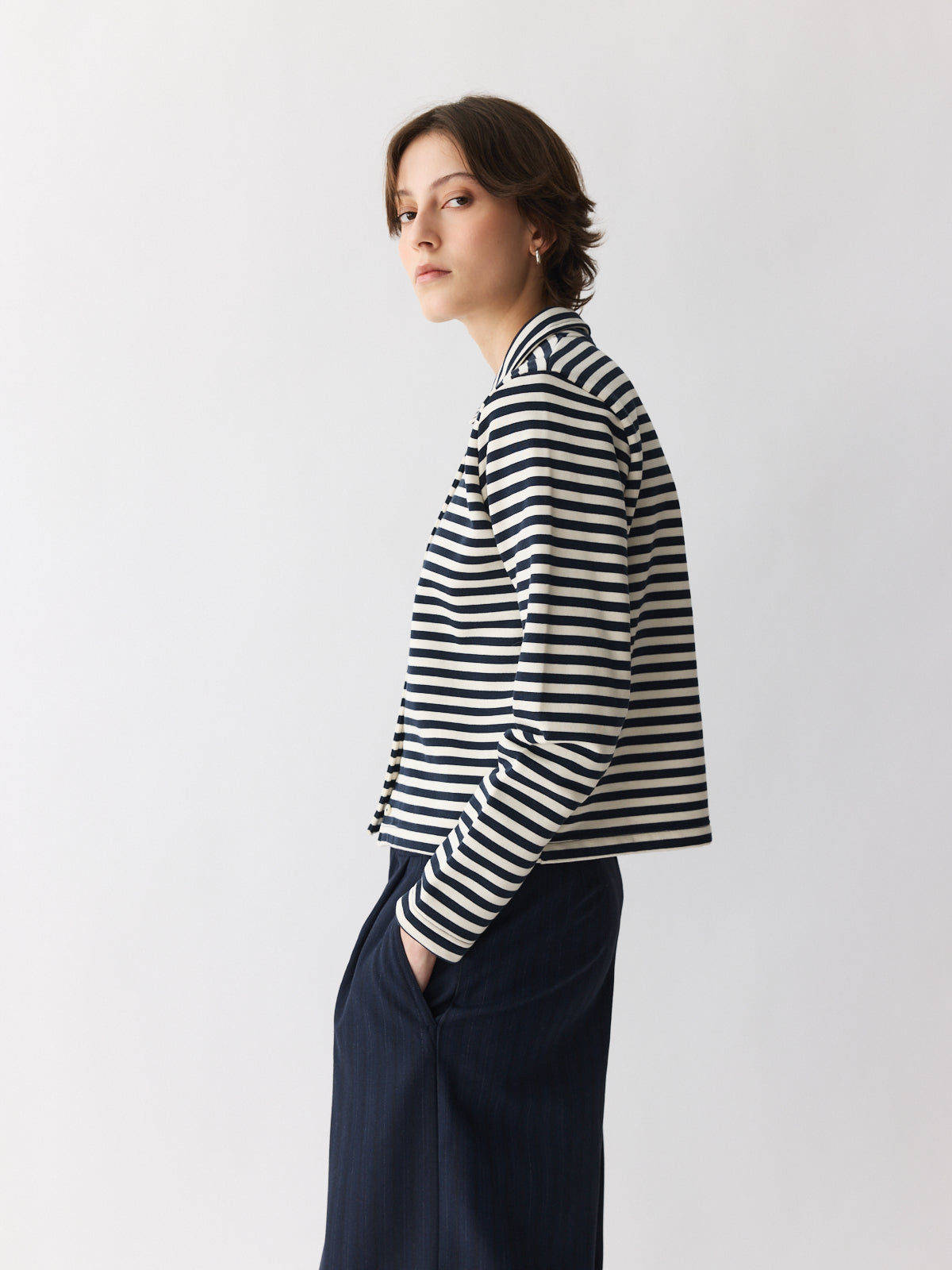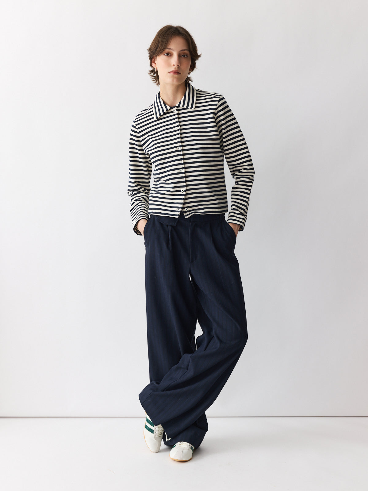 A refined take on the classic polo. This long-sleeved striped shirt pairs a generous collar with a straight fit and dark blue–white stripes in thick organic cotton. The fabric’s structured ease offers a confident silhouette with a clean, graphic rhythm.