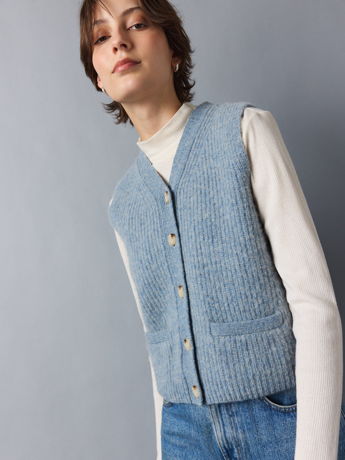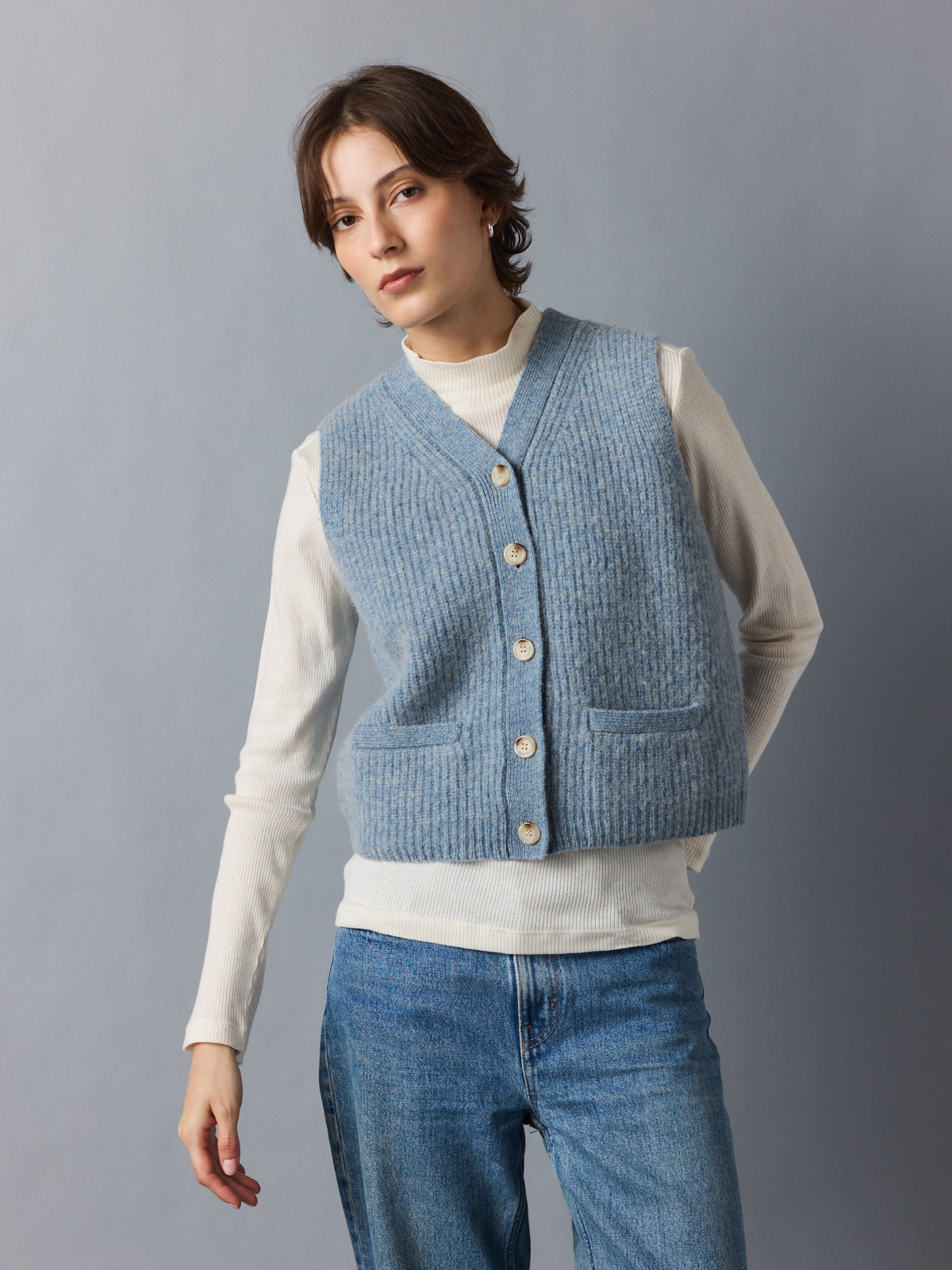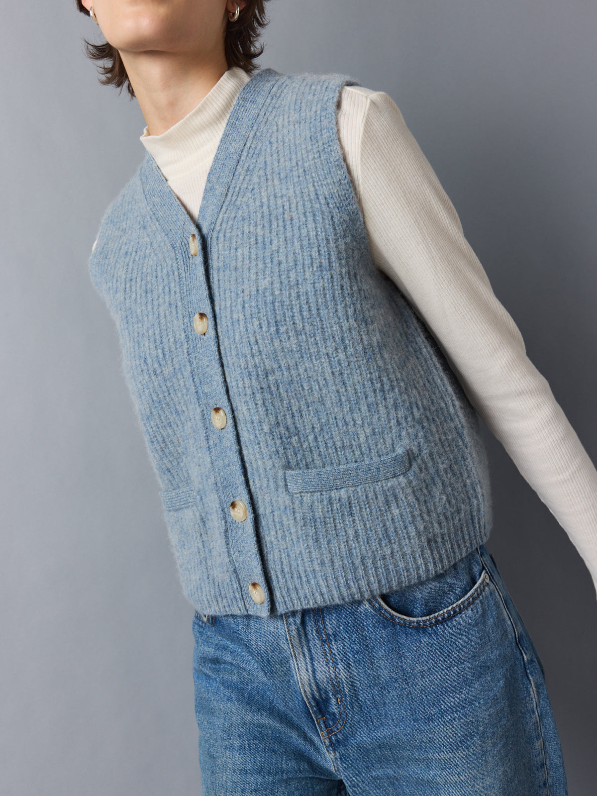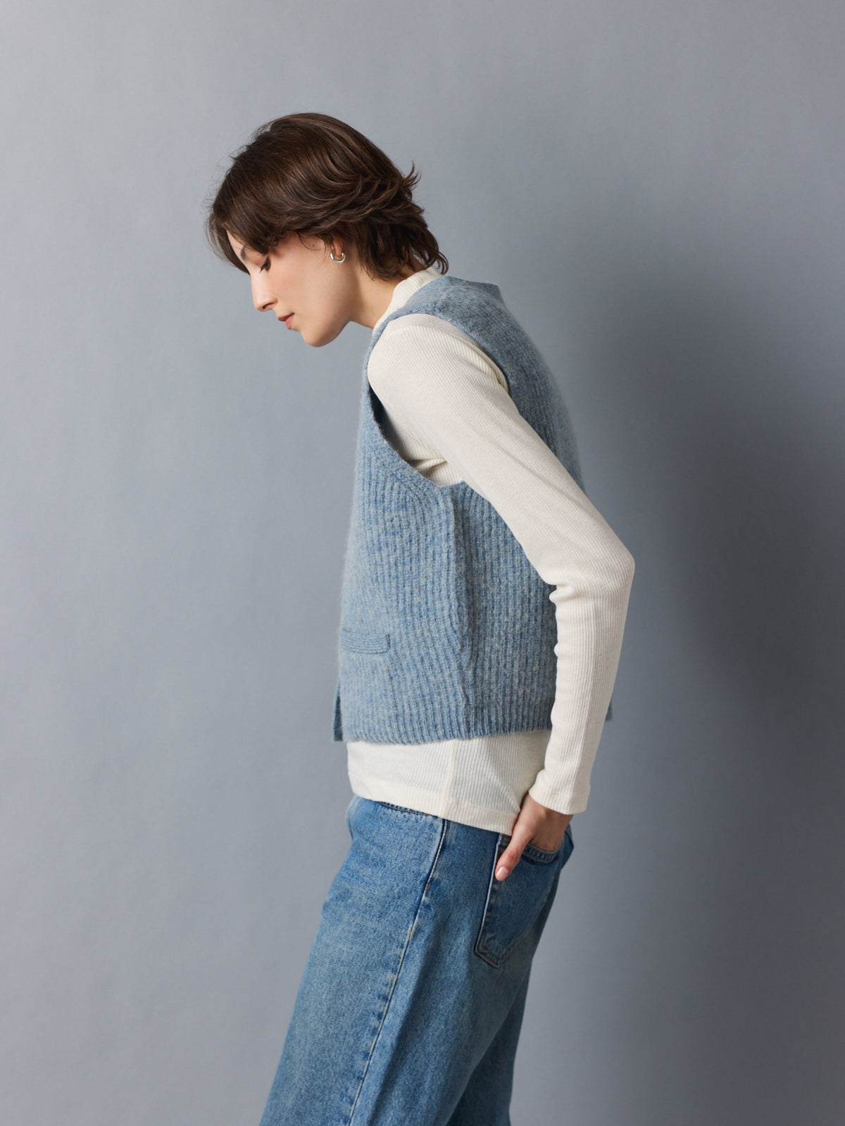 A charming layering piece in muted sky blue, this cropped gilet stands out with its playful proportions and thoughtful textures. Knitted in boiled pure wool for warmth and structure, it features contrasting rib details at the placket and patch pockets. Pair with the matching Vien cardigan or beret for a cohesive look.