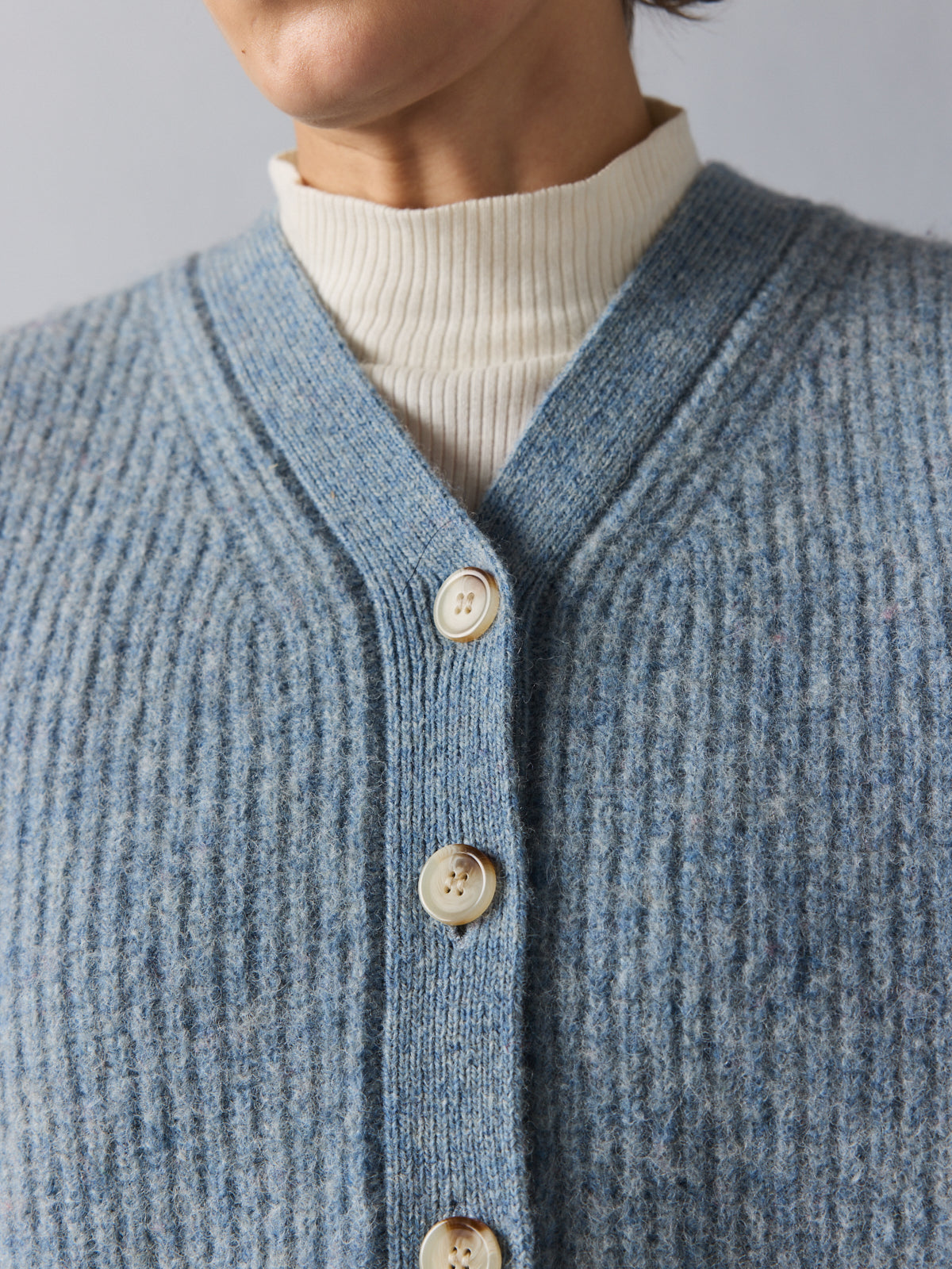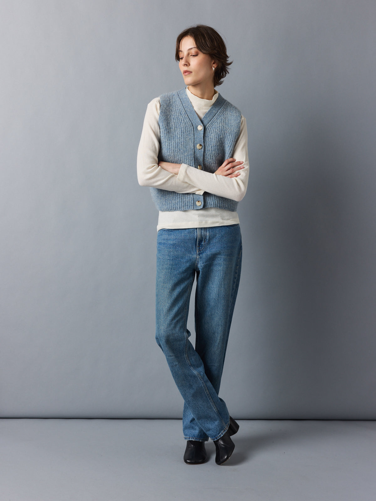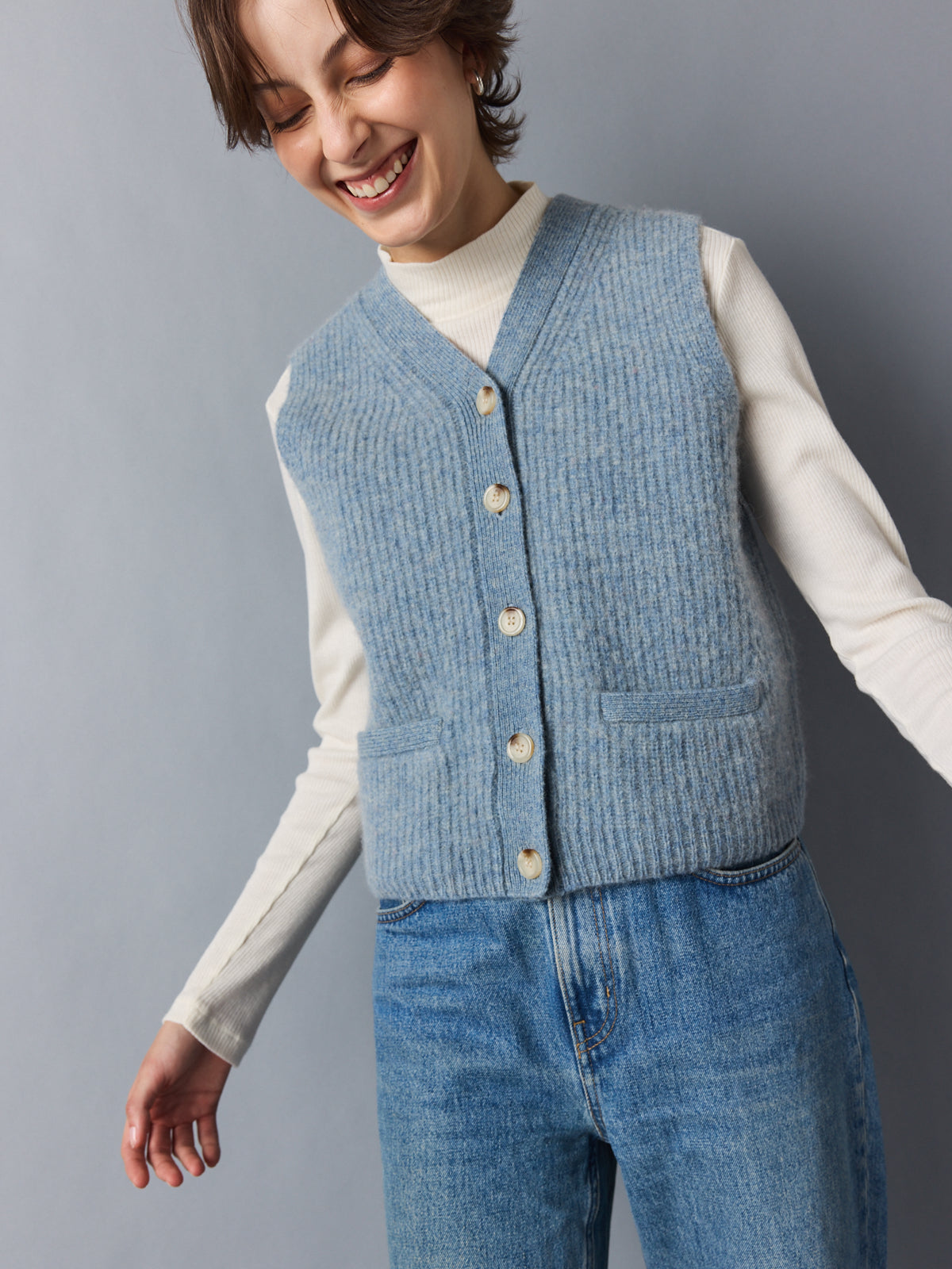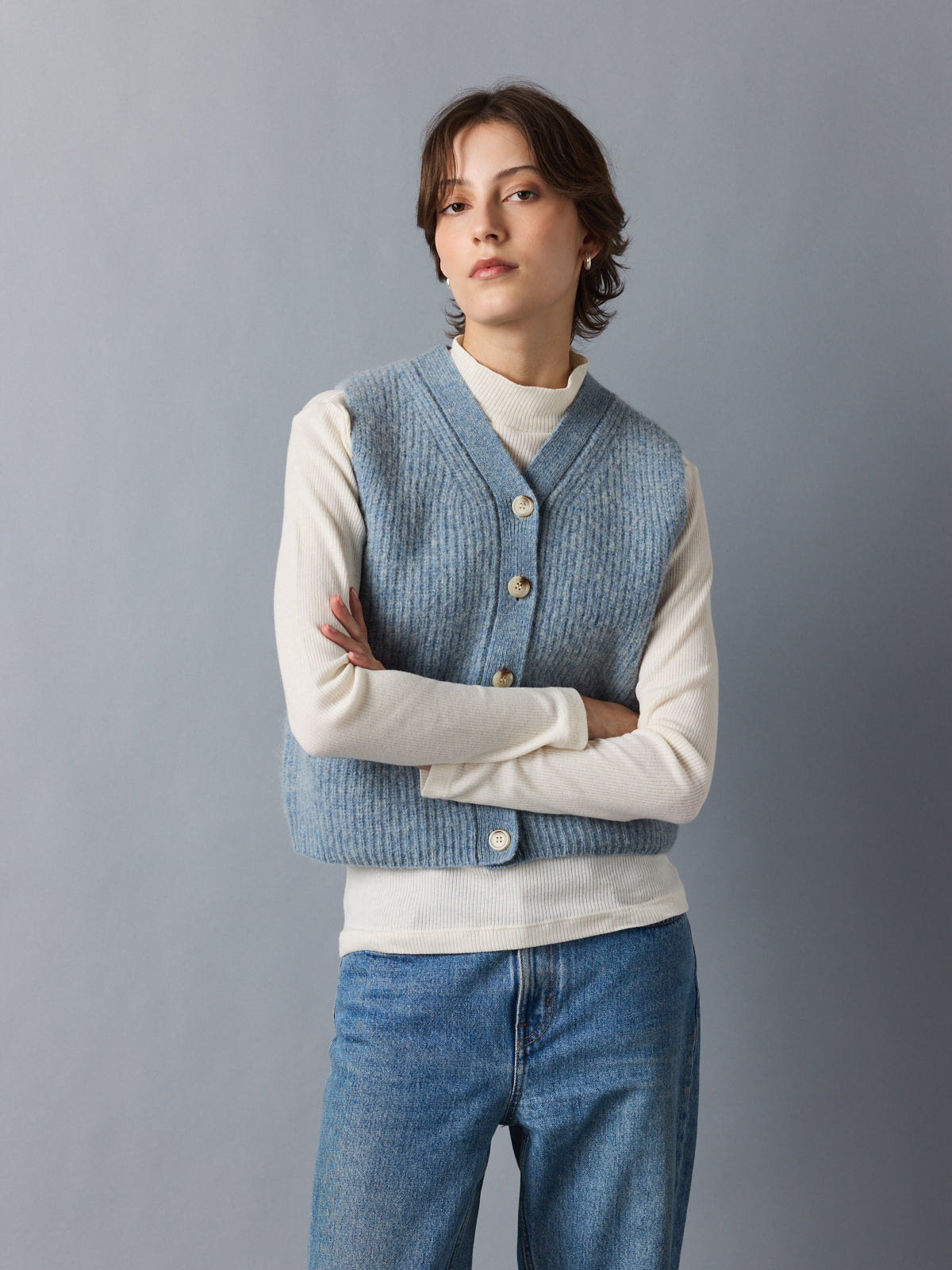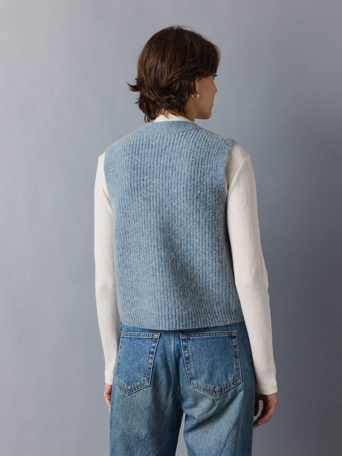 A charming layering piece in muted sky blue, this cropped gilet stands out with its playful proportions and thoughtful textures. Knitted in boiled pure wool for warmth and structure, it features contrasting rib details at the placket and patch pockets. Pair with the matching Vien cardigan or beret for a cohesive look.