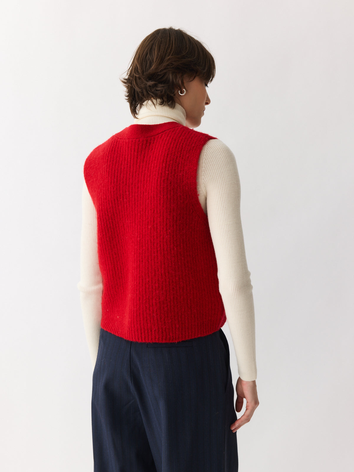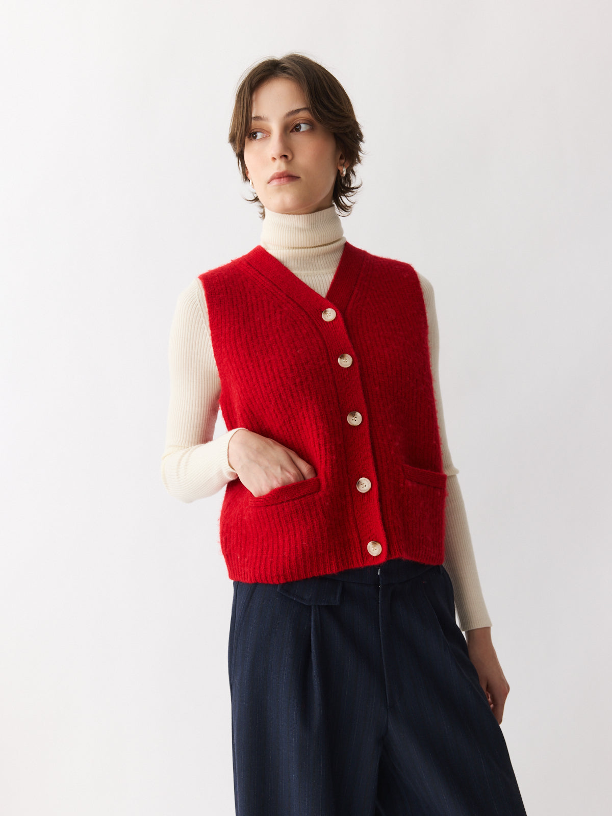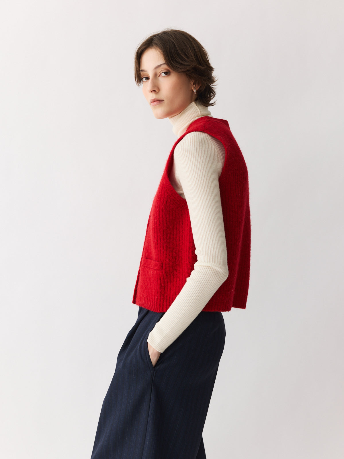 This cropped gilet in bright red brings a cheerful lift to any winter look. Made from gently boiled pure wool with a rich felted texture, it features playful design details like patch pockets and contrasting knit accents. A vibrant layering piece, especially when paired with the matching cardigan or beret.