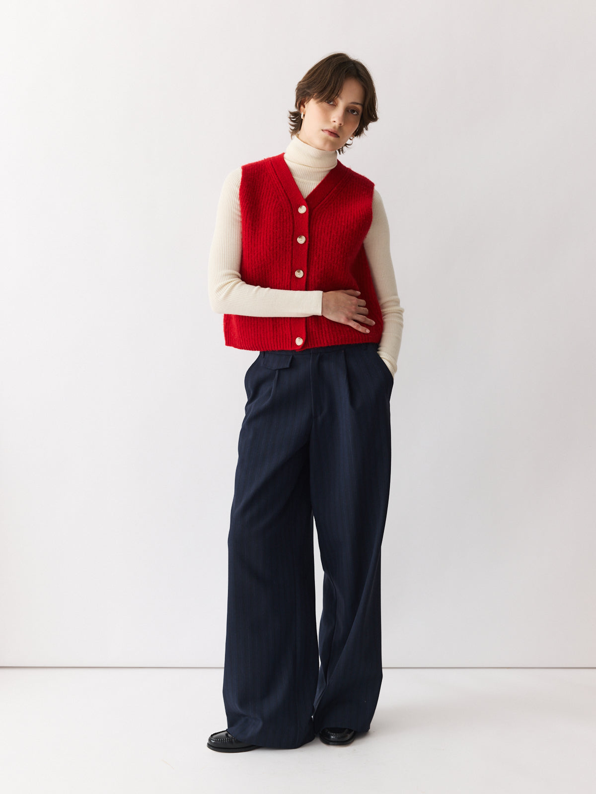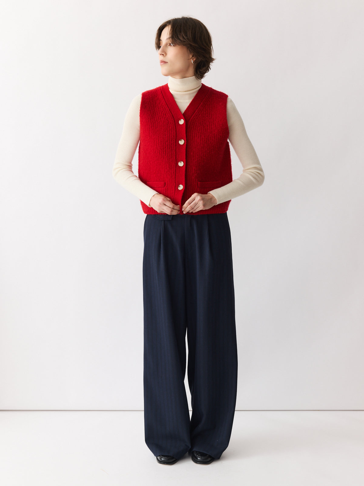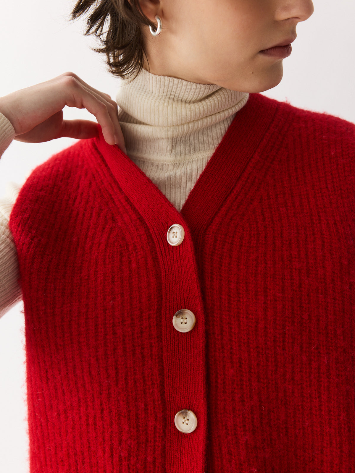 This cropped gilet in bright red brings a cheerful lift to any winter look. Made from gently boiled pure wool with a rich felted texture, it features playful design details like patch pockets and contrasting knit accents. A vibrant layering piece, especially when paired with the matching cardigan or beret.