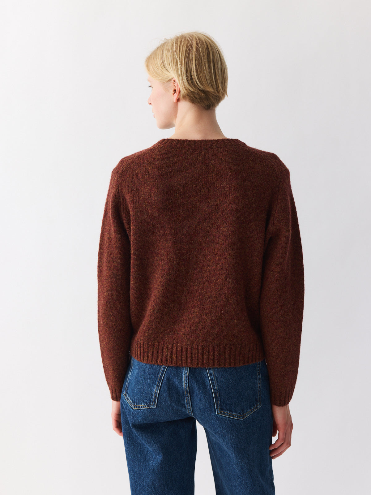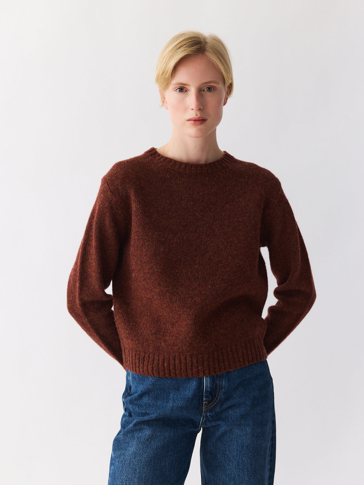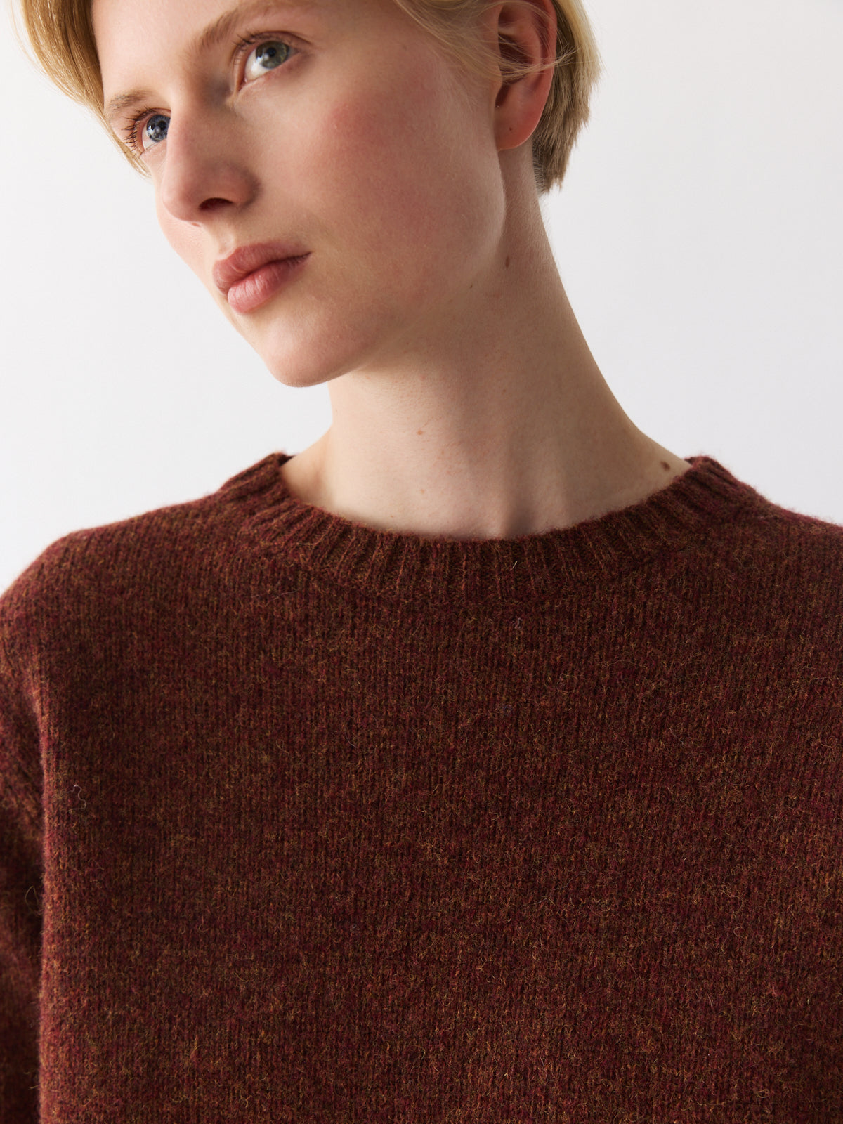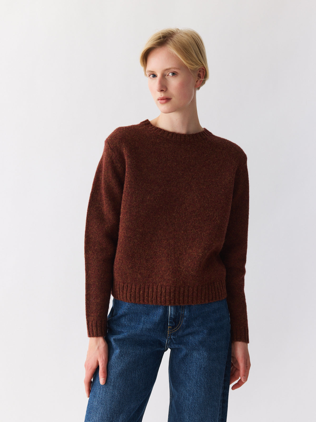 A refined take on the winter sweater. Knitted from pure wool in a soft brownish stone, this piece blends warmth with subtle elegance. The generous shoulders and gently fitted waistband create a flattering shape, while ribbed trims finish the look. Wear with the matching Vien beret for a complete set.