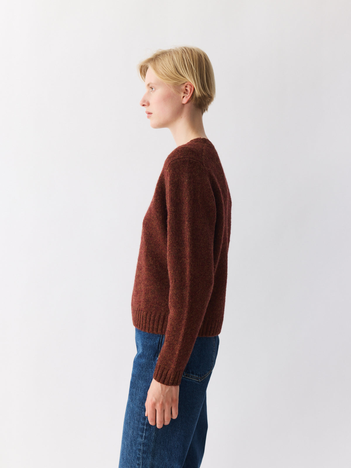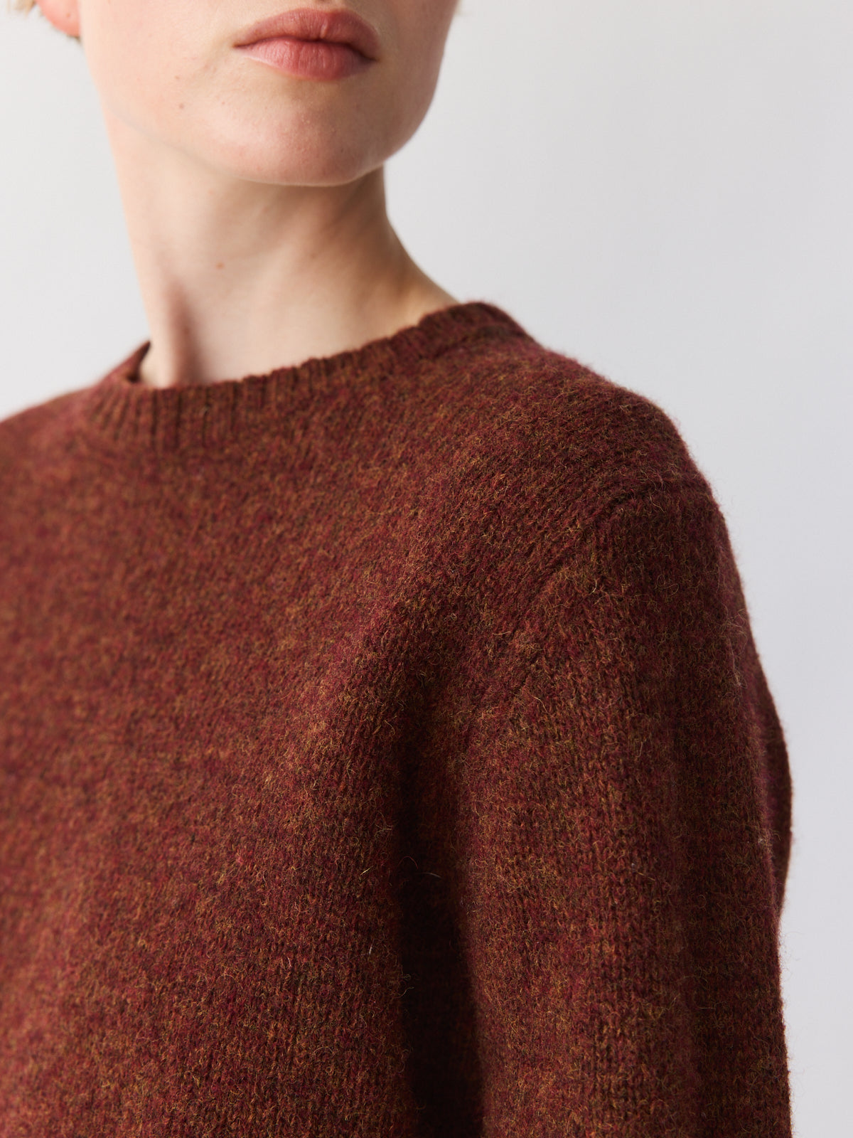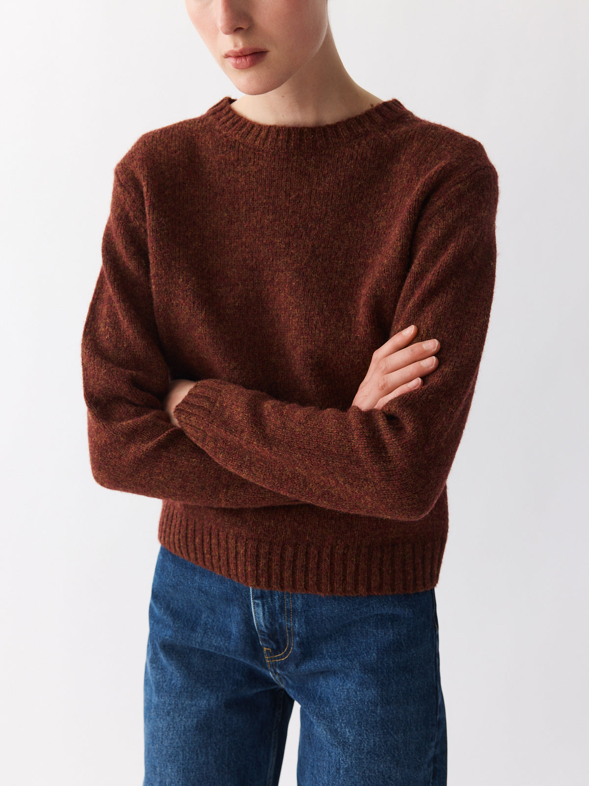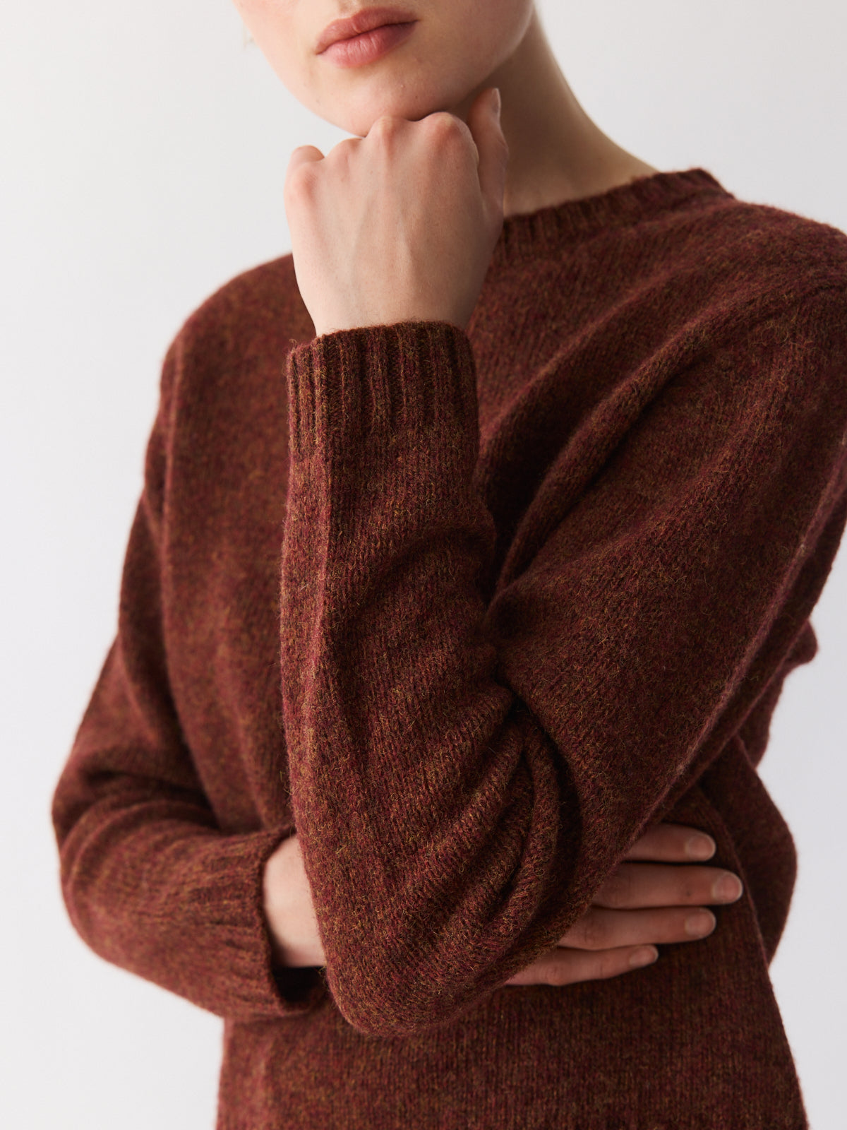 A refined take on the winter sweater. Knitted from pure wool in a soft brownish stone, this piece blends warmth with subtle elegance. The generous shoulders and gently fitted waistband create a flattering shape, while ribbed trims finish the look. Wear with the matching Vien beret for a complete set.