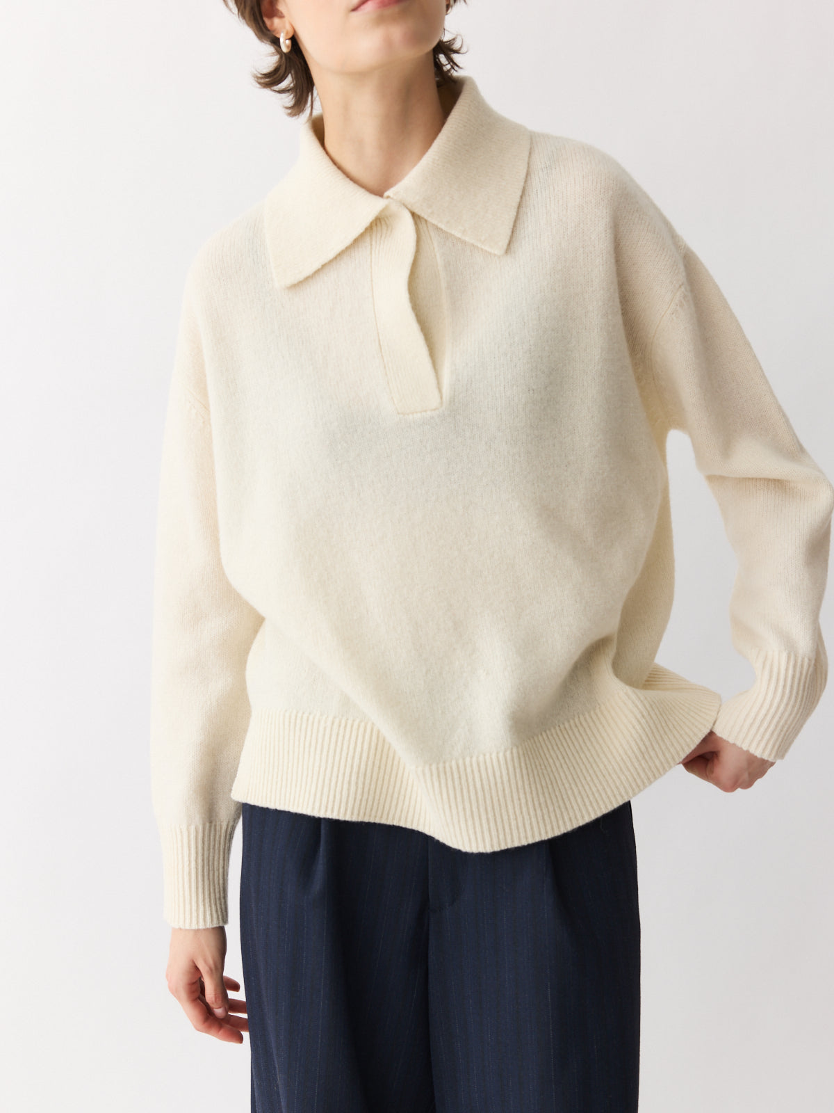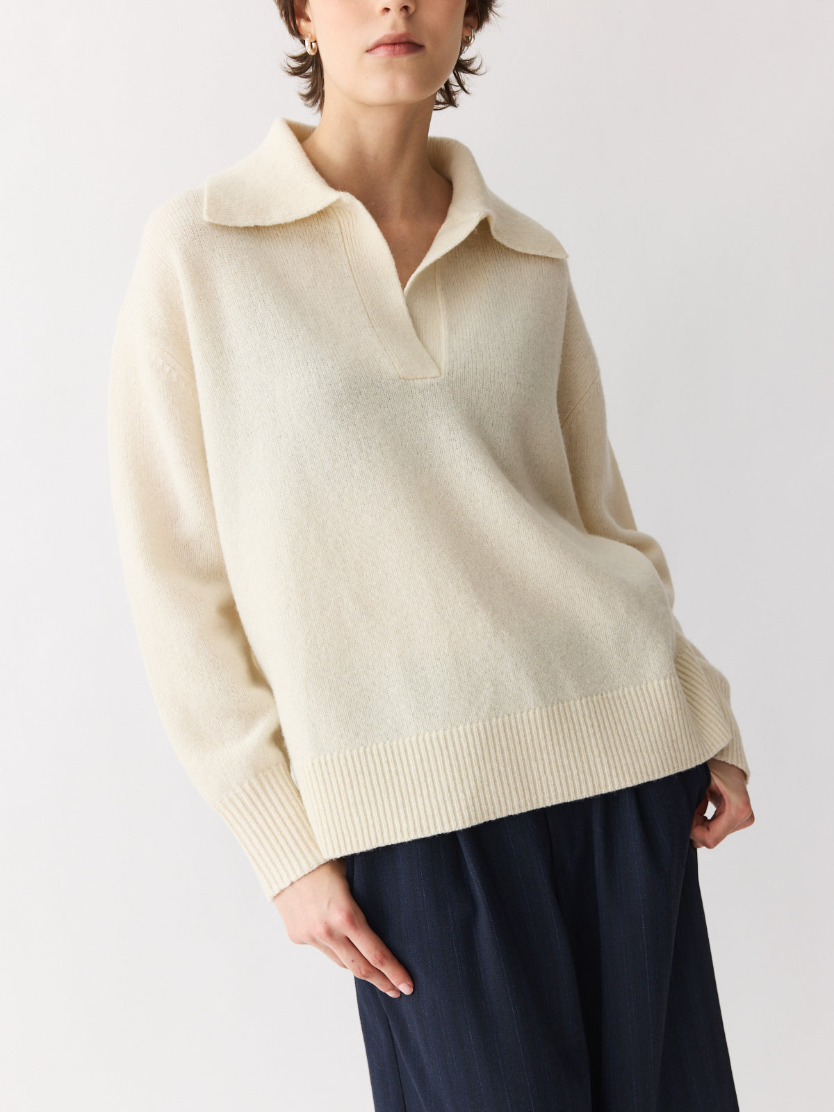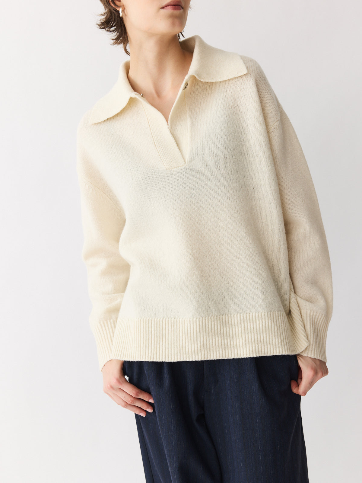 A fresh take on the classic polo. This oversized sweater features a generous collar, press-button V-neckline, and dropped shoulders for a relaxed feel. Knitted in thick 100% wool for maximum warmth, its cream hue adds versatility and softness. Side slits and ribbed trims complete the silhouette with thoughtful detail.