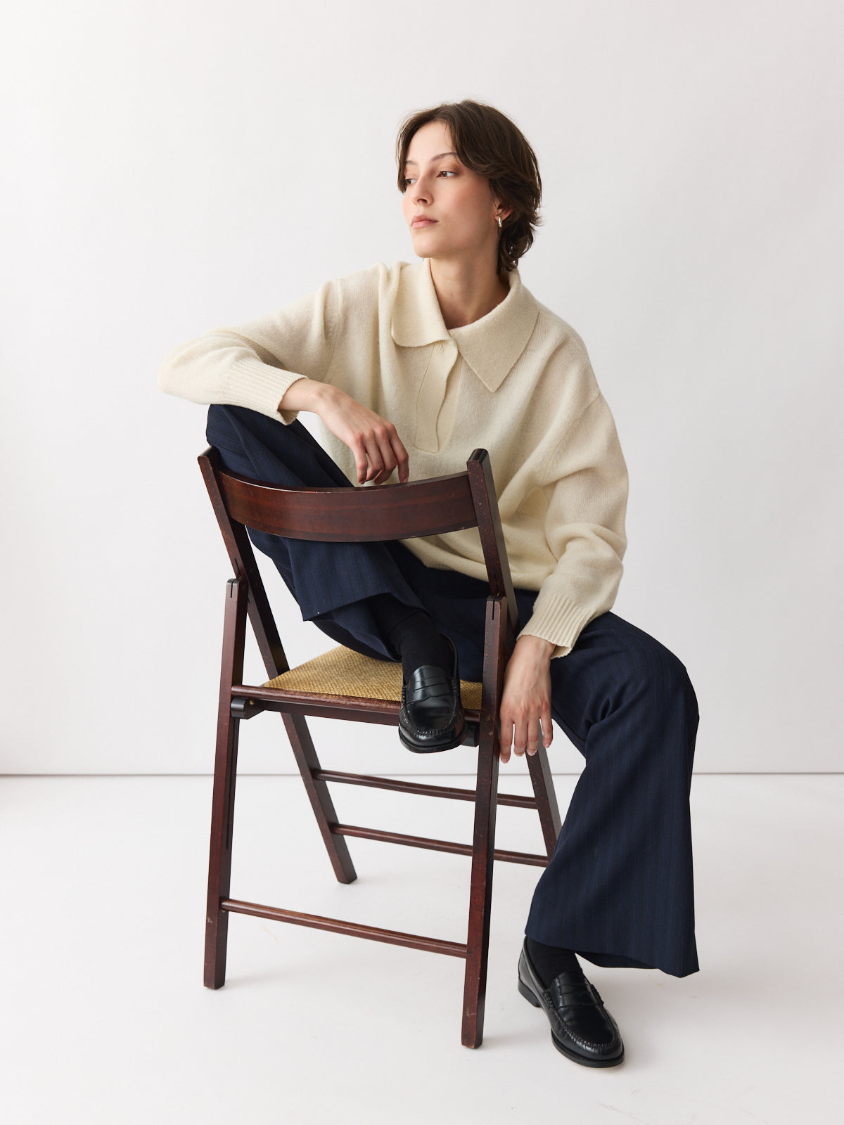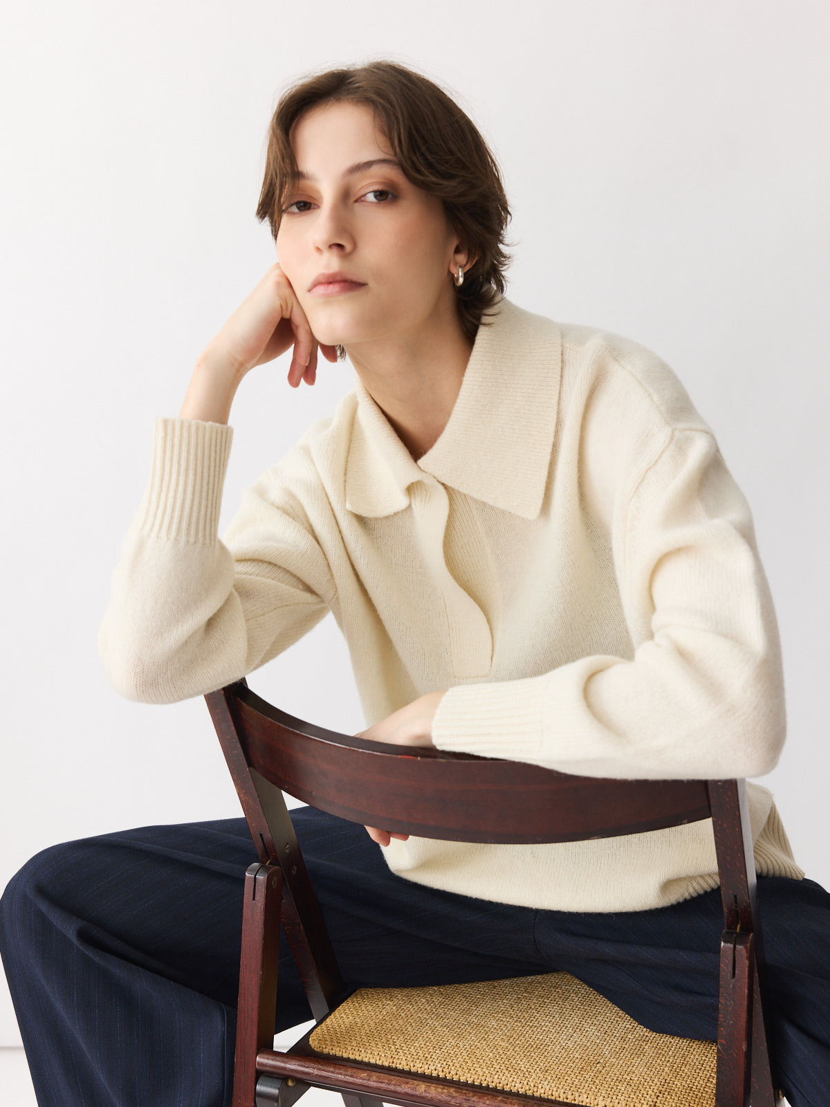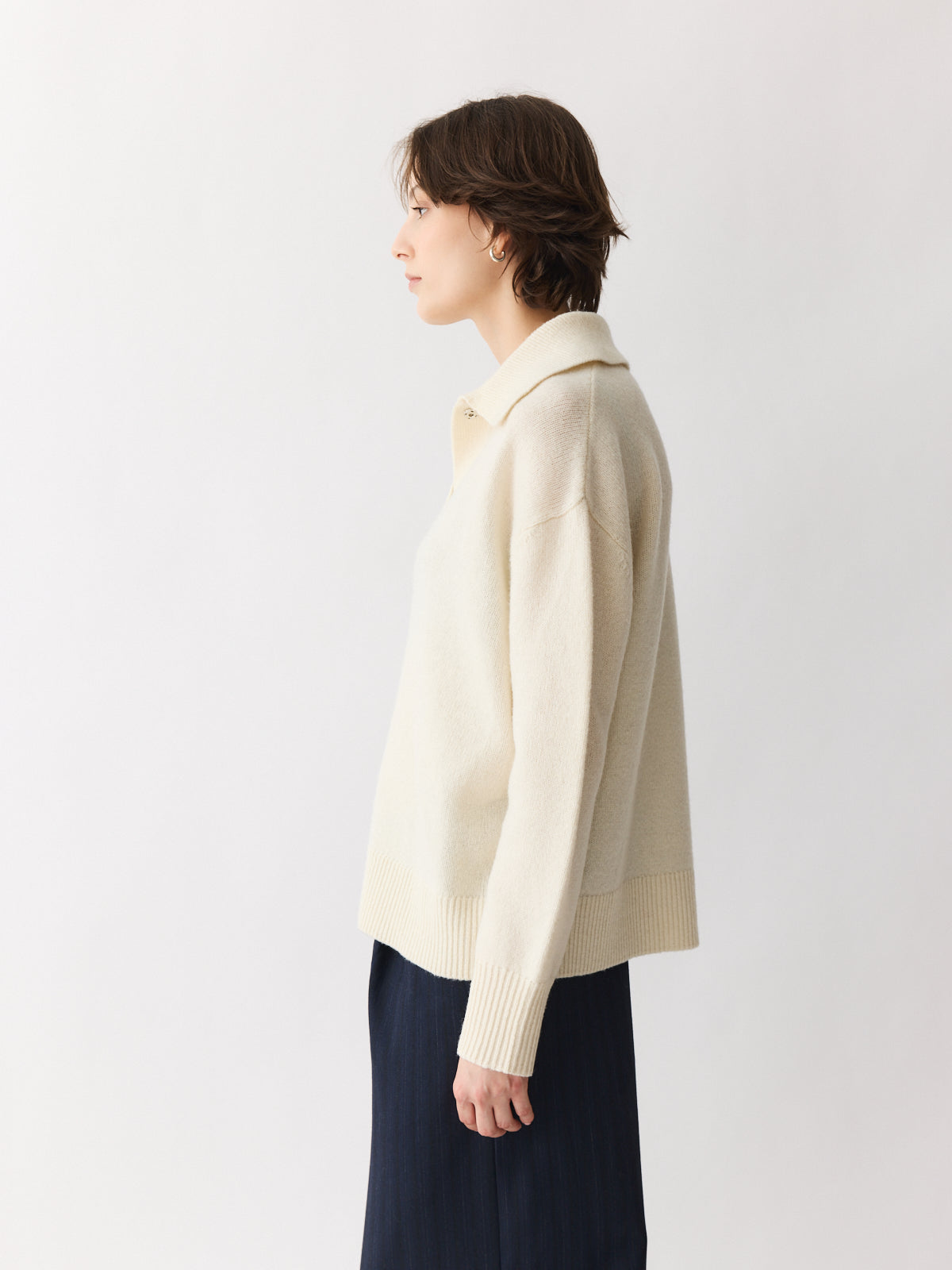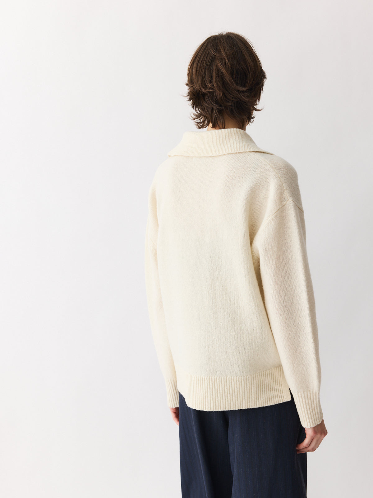 A fresh take on the classic polo. This oversized sweater features a generous collar, press-button V-neckline, and dropped shoulders for a relaxed feel. Knitted in thick 100% wool for maximum warmth, its cream hue adds versatility and softness. Side slits and ribbed trims complete the silhouette with thoughtful detail.