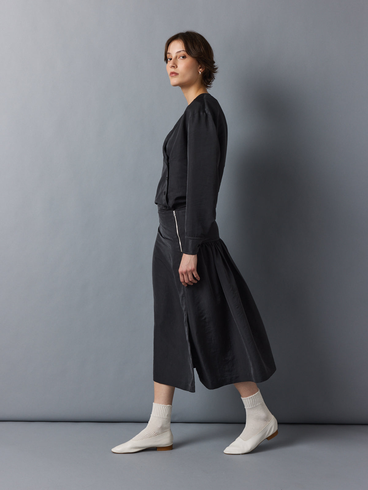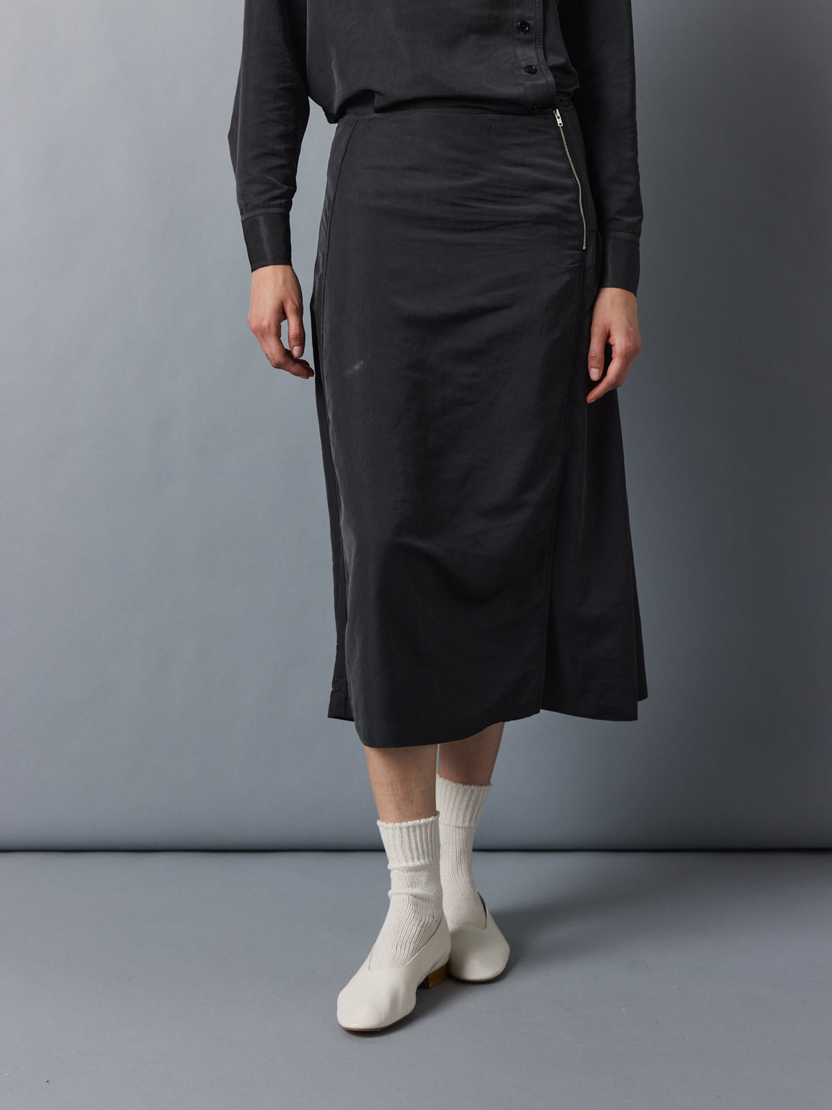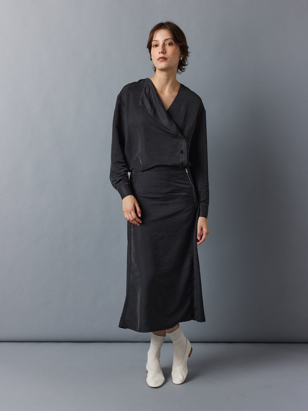 This asymmetric midi skirt is crafted from fluid Japanese fabric in off-black with a grey undertone. Designed high-waisted with a subtle A-line, it features a distinctive asymmetric zip, gathered fringe running front to back, and front slit. Pair with the matching Arto blouse for a cohesive silhouette.