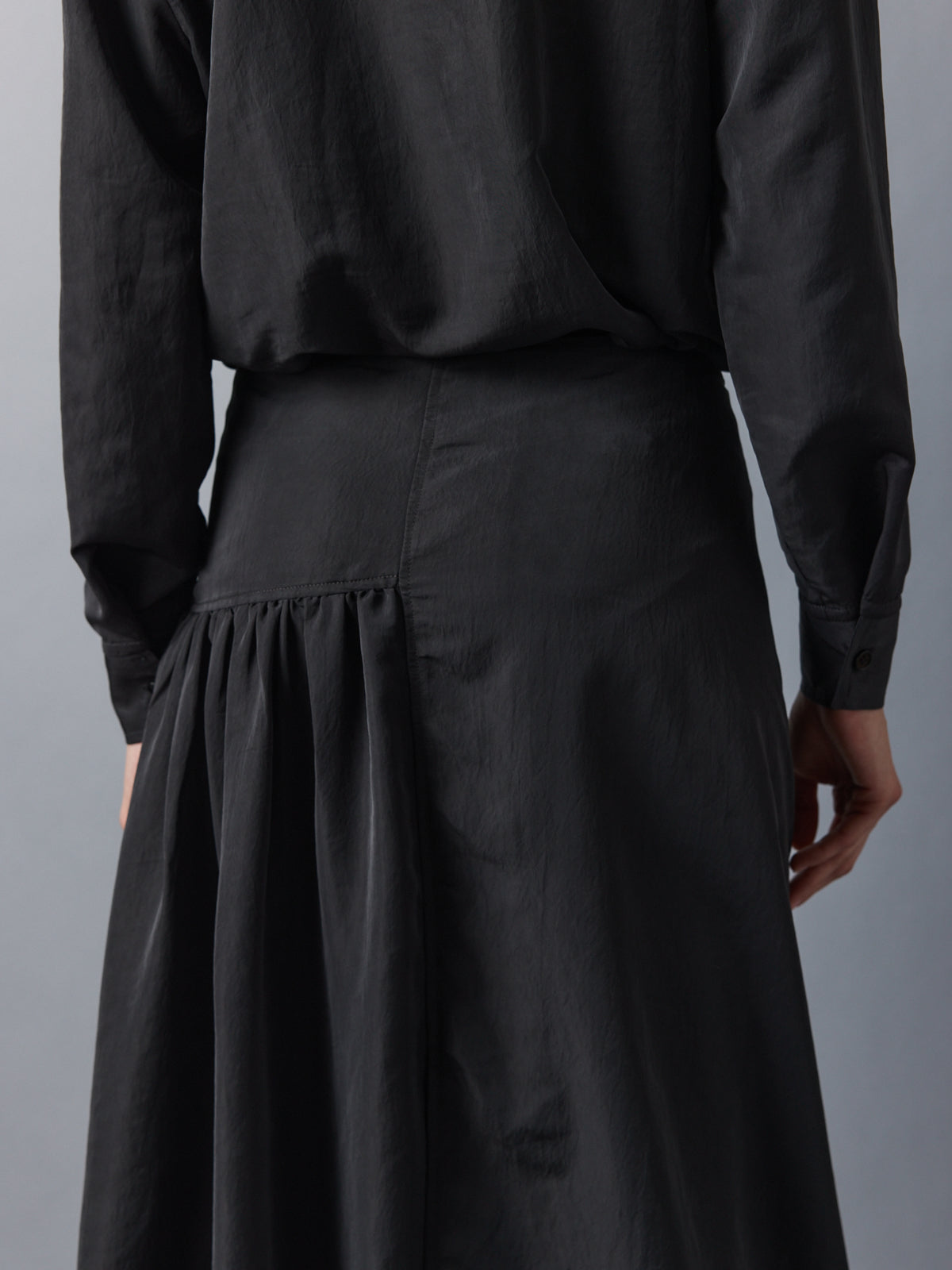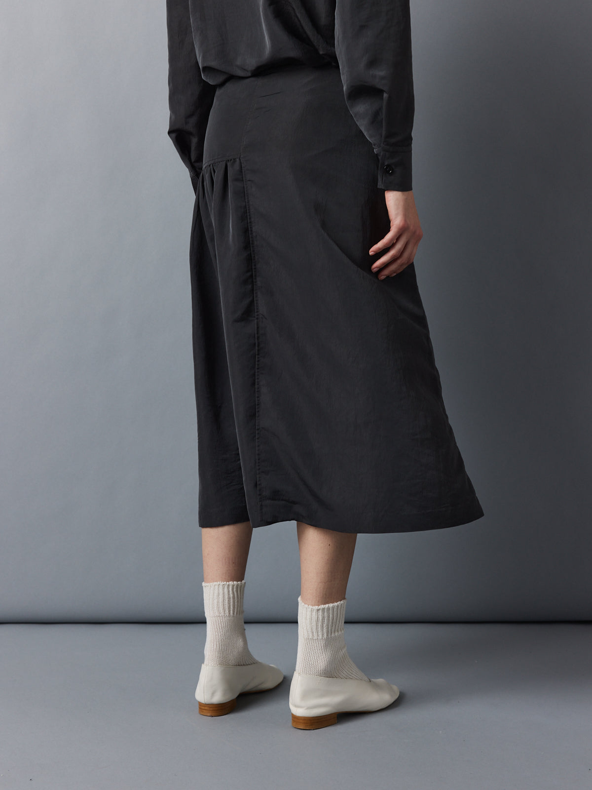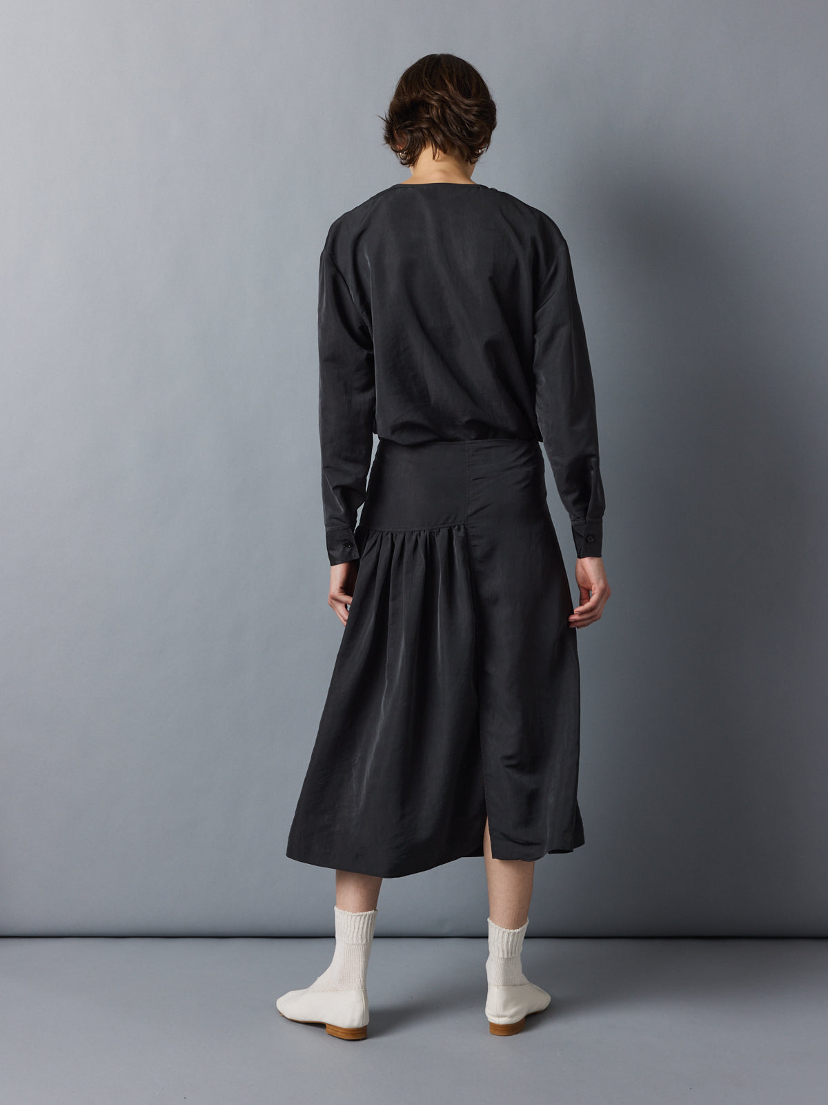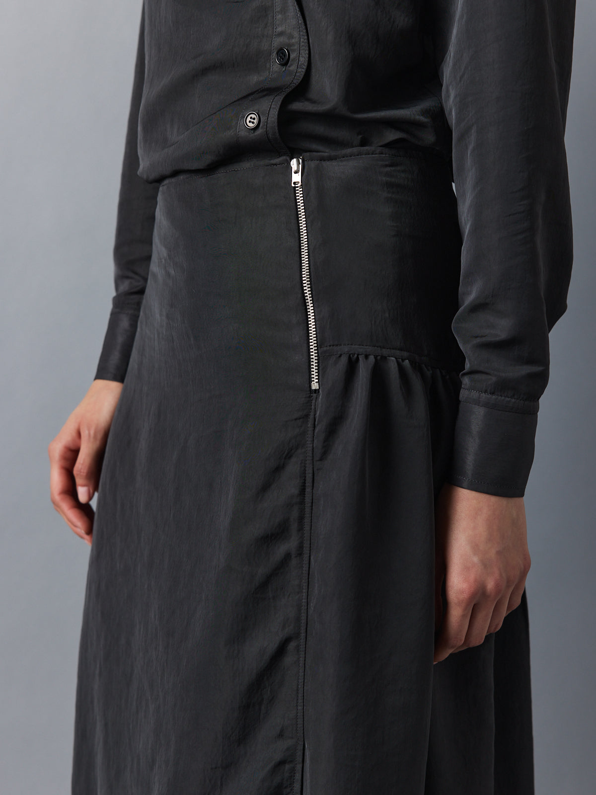 This asymmetric midi skirt is crafted from fluid Japanese fabric in off-black with a grey undertone. Designed high-waisted with a subtle A-line, it features a distinctive asymmetric zip, gathered fringe running front to back, and front slit. Pair with the matching Arto blouse for a cohesive silhouette.