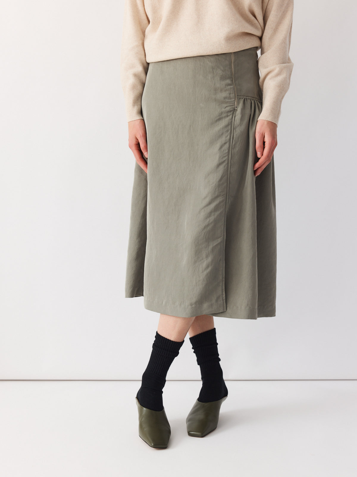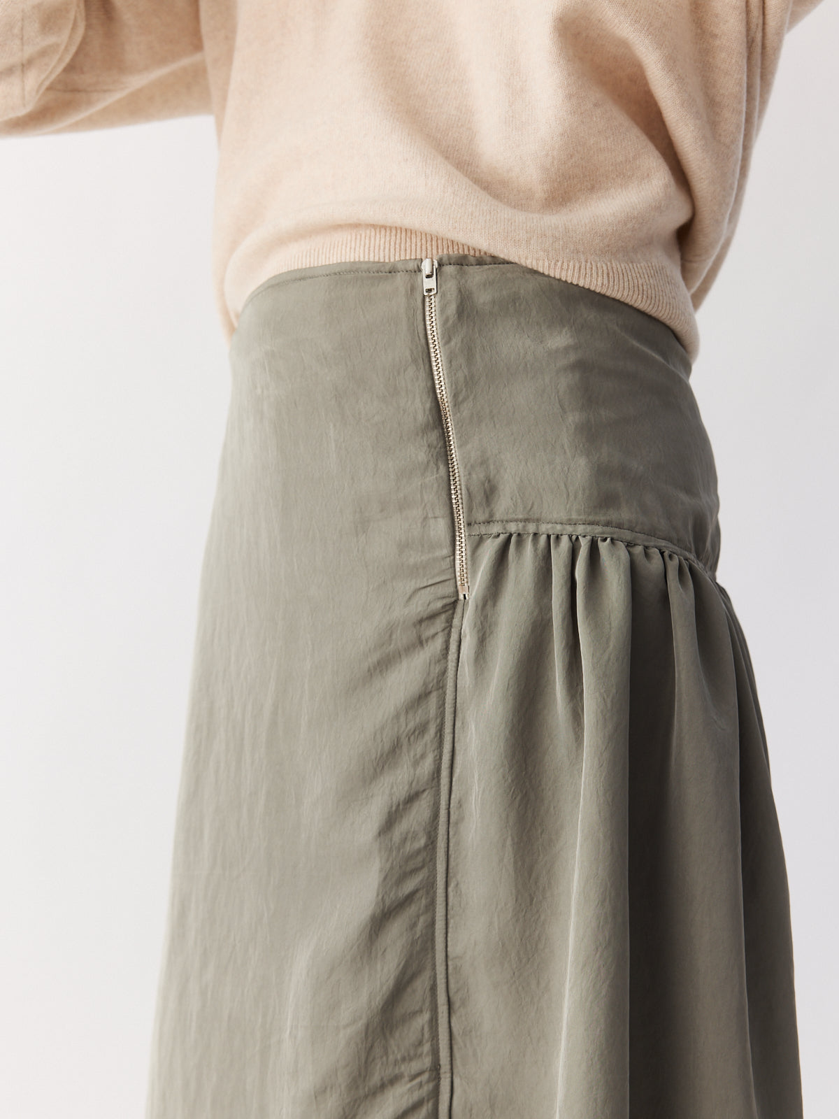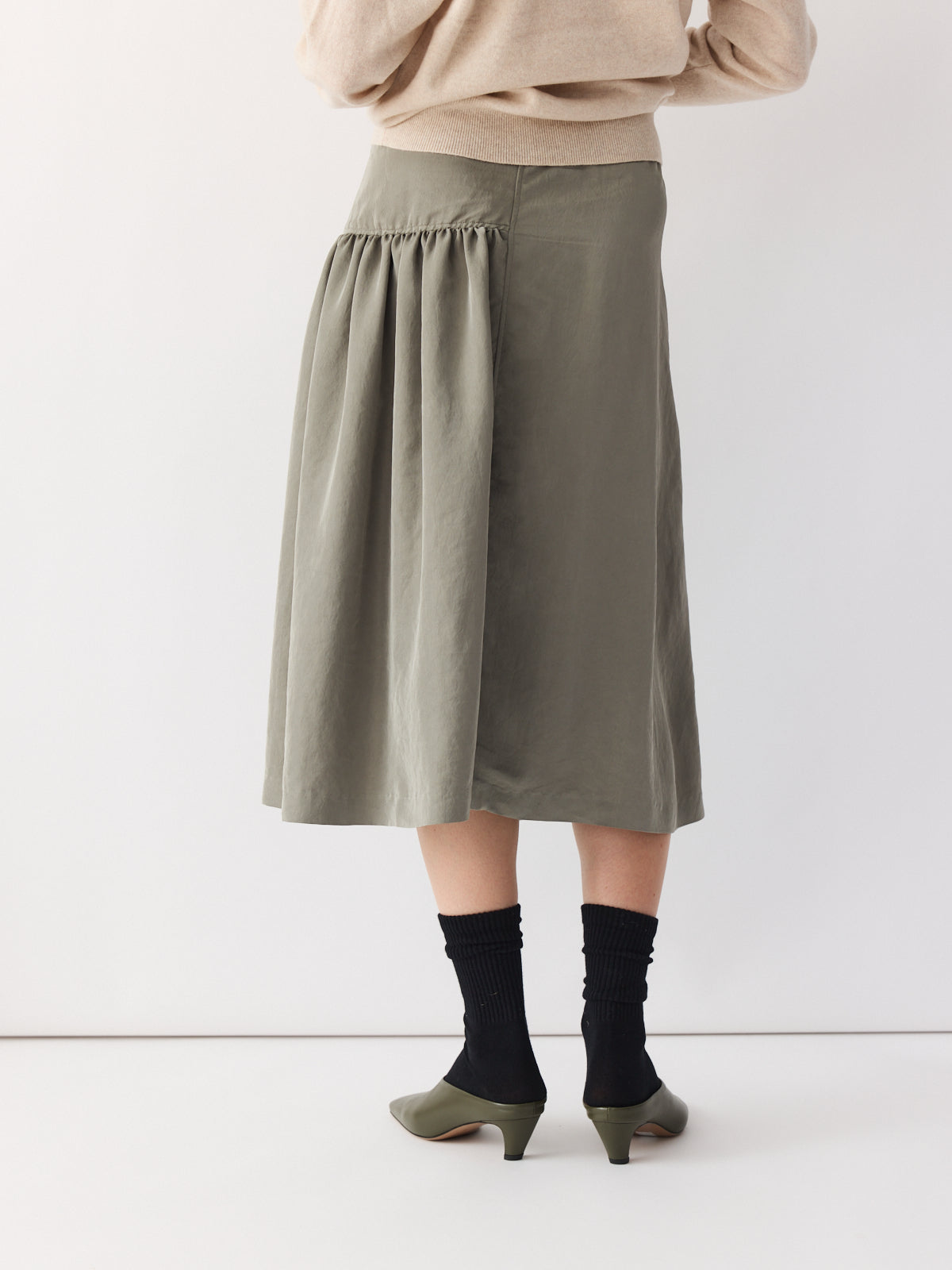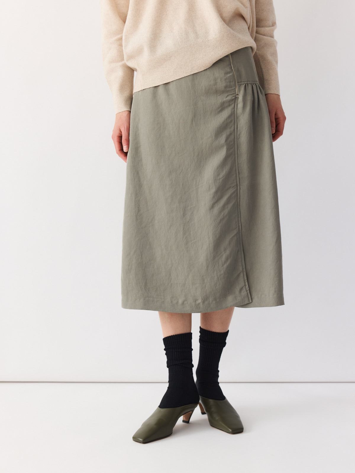This midi skirt stands out in warm stone grey with a subtle green undertone. Crafted from fluid Japanese fabric, it features a high-rise waist, subtle A-line shape, asymmetric zip, gathered fringe detail, and front slit. Pair with the matching Aman blouse or Raki shirt for a matching set.