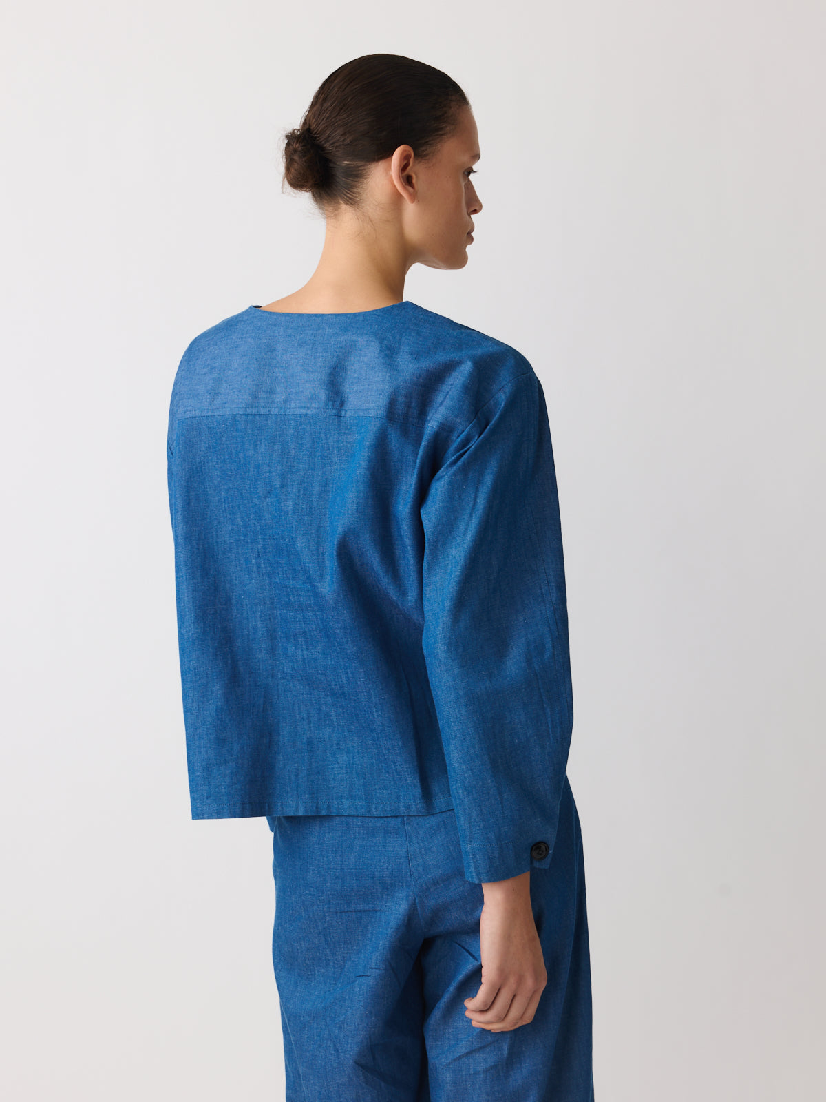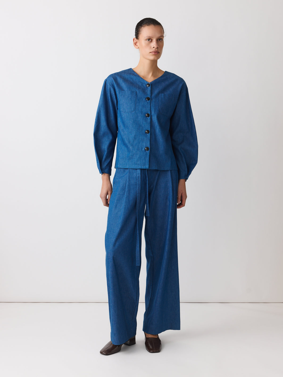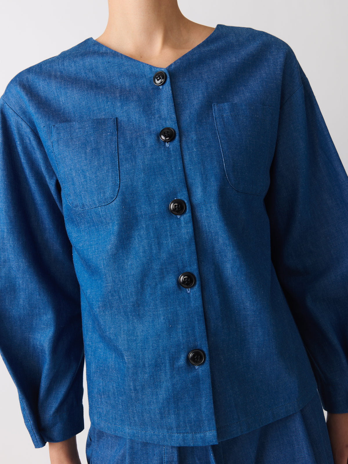 In soft blue denim, this shirt is defined by its proportions. Crafted from lightweight cotton with a fluid drape, it features a V-neckline, extended shoulders, chest patch pockets and adjustable cuffs that create a subtle balloon sleeve shape.