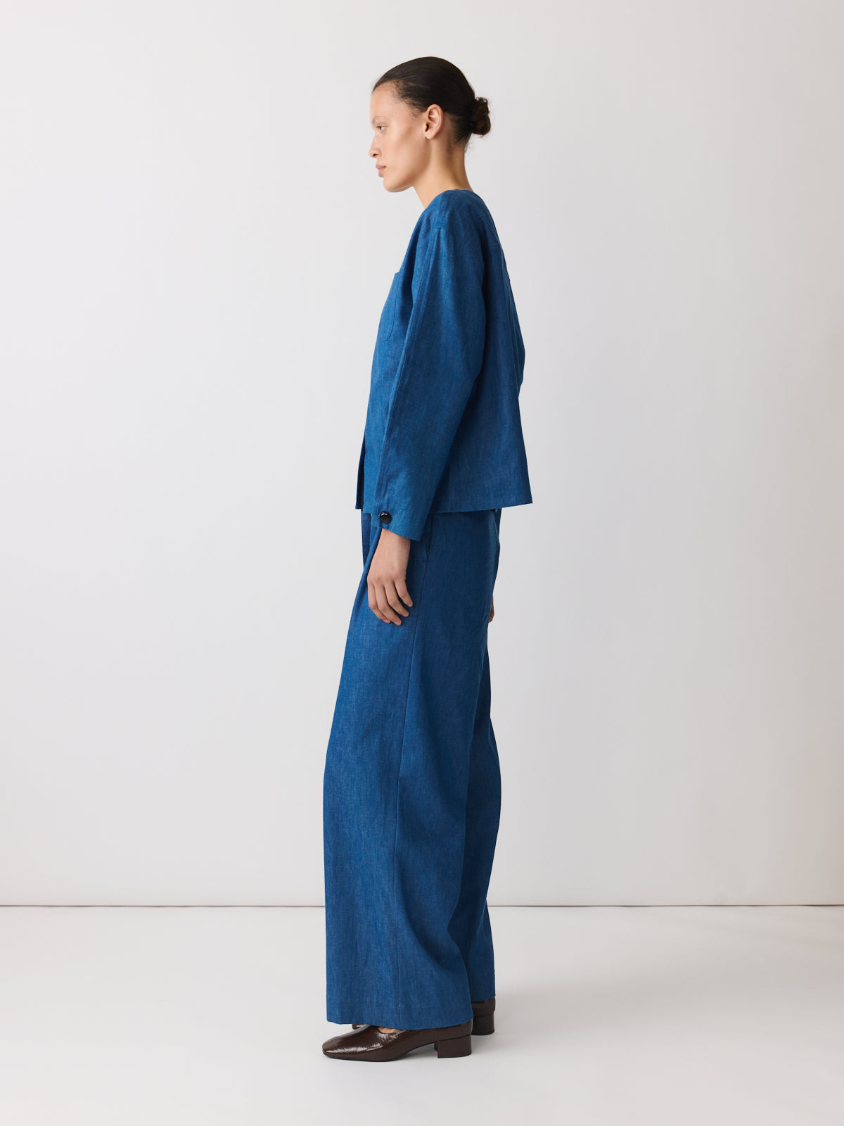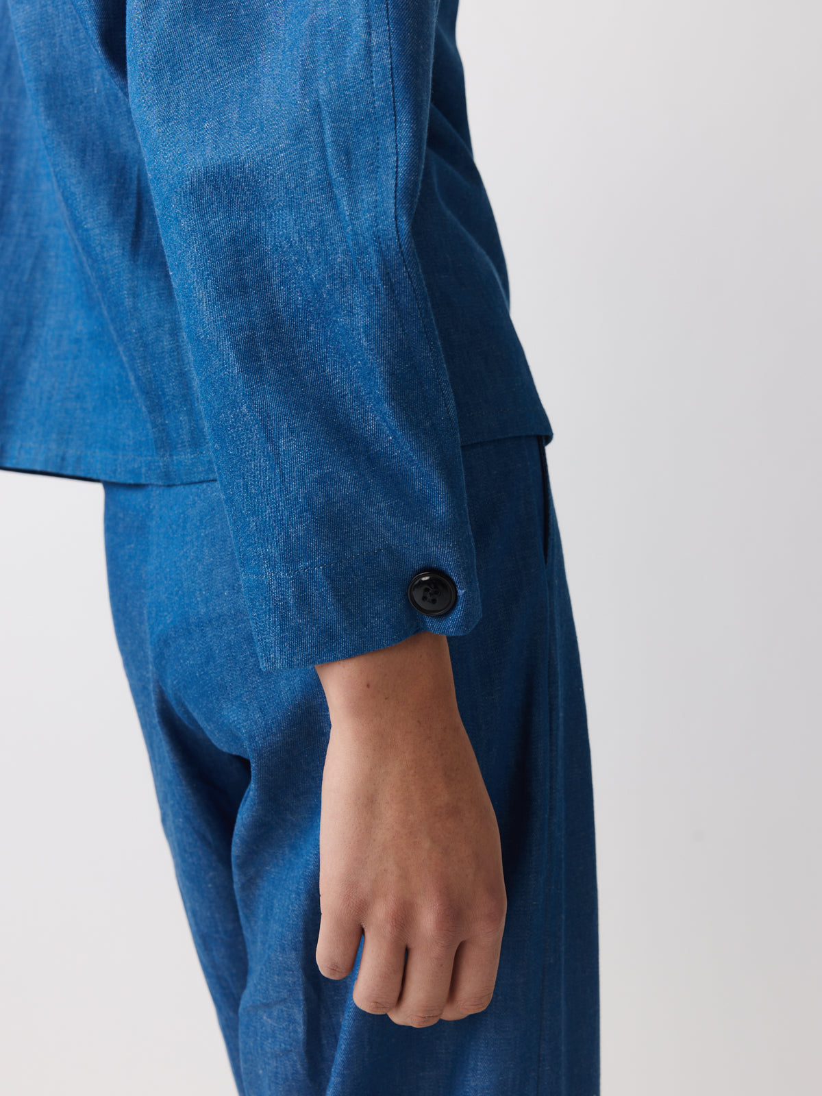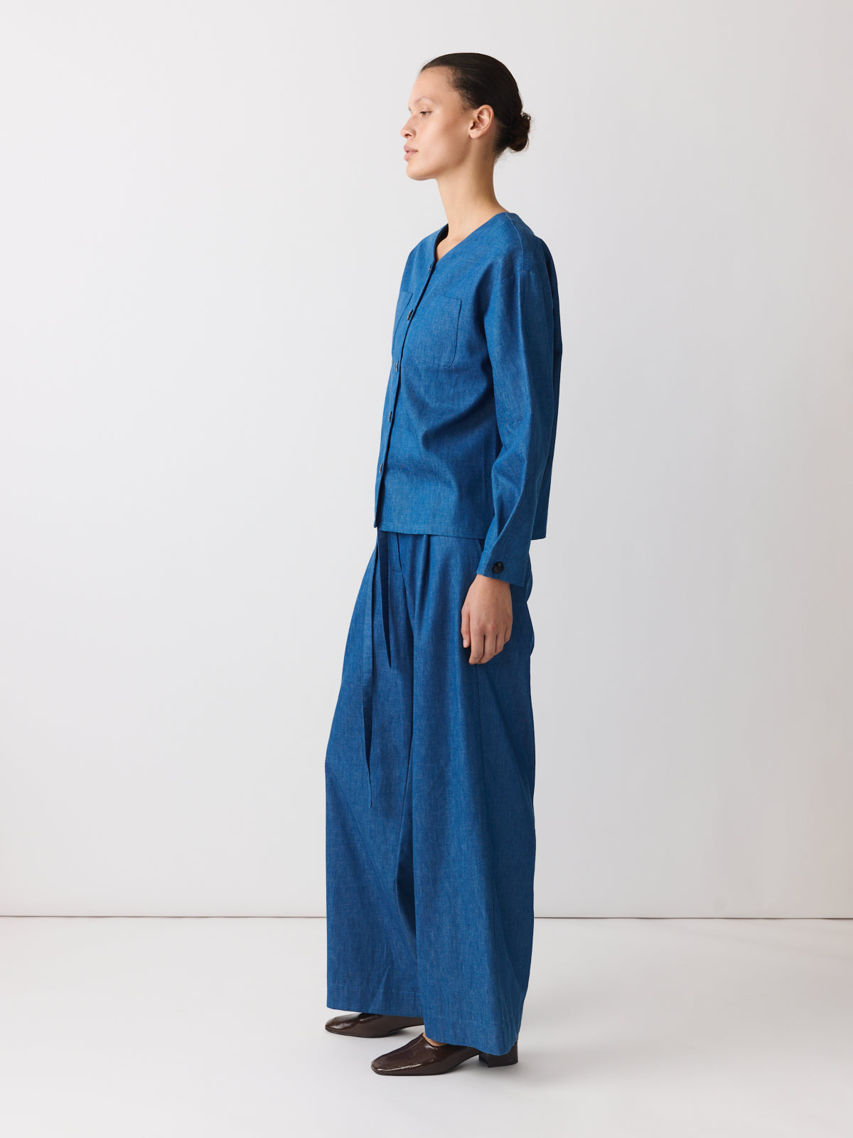 In soft blue denim, this shirt is defined by its proportions. Crafted from lightweight cotton with a fluid drape, it features a V-neckline, extended shoulders, chest patch pockets and adjustable cuffs that create a subtle balloon sleeve shape.