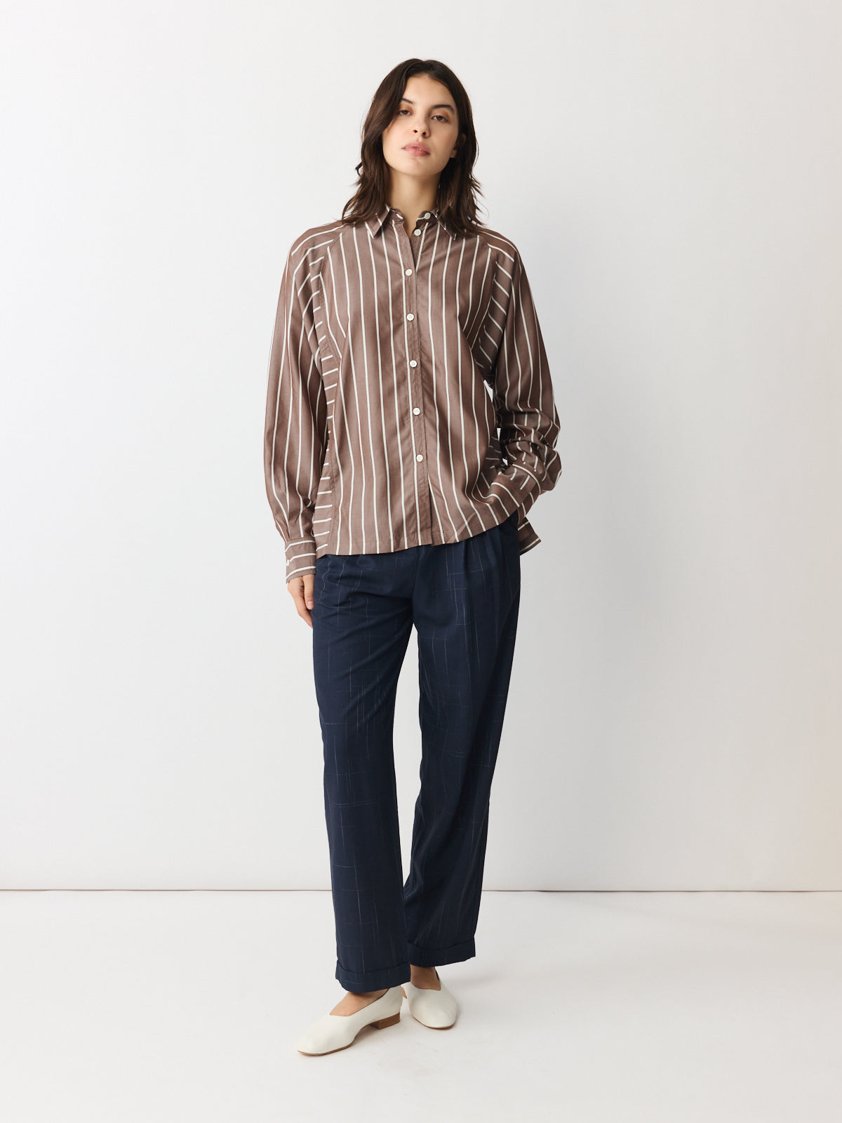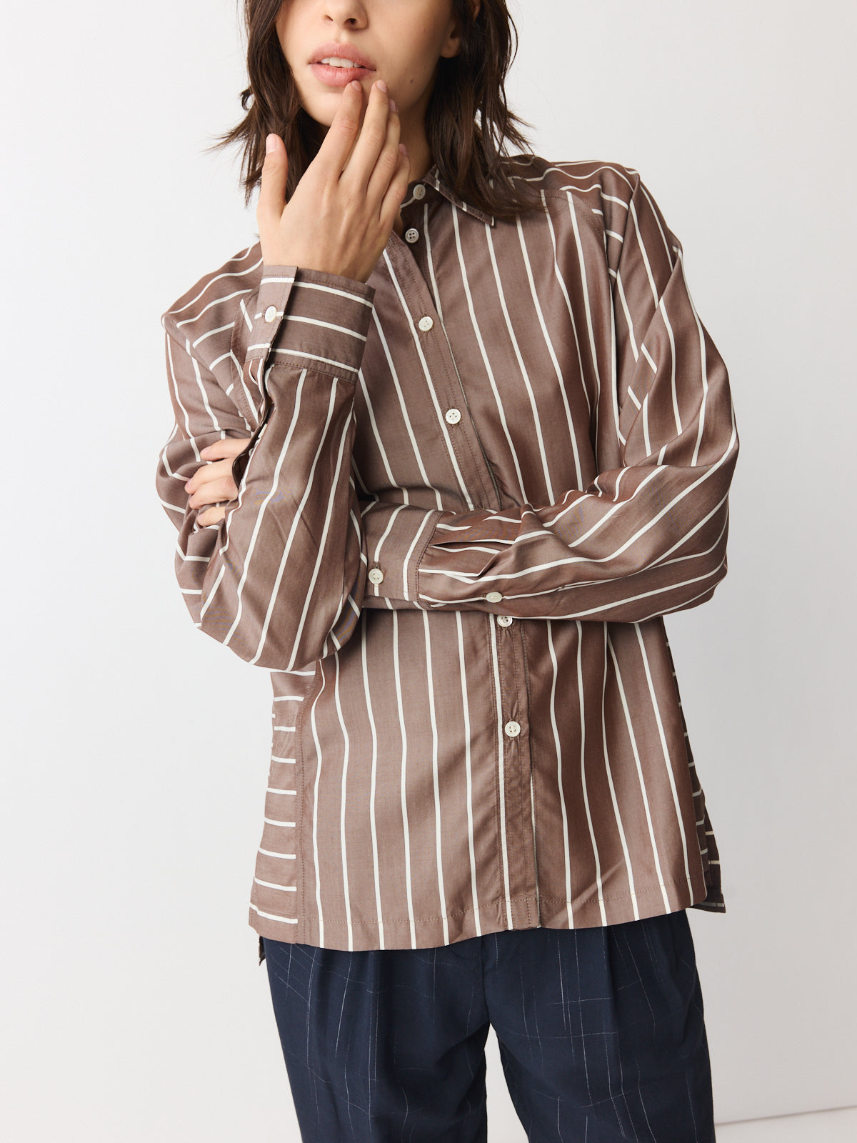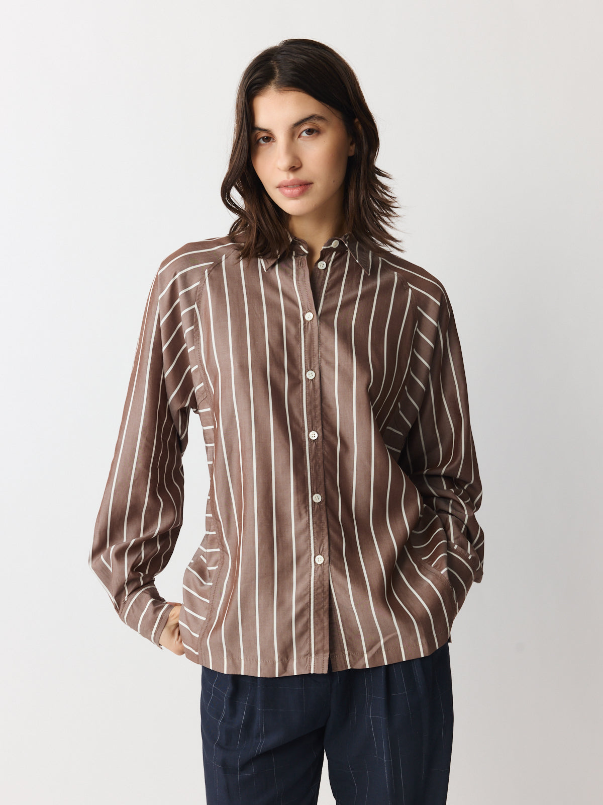 Defined by its directional stripe placement, this shirt plays with horizontal and vertical lines in ecru and brown striped lyocell. Matte yet luminous in feel, it features a classic collar, button opening, unique sleeve construction and a longer back hem.