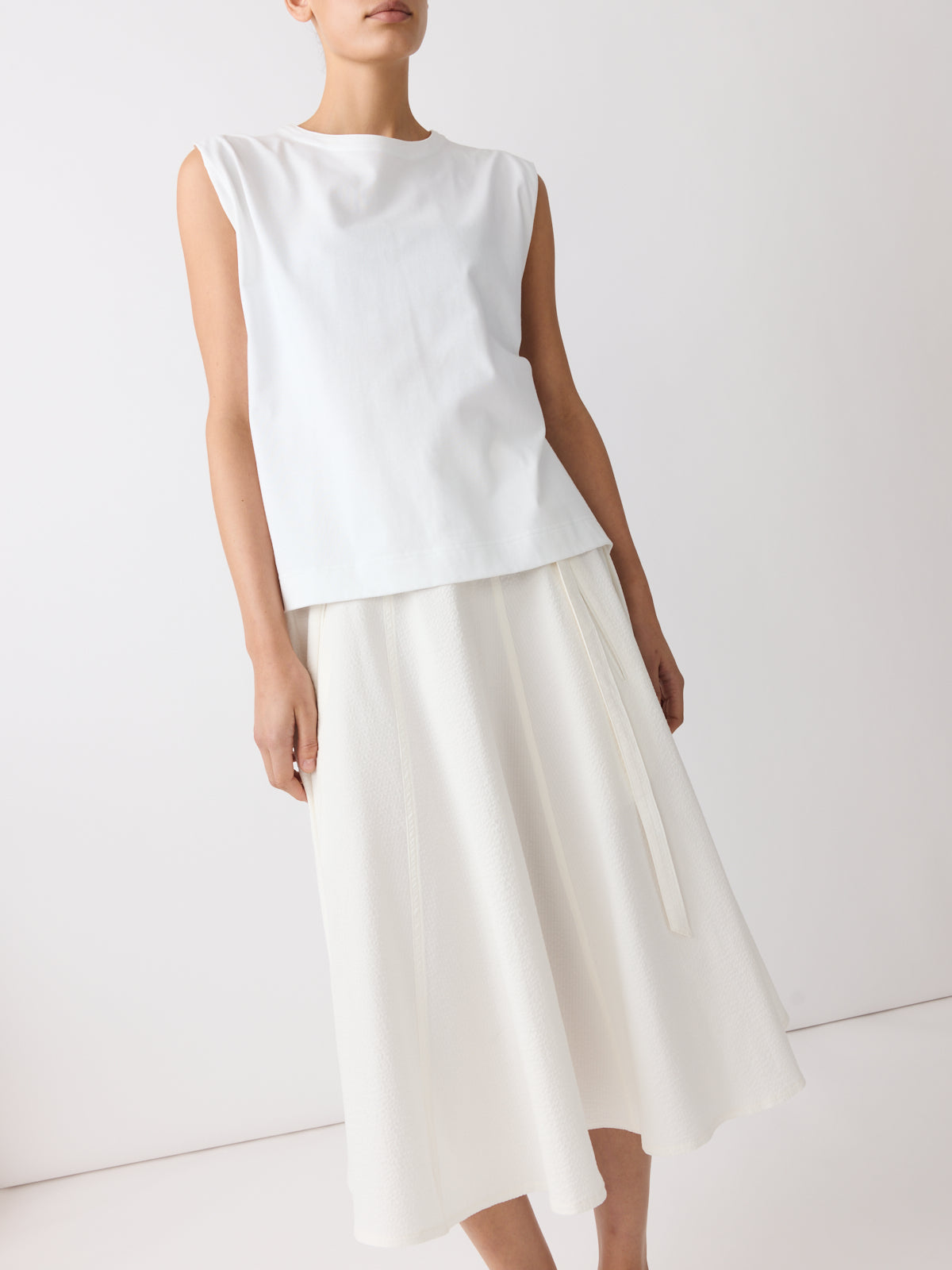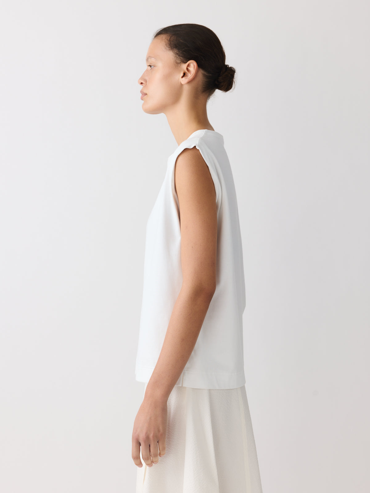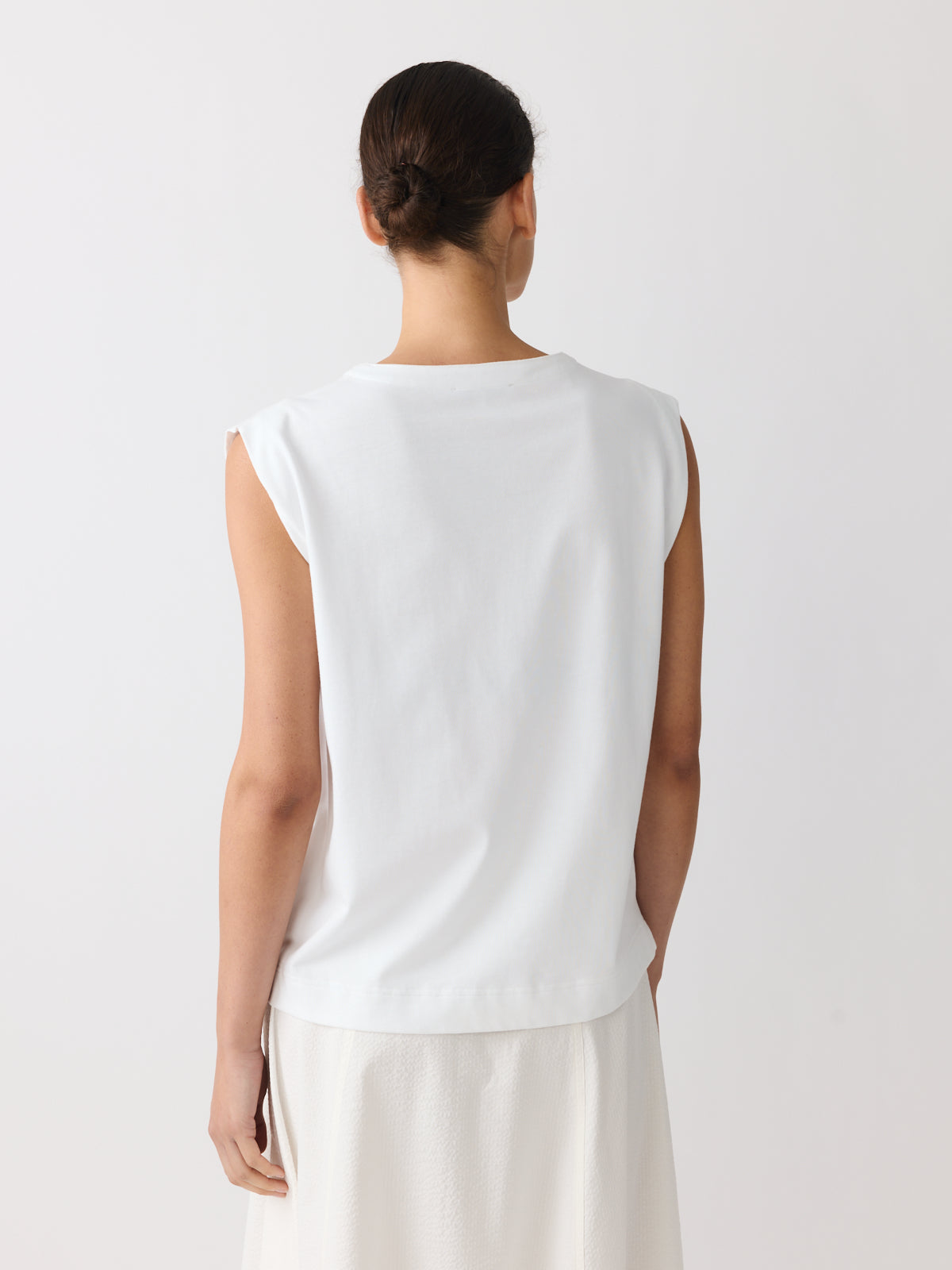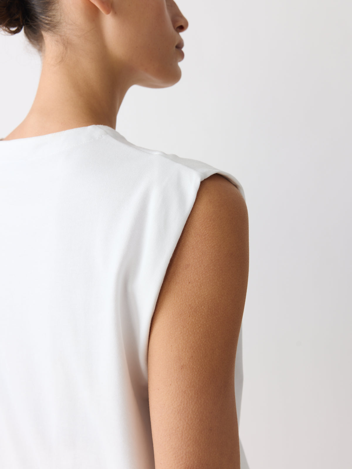 This white T-shirt is made from straight-cut cotton jersey, offering a simple and understated look. It features cap sleeves, a sleeveless design, and a boyish boxy fit.