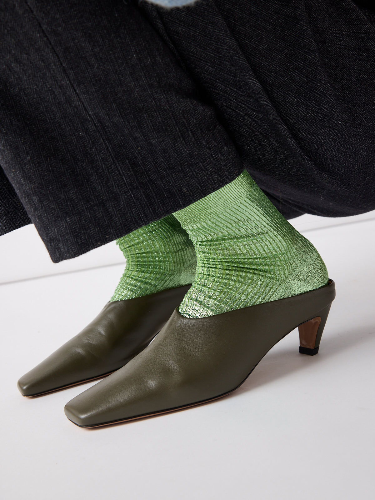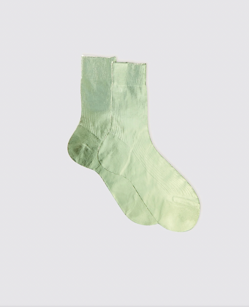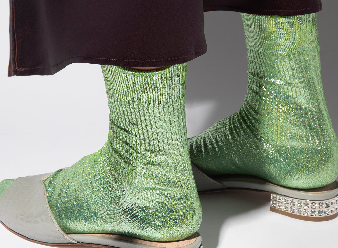 A Maria La Rosa classic, these women’s ribbed socks are knitted from fine silk yarn. Thin but at the same time remarkably insulating, keeping feet cool in summer and warm in winter. The subtle green foil shine adds a sparkling, elegant touch, perfect for both everyday looks and special occasions.