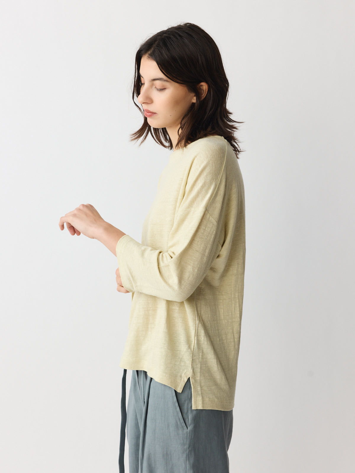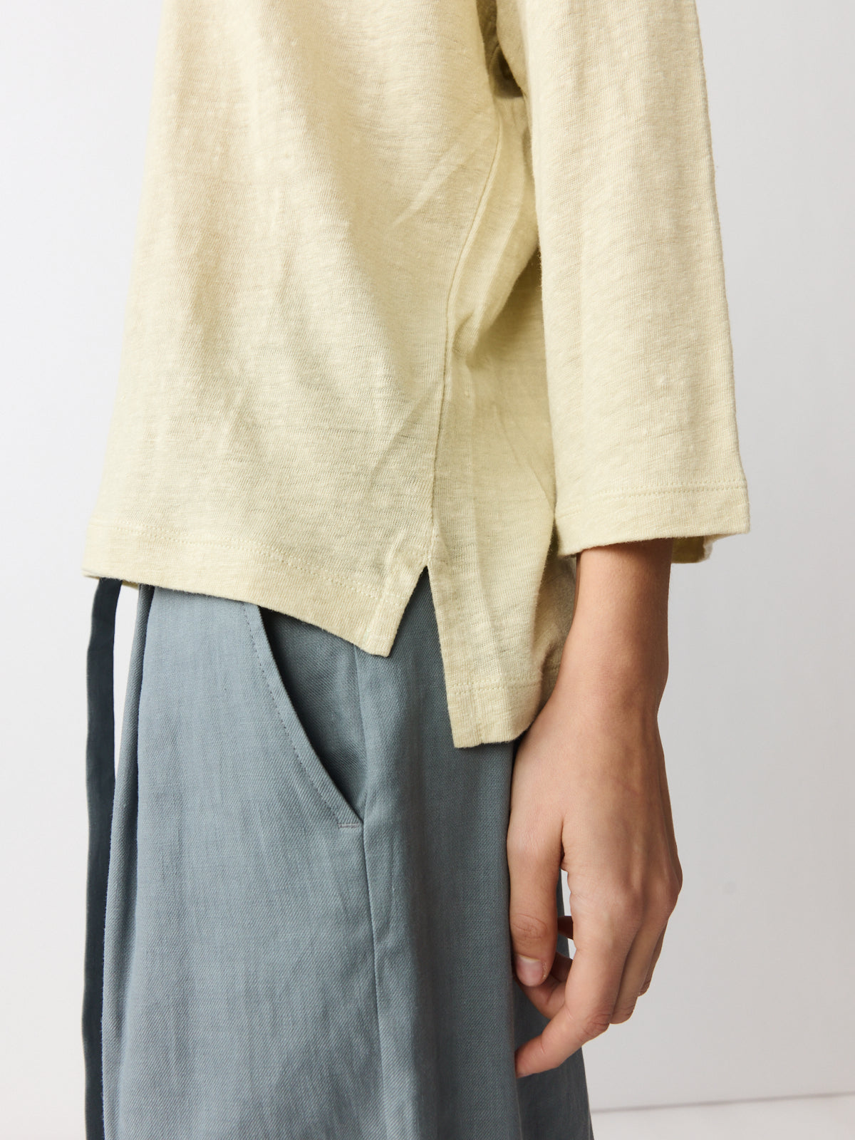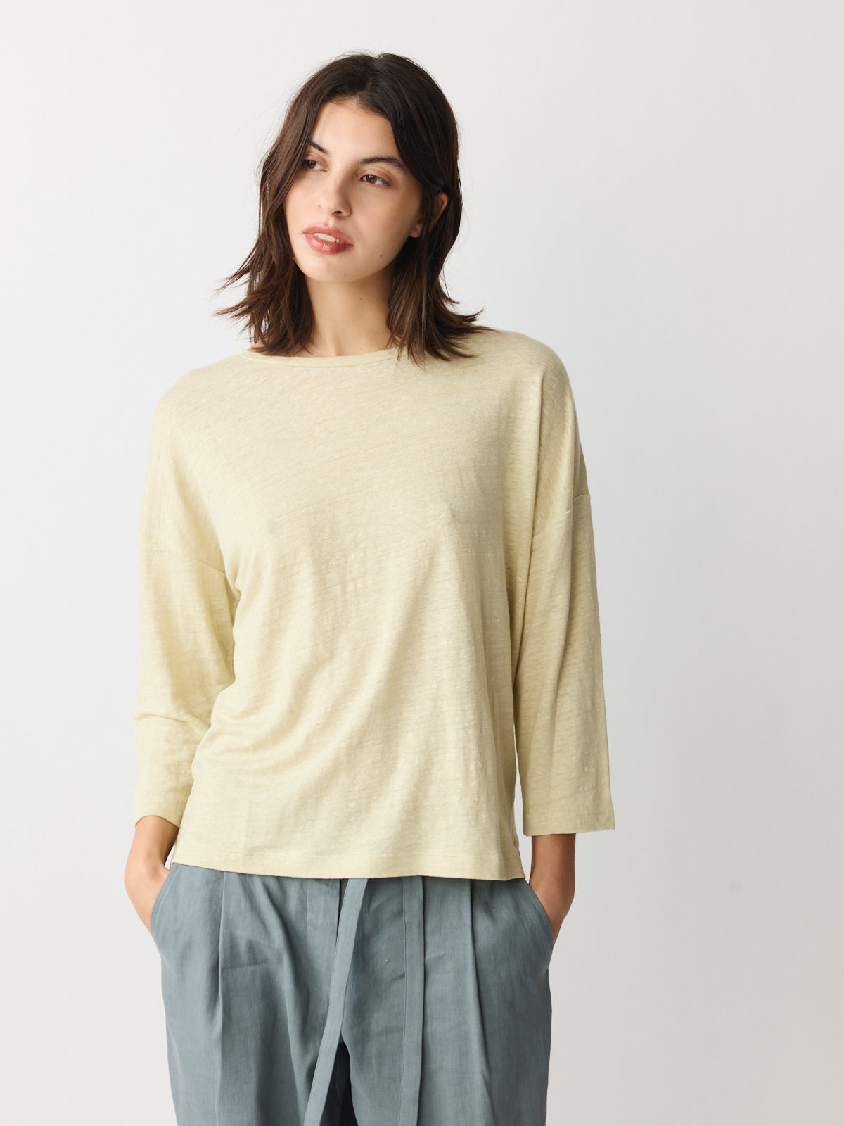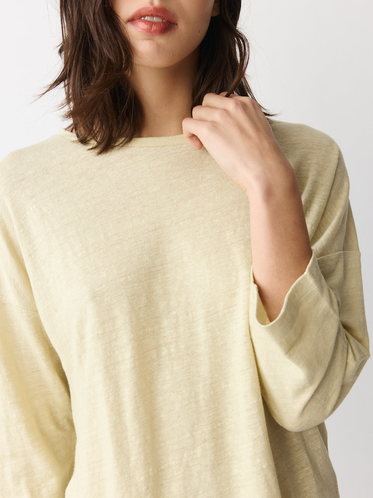 A fresh warm-weather basic in yellow, this linen T-shirt is easy to wear. Made from 100% linen, it features a wide round neckline, 3/4 sleeves, dropped shoulders and a loose fit that tapers slightly at the waist.