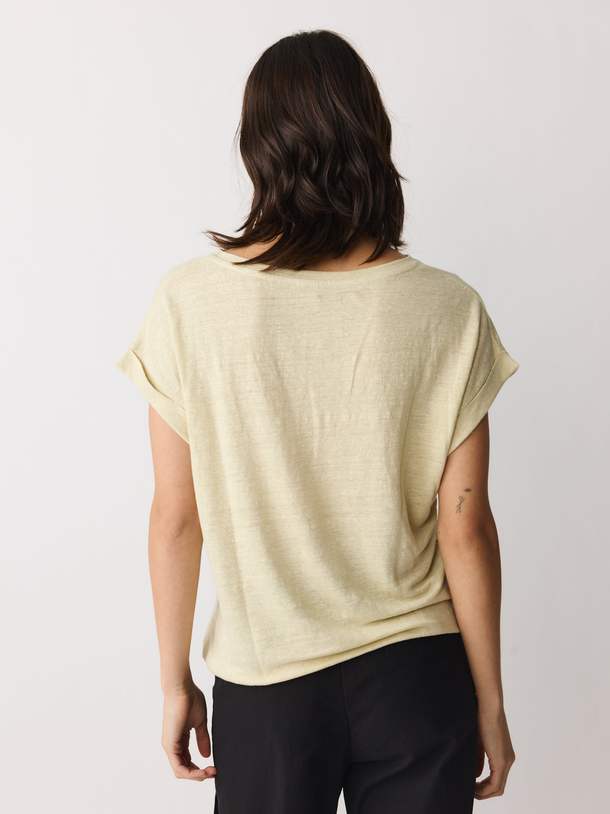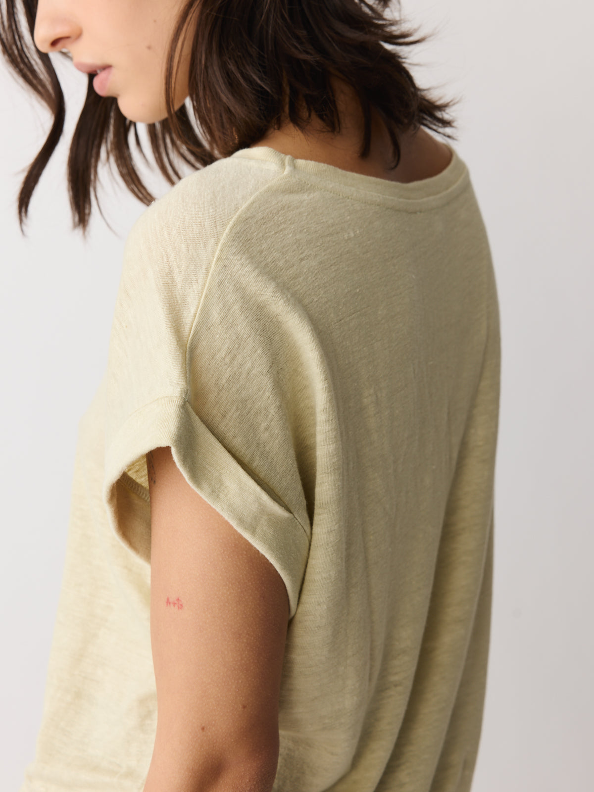 An essential wardrobe building block in tea-leaf yellow, this linen T-shirt is made from 100% linen. It features a round neckline, folded-hem cap sleeves and a loose, straight fit.