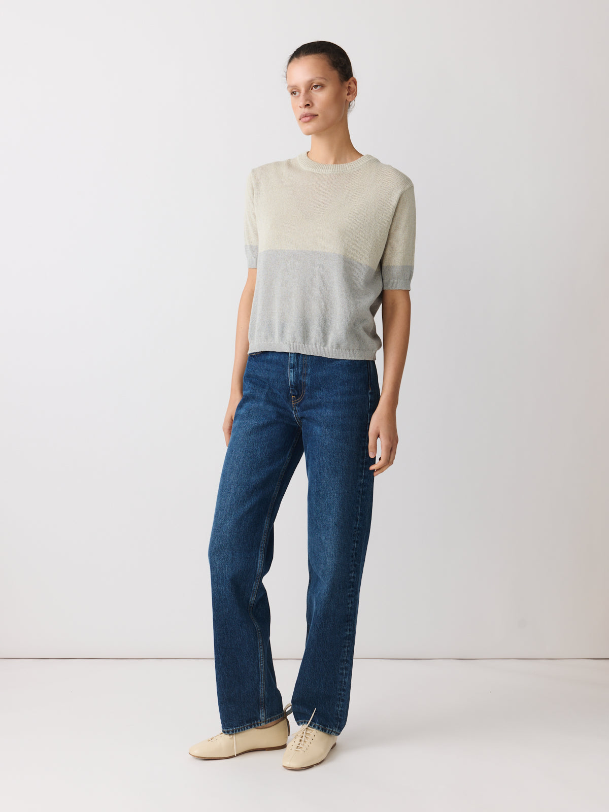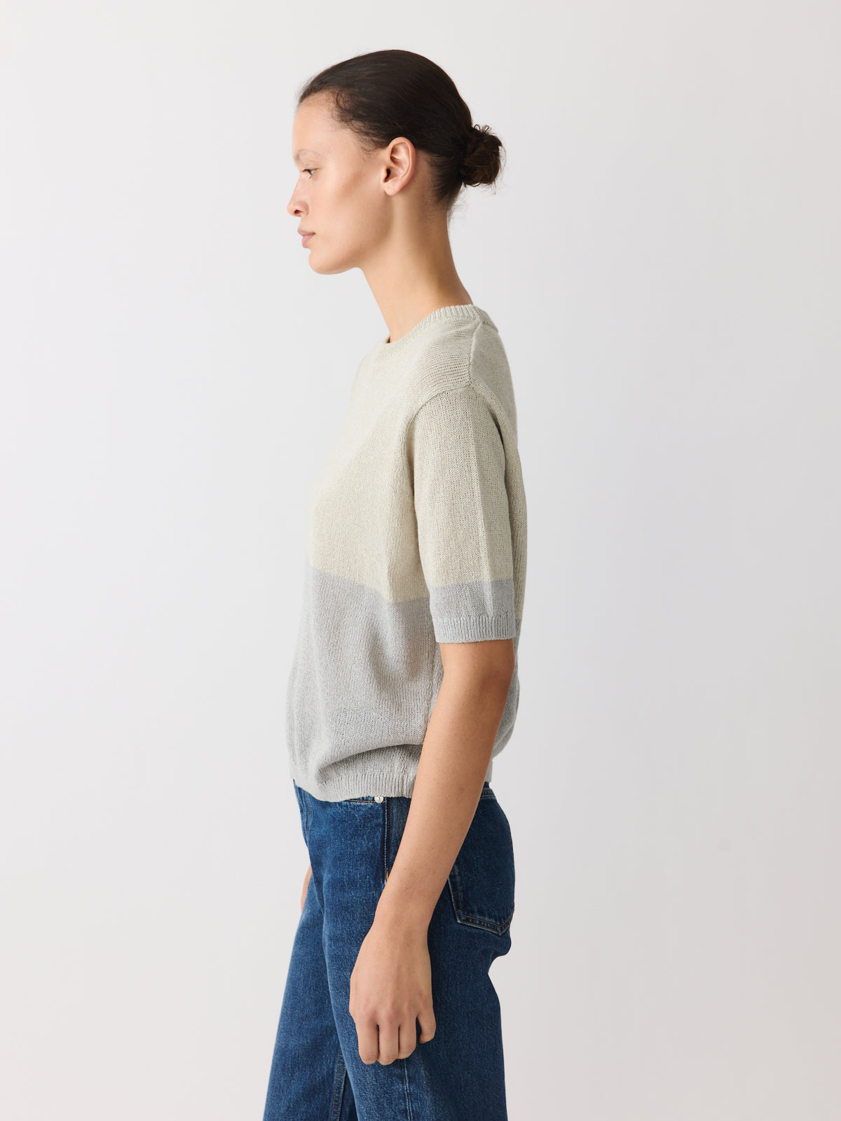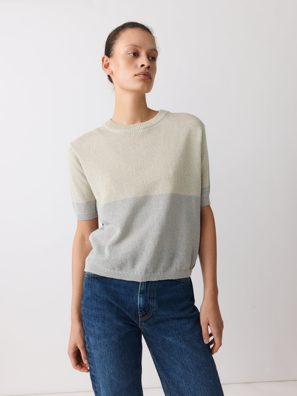 This knitted top stands out through its yarn, crafted from a crisp paper and recycled polyester blend in two-tone grey and pearl. Defined by its colour-blocked body, it features a crew neckline, short sleeves, a regular fit and ribbed finishes.