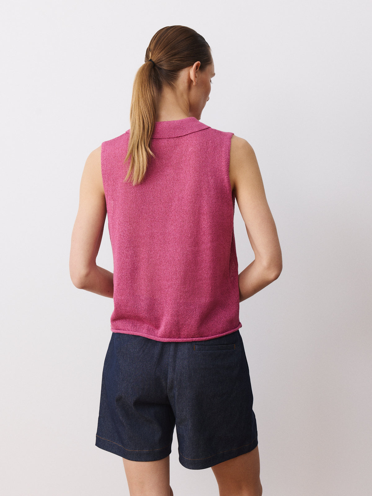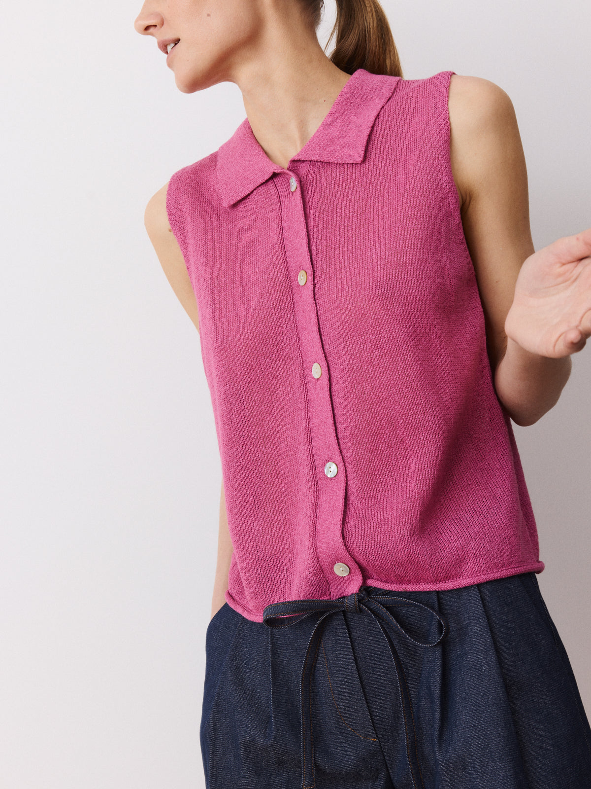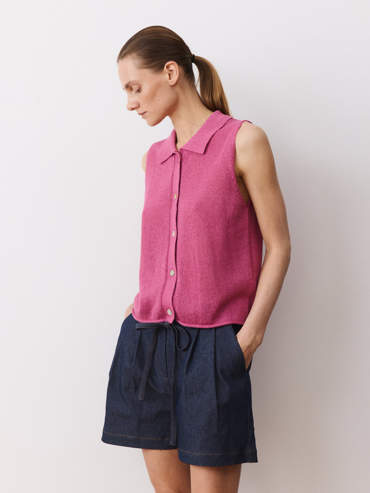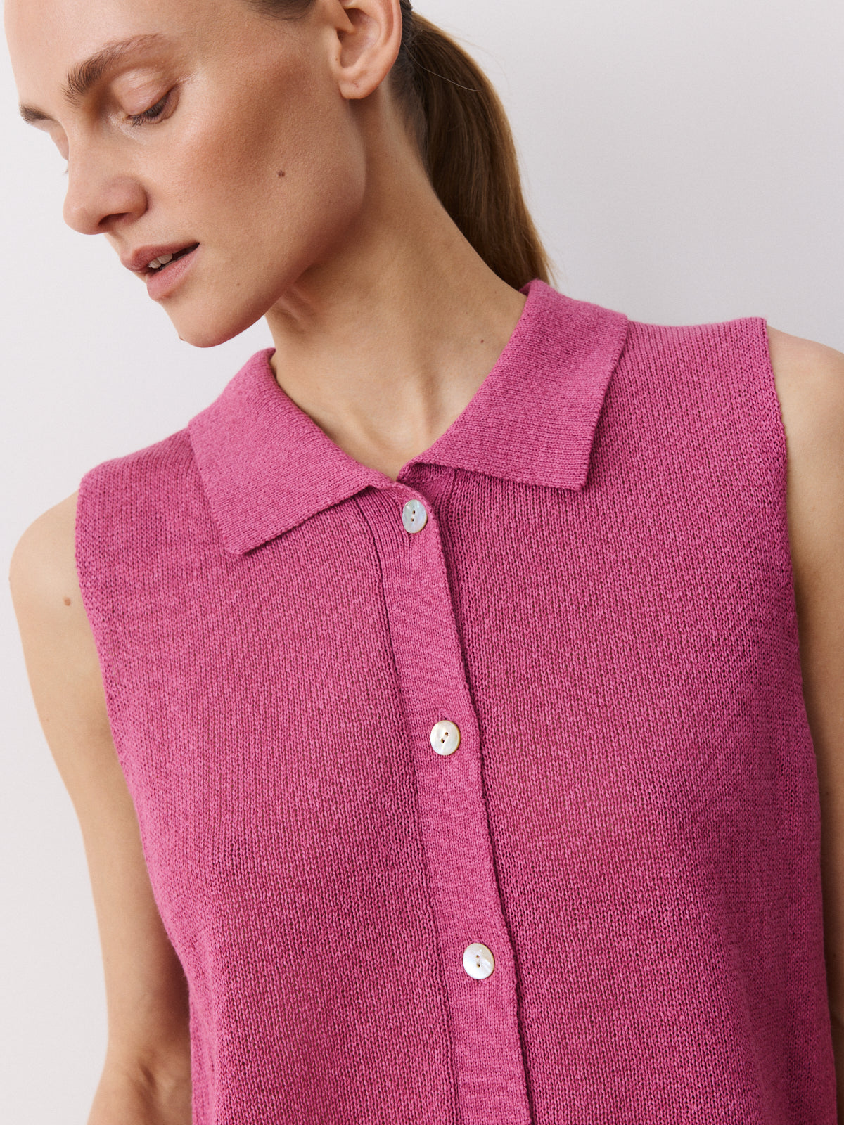 This elegant sleeveless top stands out through its yarn, crafted from a crisp paper and recycled polyester blend in candy pink with a paper-like surface. It features a shirt collar, button-down opening, pearl coloured buttons and a regular fit.
