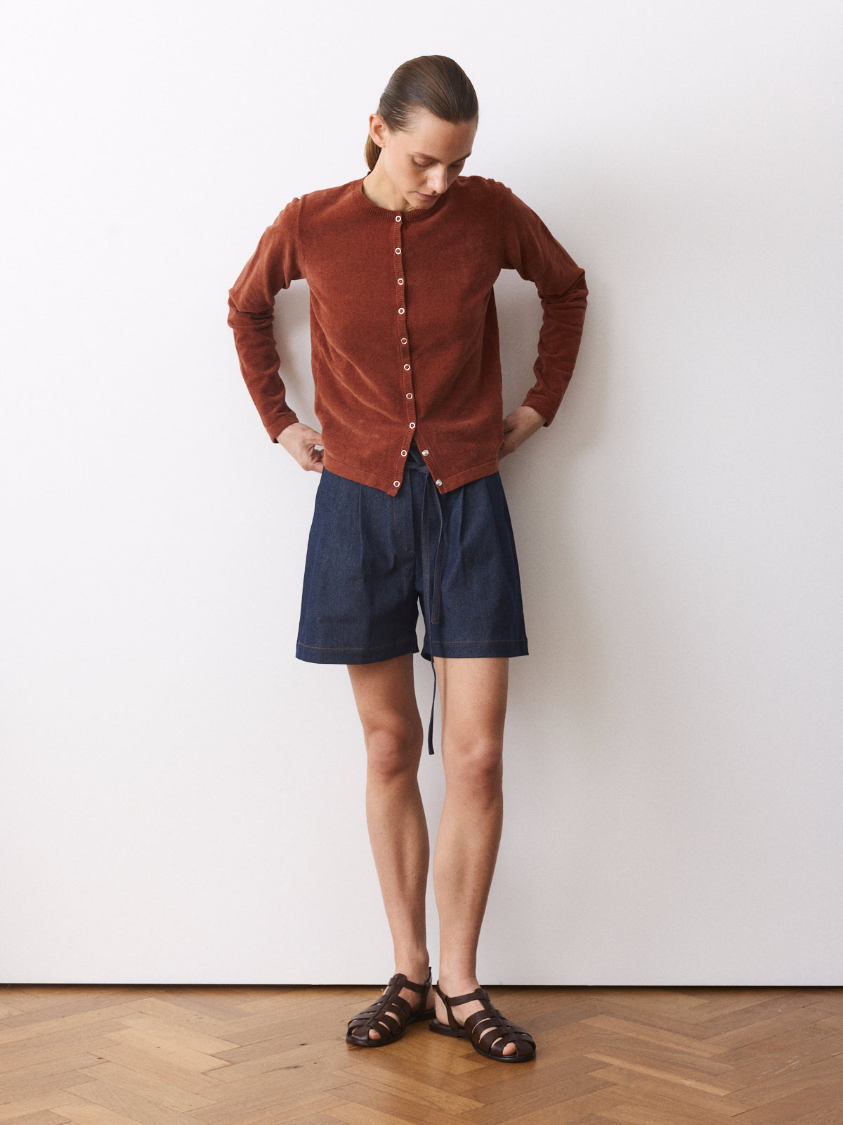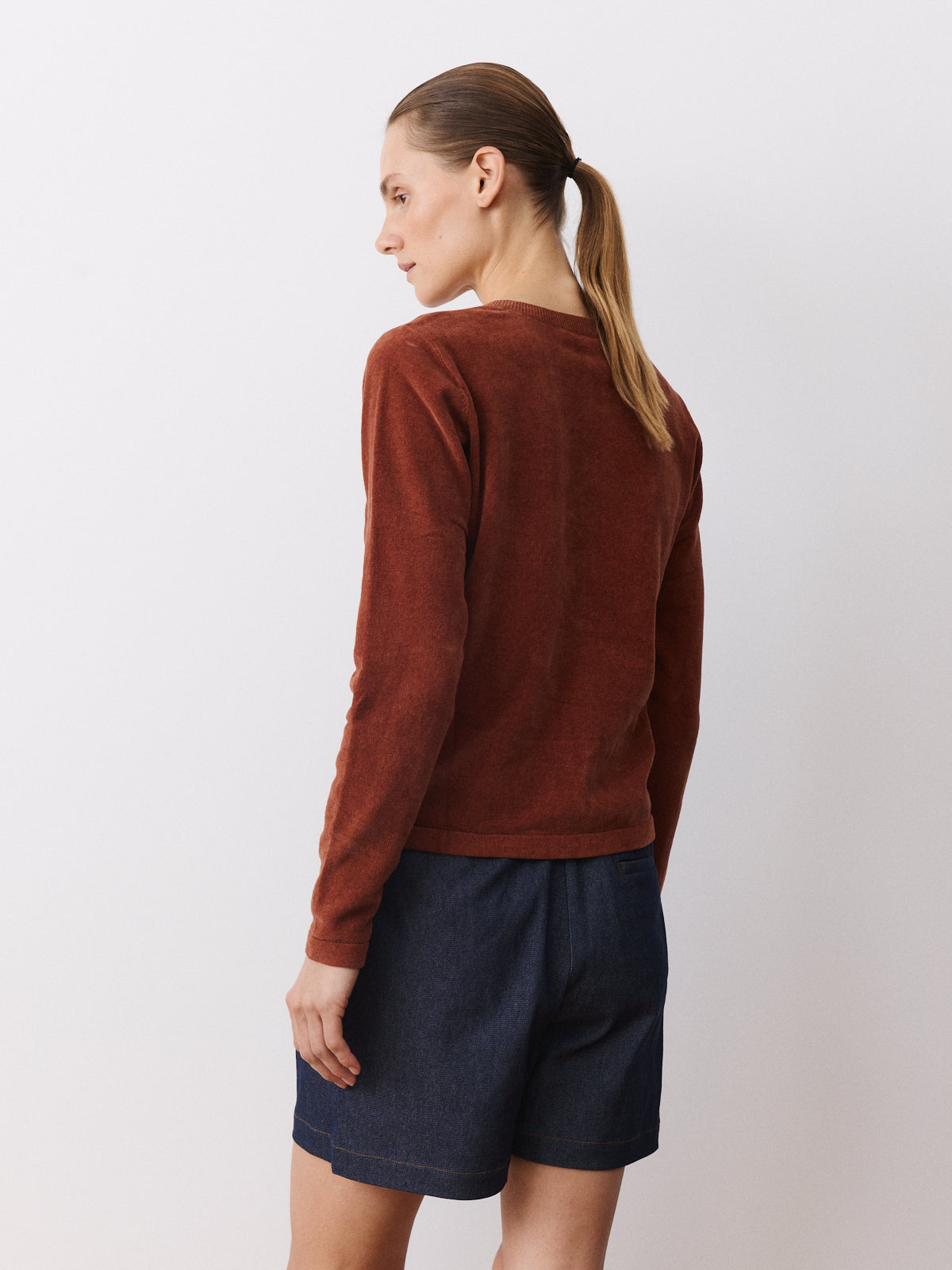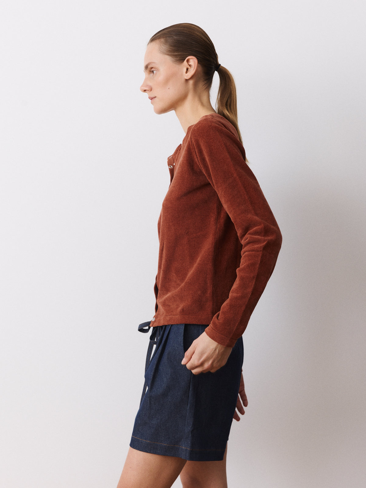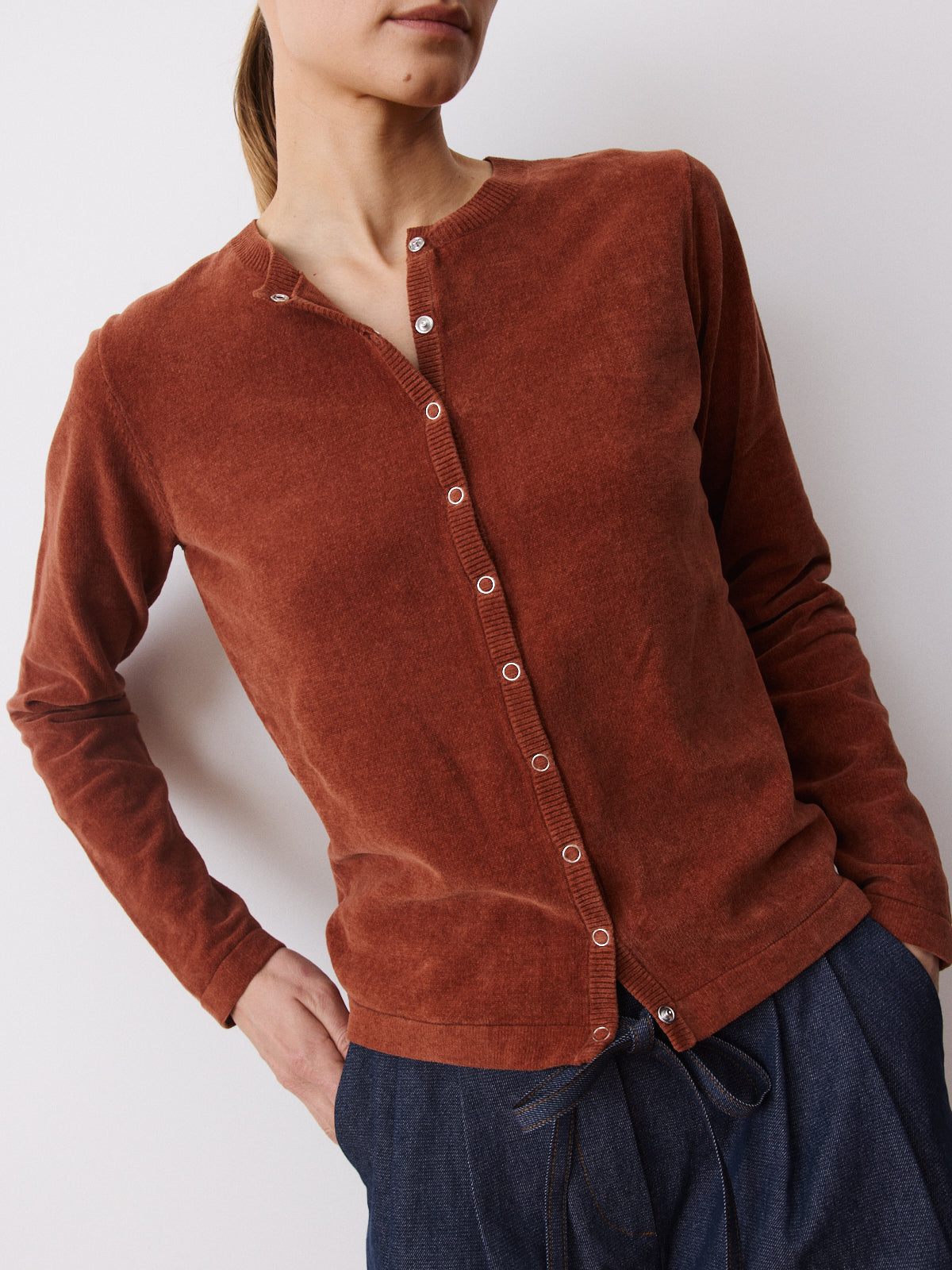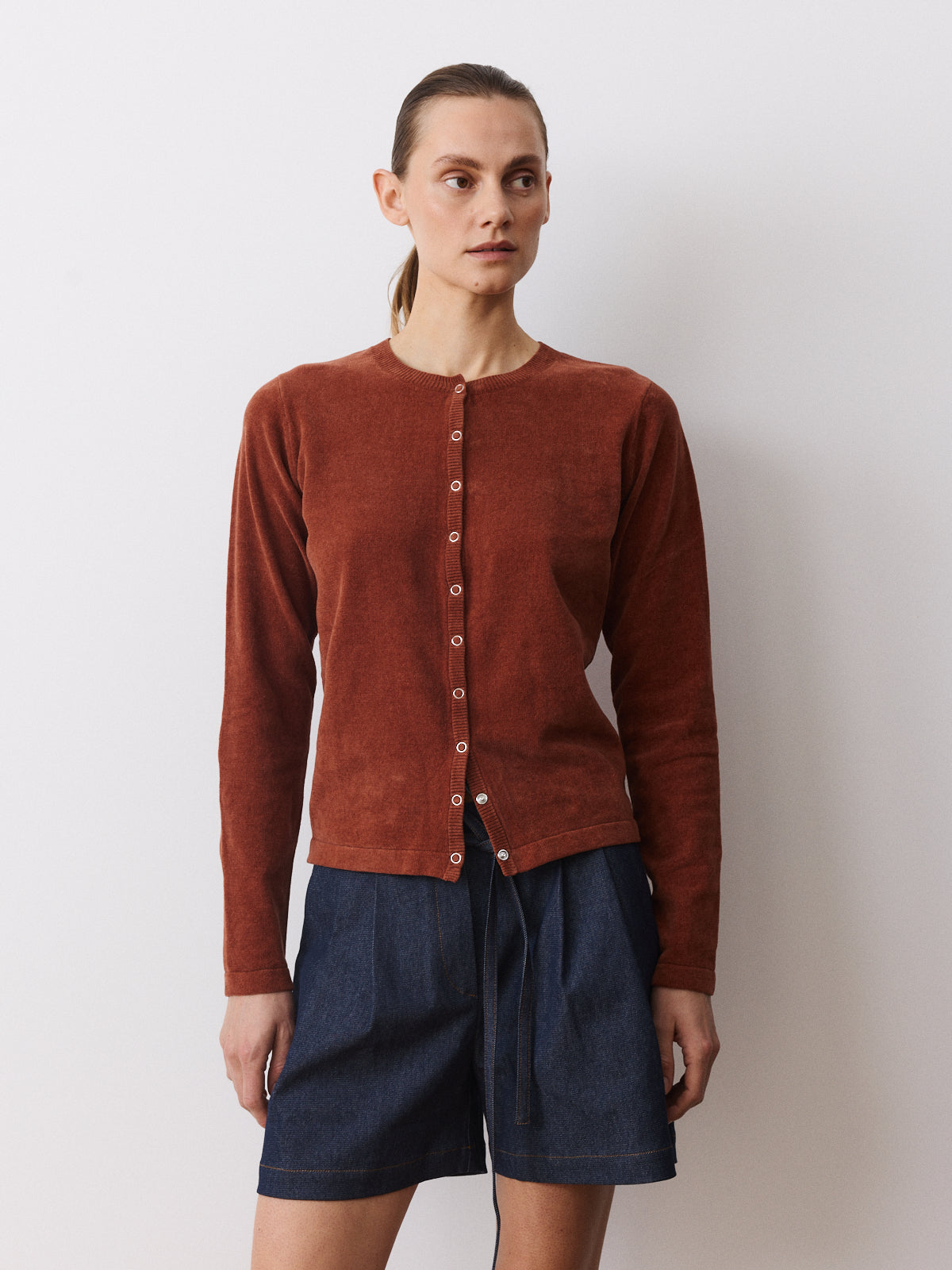 In a deep cinnamon brown tone, this cardigan stands out through its 100% cotton velvet knit with a soft, gently fuzzy surface. Clean and compact in appearance, it features a round neckline, long sleeves, a straight fit and press-button closure.