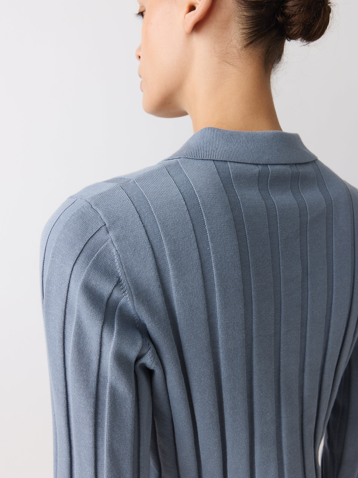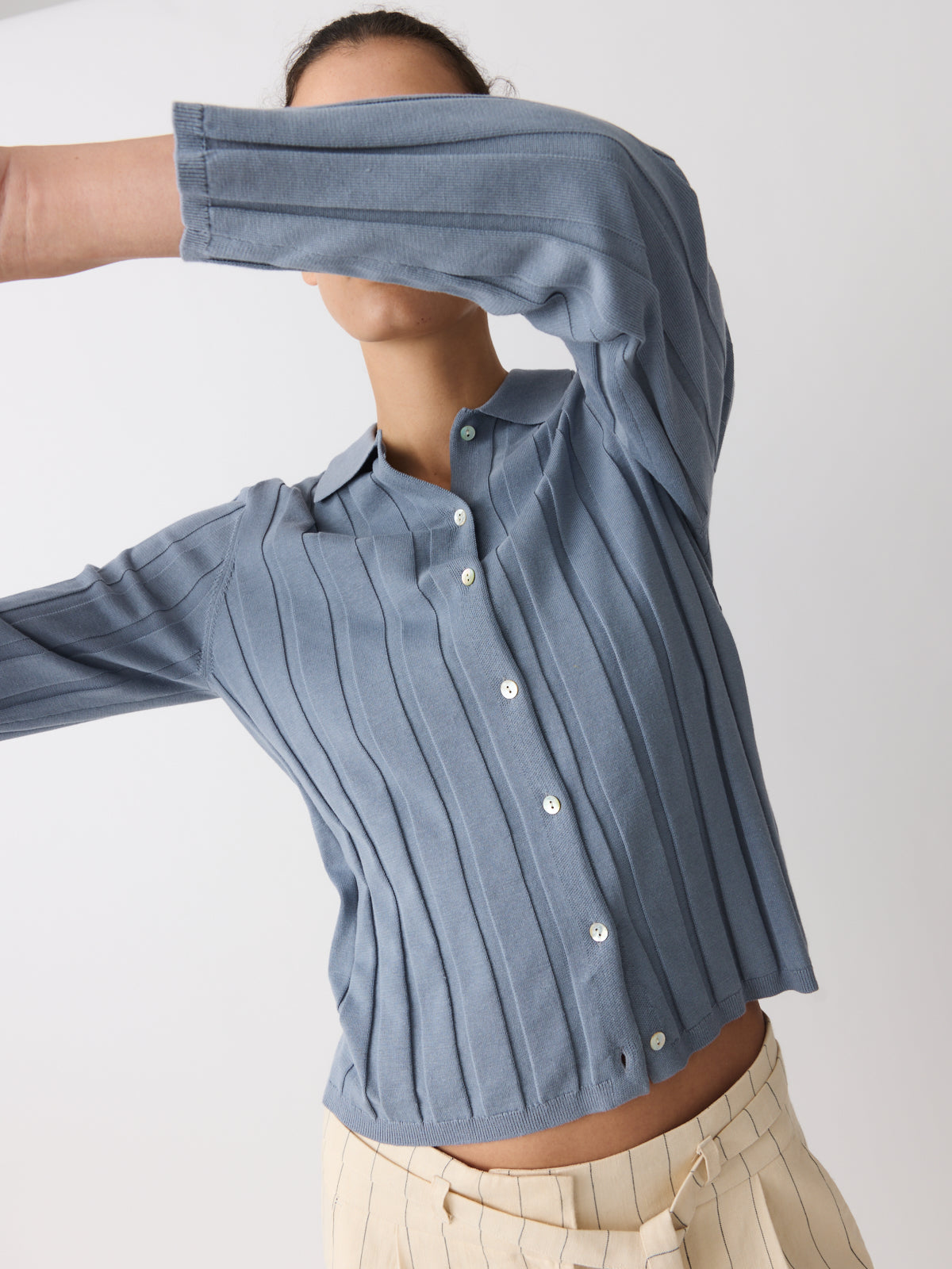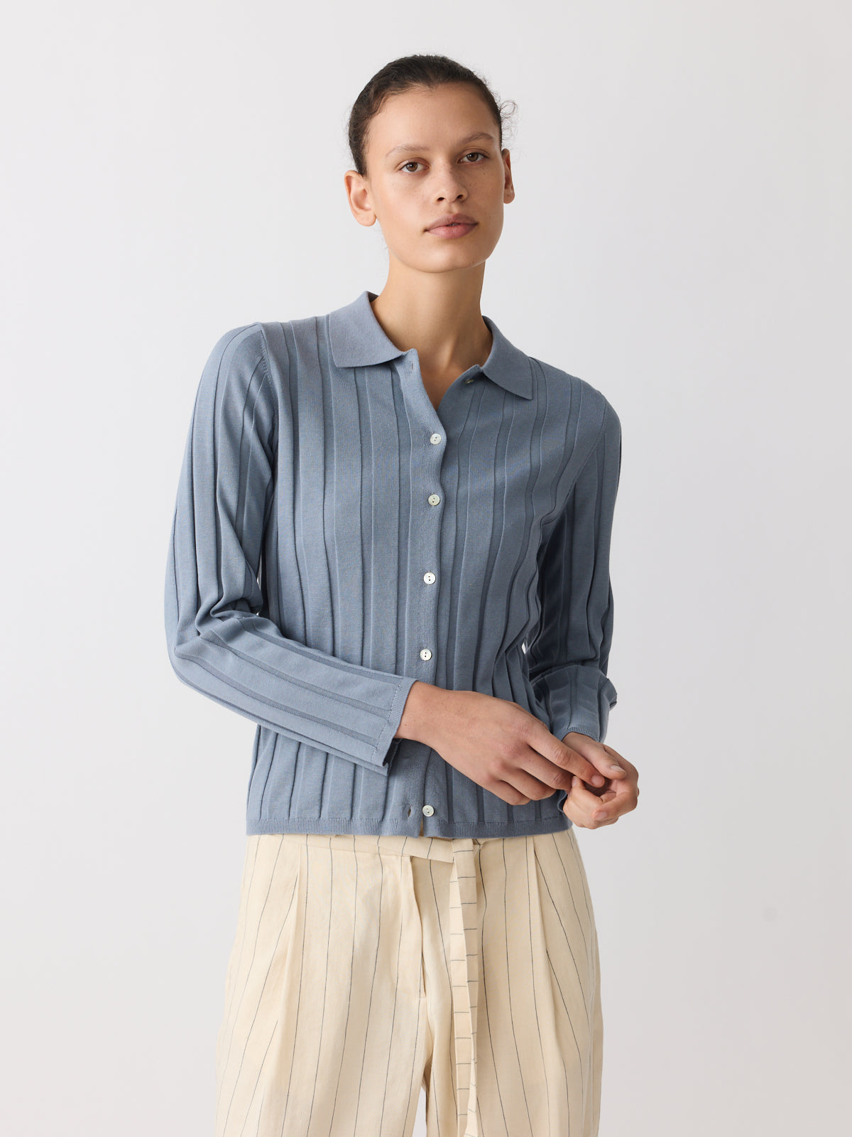 A knitted shirt defined by colour, this style is knitted from a cotton and linen blend with a slightly structured, artisanal character in a muted stormy blue tone. Designed with a fitted silhouette, shirt collar, long sleeves and pearl-coloured buttons.