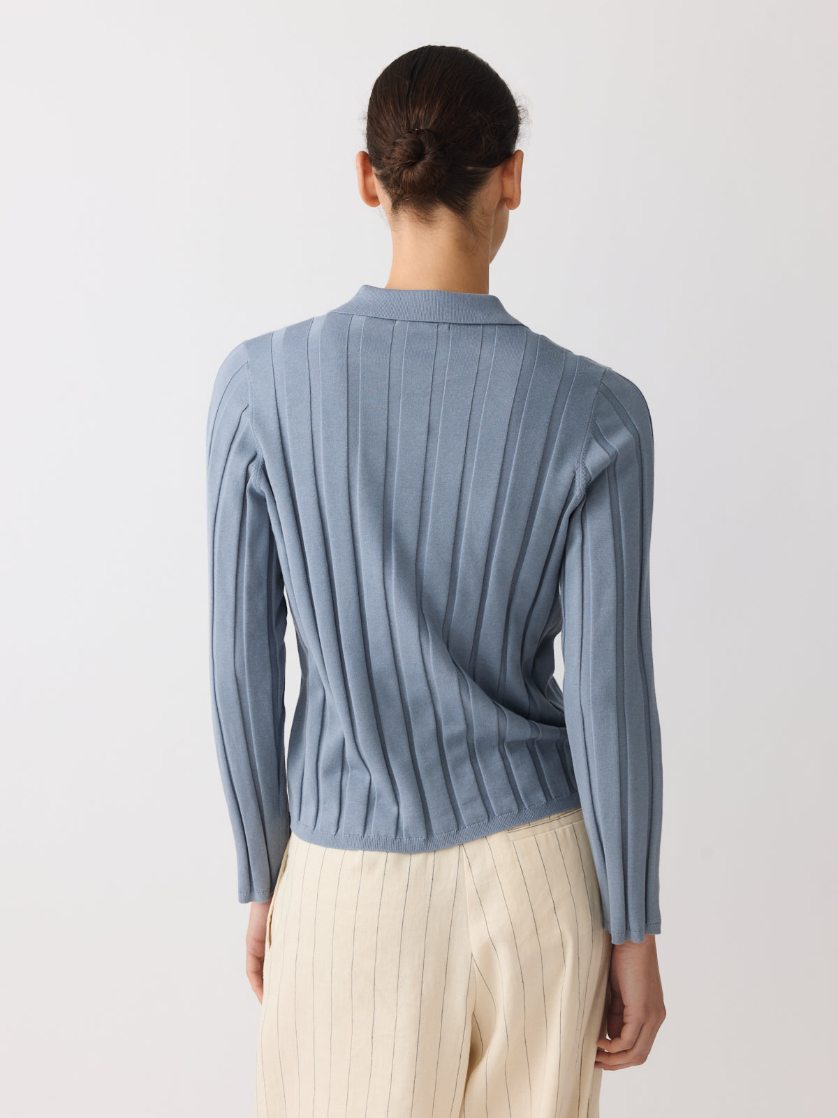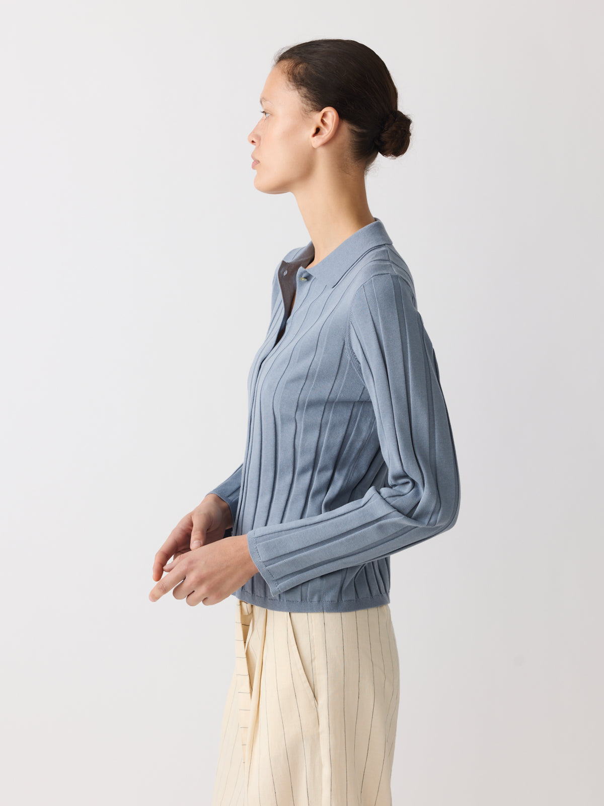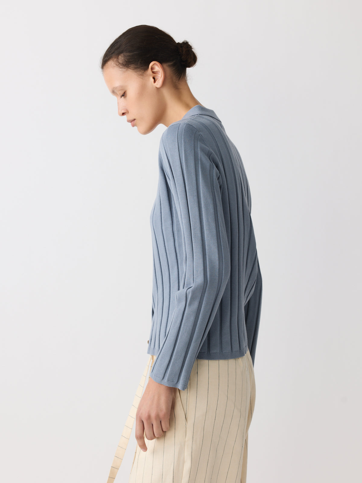 A knitted shirt defined by colour, this style is knitted from a cotton and linen blend with a slightly structured, artisanal character in a muted stormy blue tone. Designed with a fitted silhouette, shirt collar, long sleeves and pearl-coloured buttons.