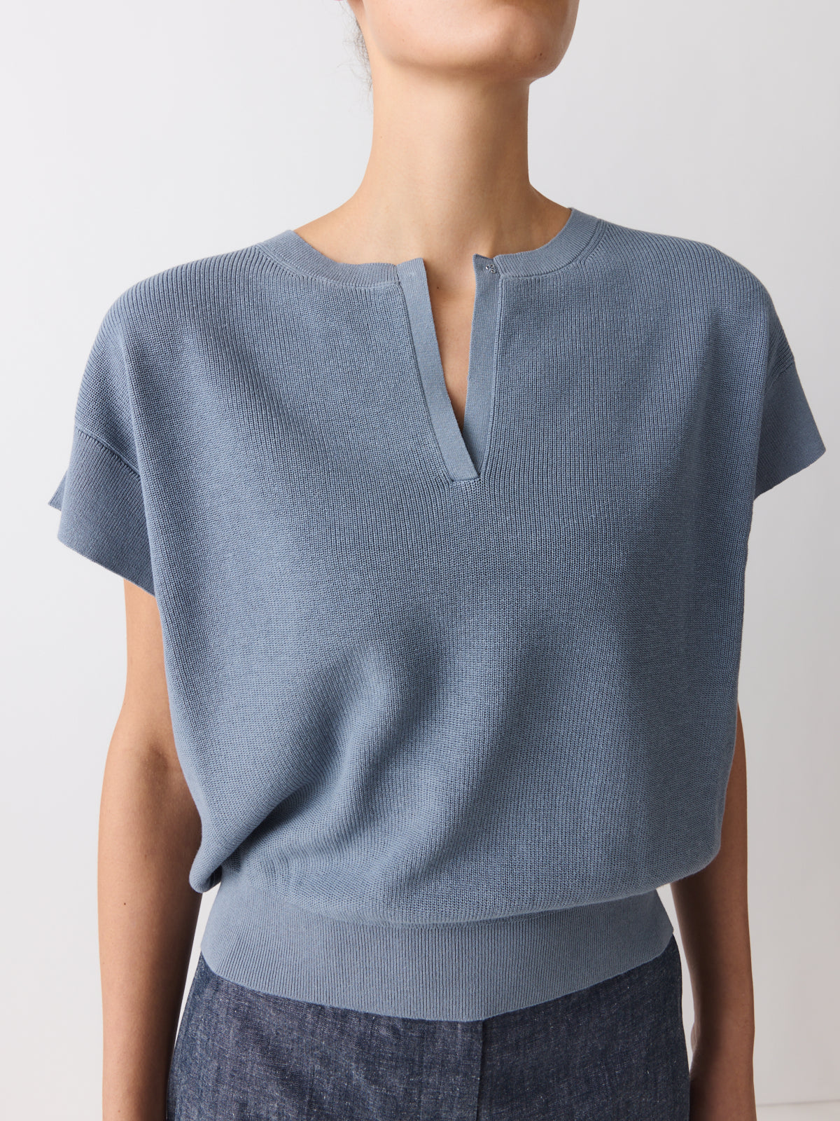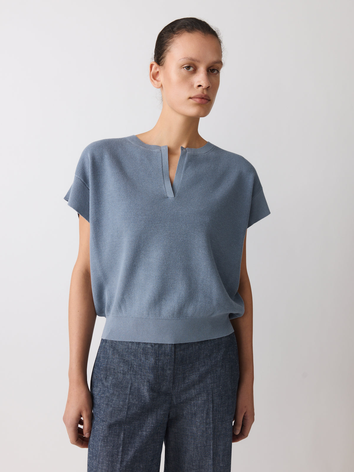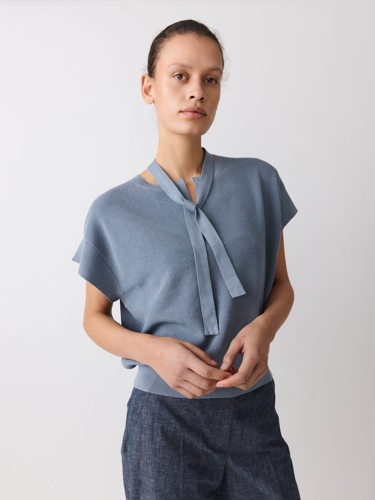 Defined by its shape, this sleeveless knit top balances a relaxed fit with a fitted waistband. Knitted from a cotton and linen blend in a muted stormy blue. Finished with a V-neck, cap sleeves, a hook-and-bar closure and a detachable self-fabric tie.