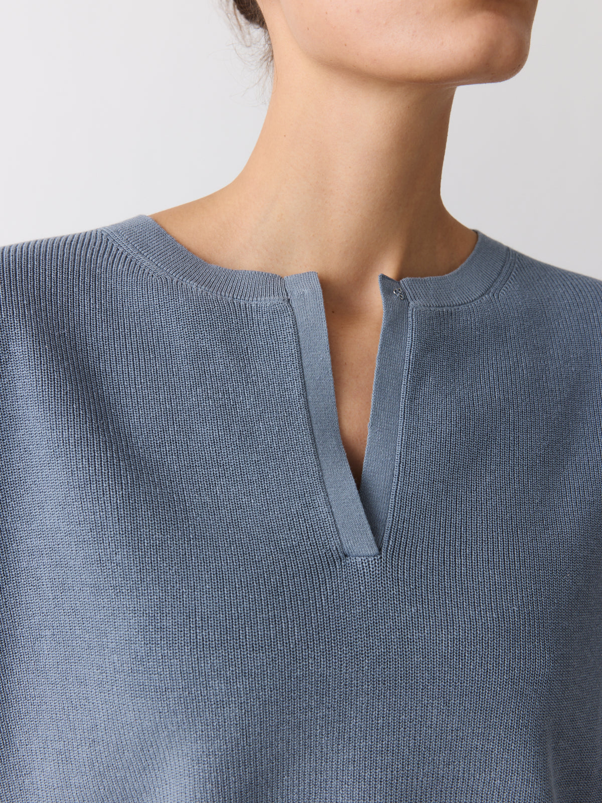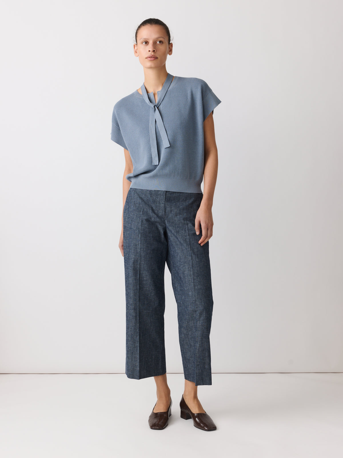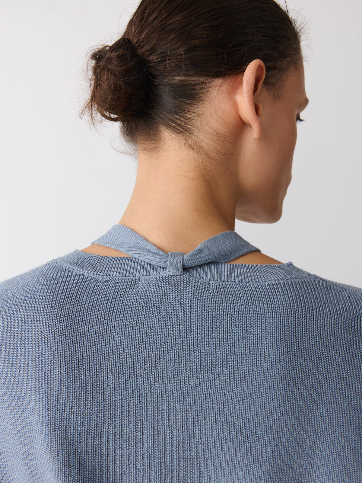 Defined by its shape, this sleeveless knit top balances a relaxed fit with a fitted waistband. Knitted from a cotton and linen blend in a muted stormy blue. Finished with a V-neck, cap sleeves, a hook-and-bar closure and a detachable self-fabric tie.