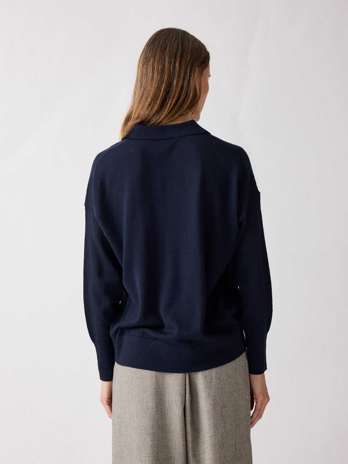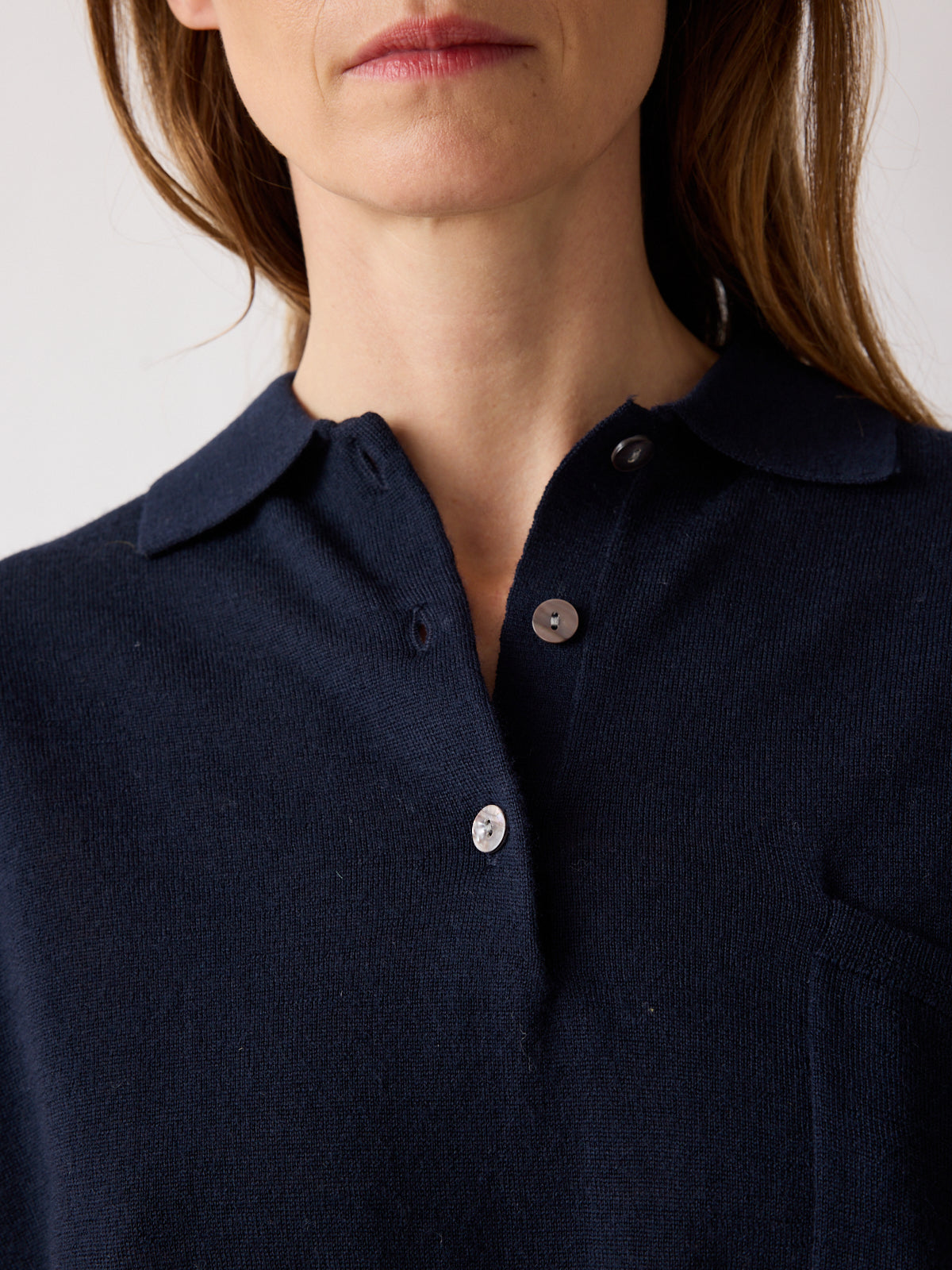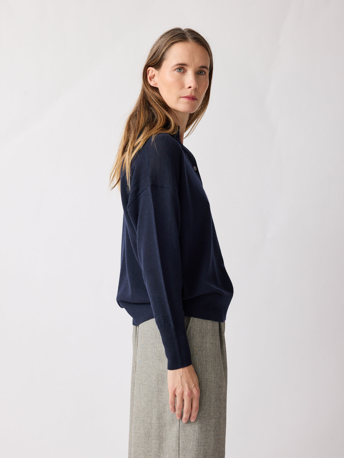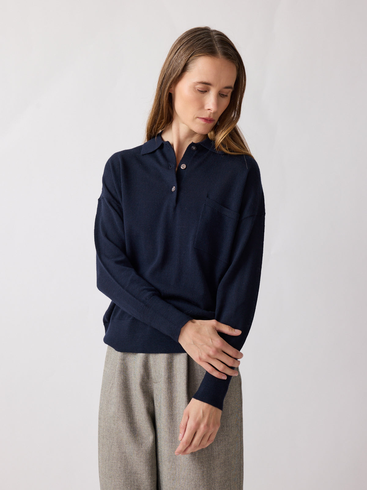 This polo sweater is knitted (fine plain jersey technique) in an extra fine merino wool yarn for a fluid drape in deep navy. It is designed for an oversized fit and features a polo collar, and a fitted waistband to crop the garment at the hips. Its details include a patch pocket, a ribbed neck, cuffs and waistband. Made in China.