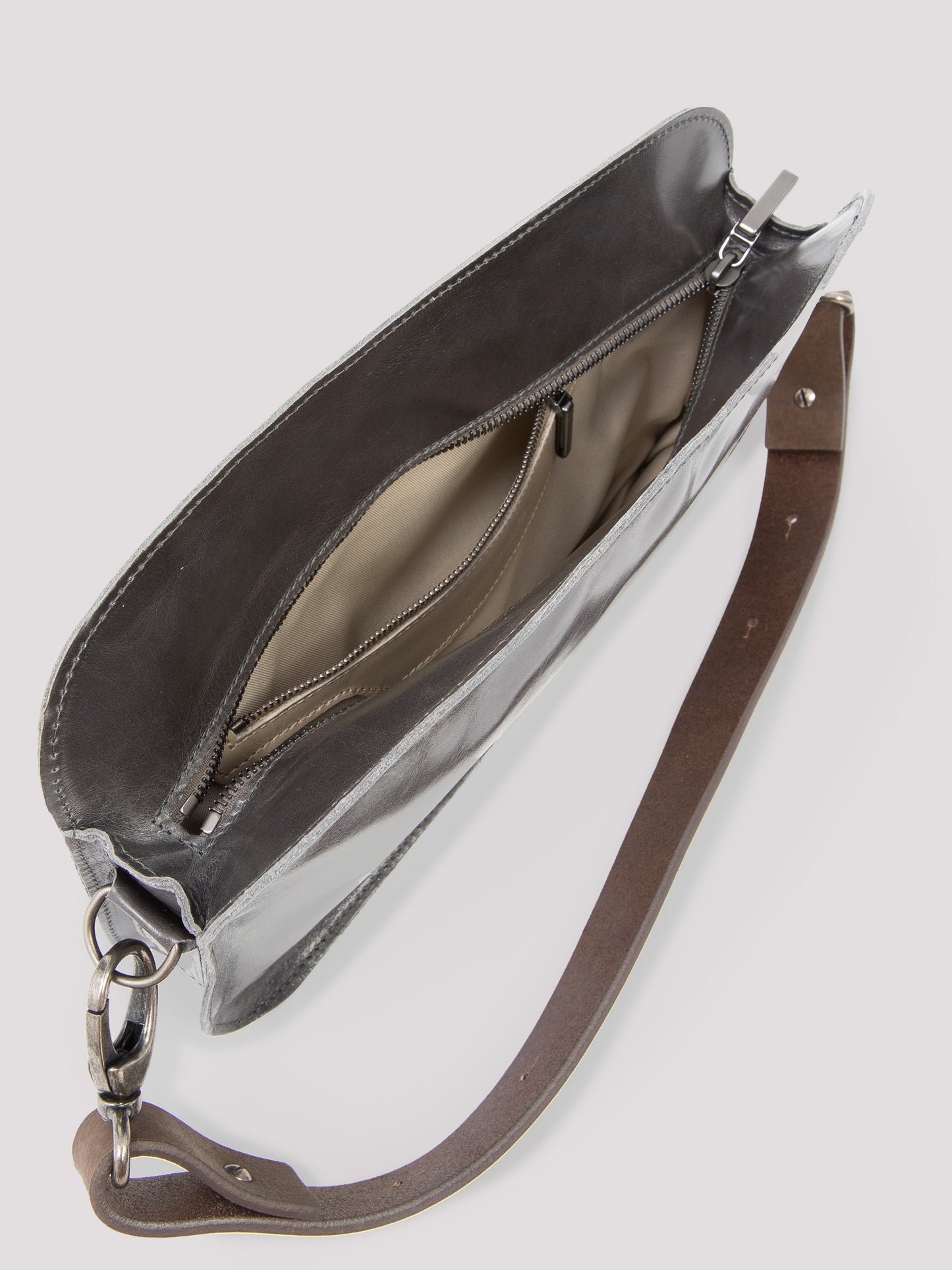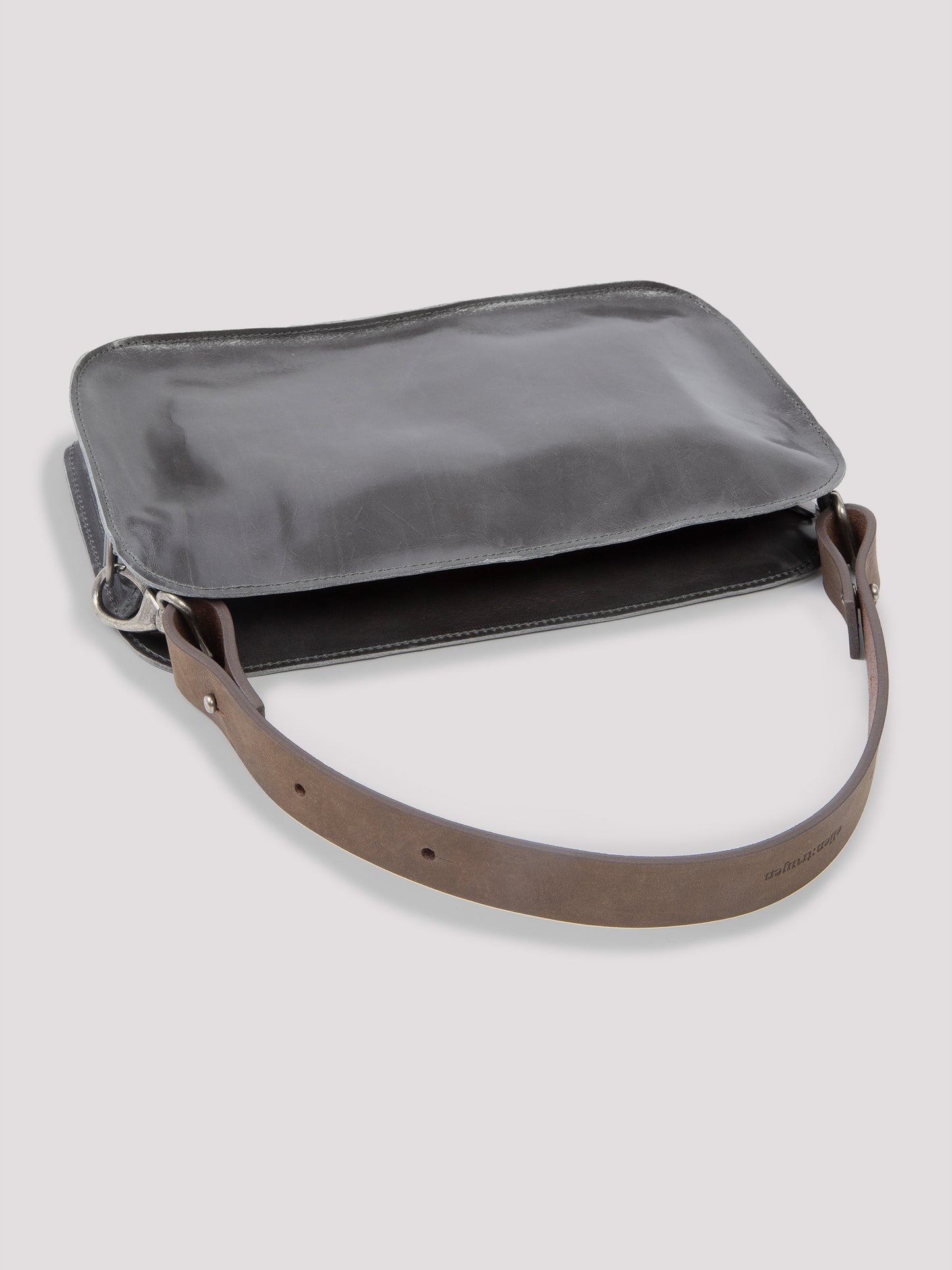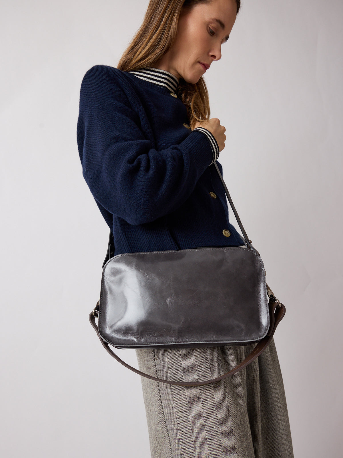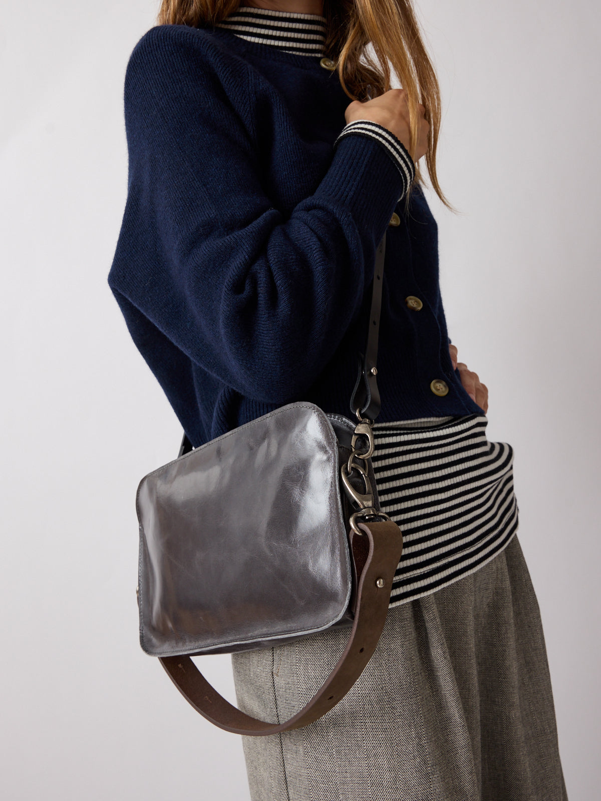 Compact yet practical, this Ellen Truijen handbag is crafted in soft grey bovine leather. Despite its modest size, it offers ample space for daily essentials and features two adjustable shoulder straps for versatile wear. Delivered with a long strap, it adapts seamlessly to your preferred style. Designed and crafted in Ellen Truijen’s own studio, it reflects her hands-on approach and dedication to timeless, functional design.