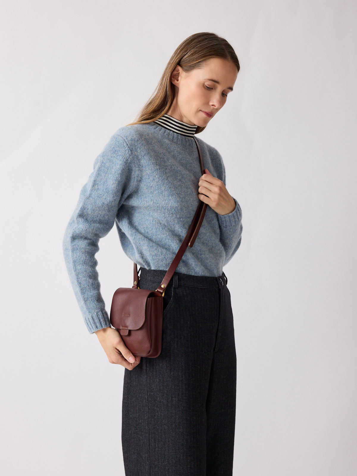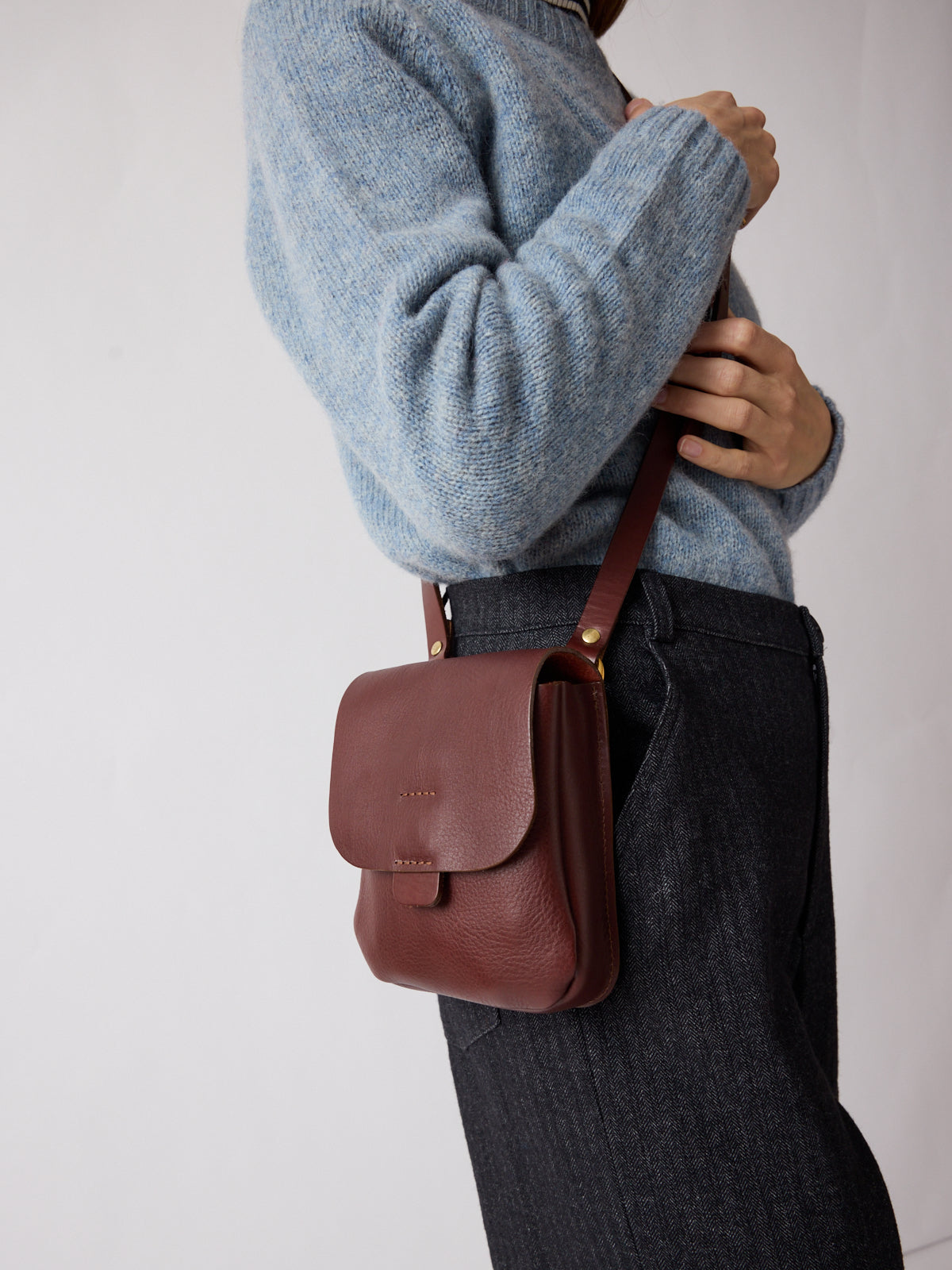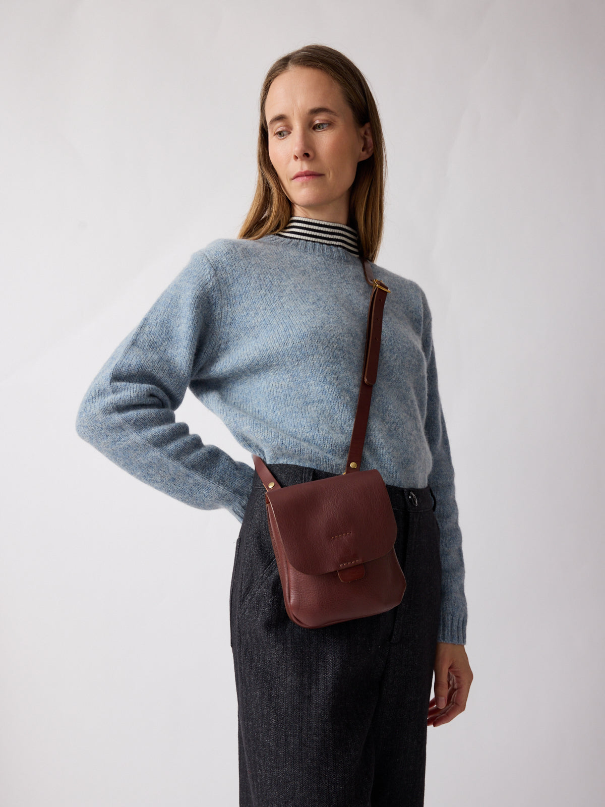 A cute mini bag with a cross-body strap, crafted from cognac Italian vegetable-tanned leather. Inspired by classic postman bags, its natural finish make it a timeless piece that develops a beautiful patina with age. Elegant and practical, it grows more distinctive with every wear.