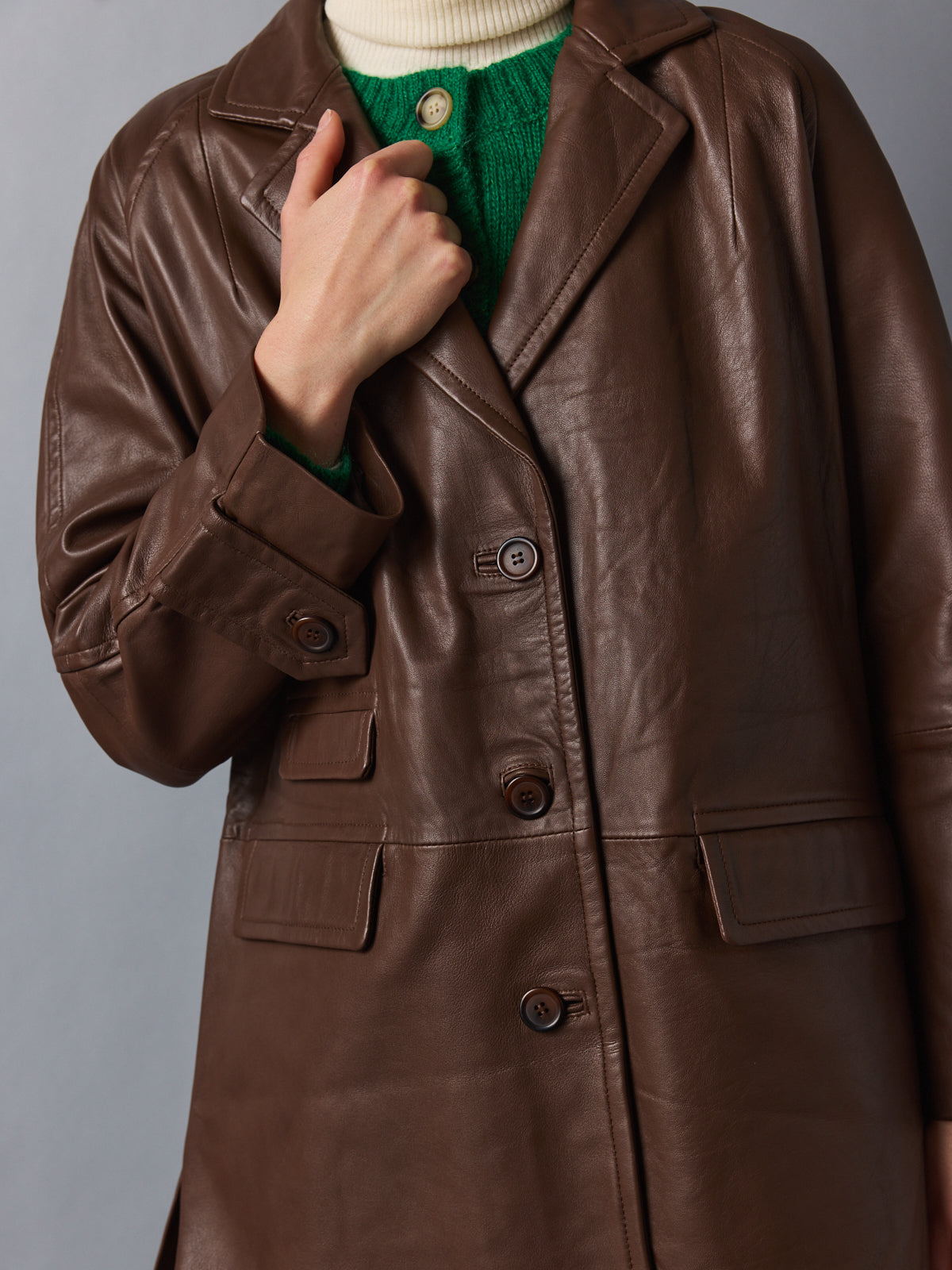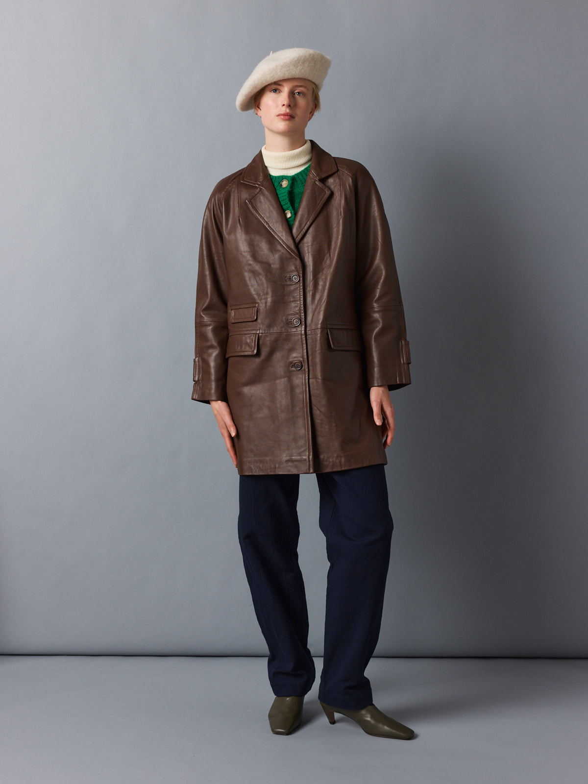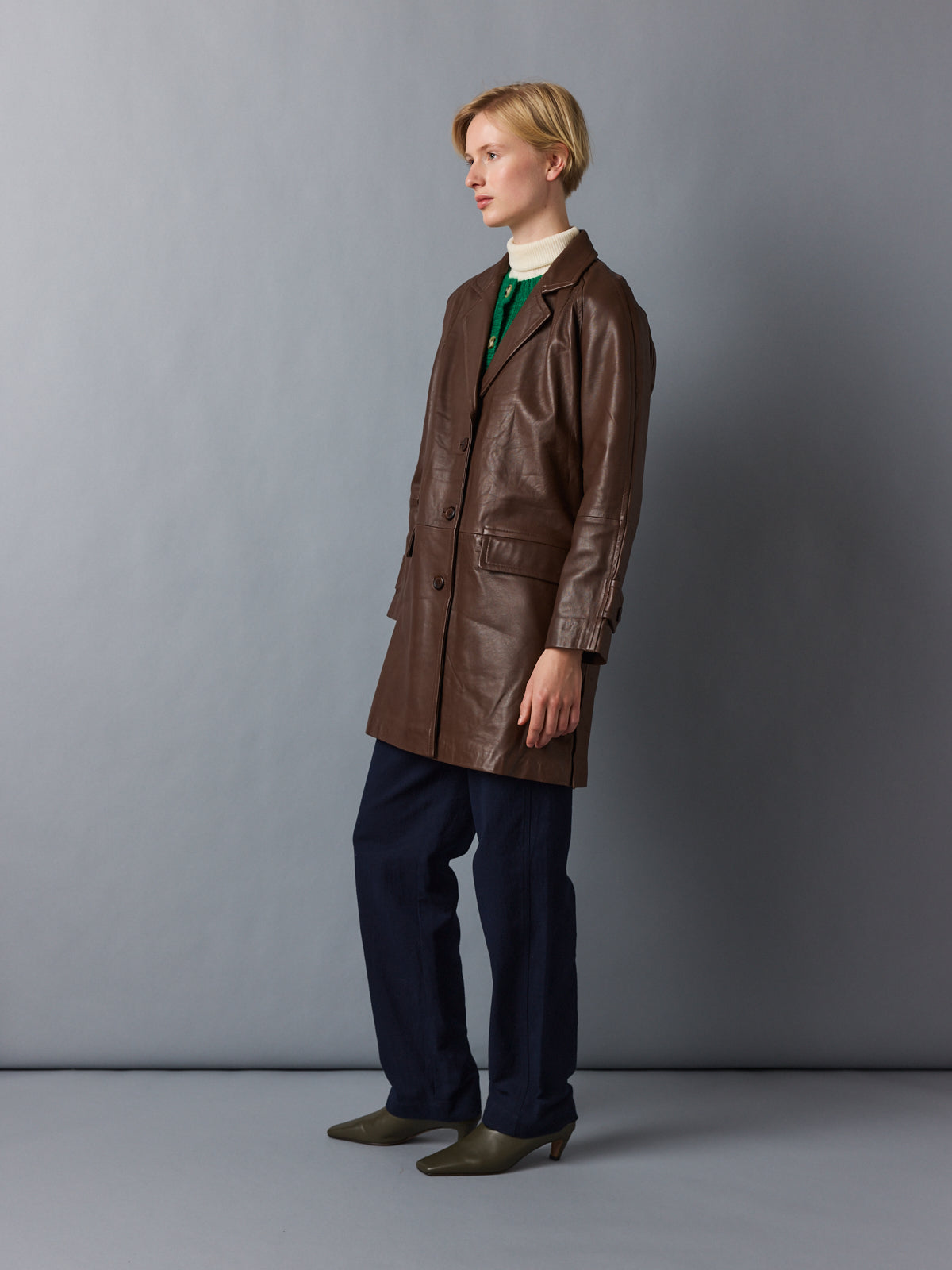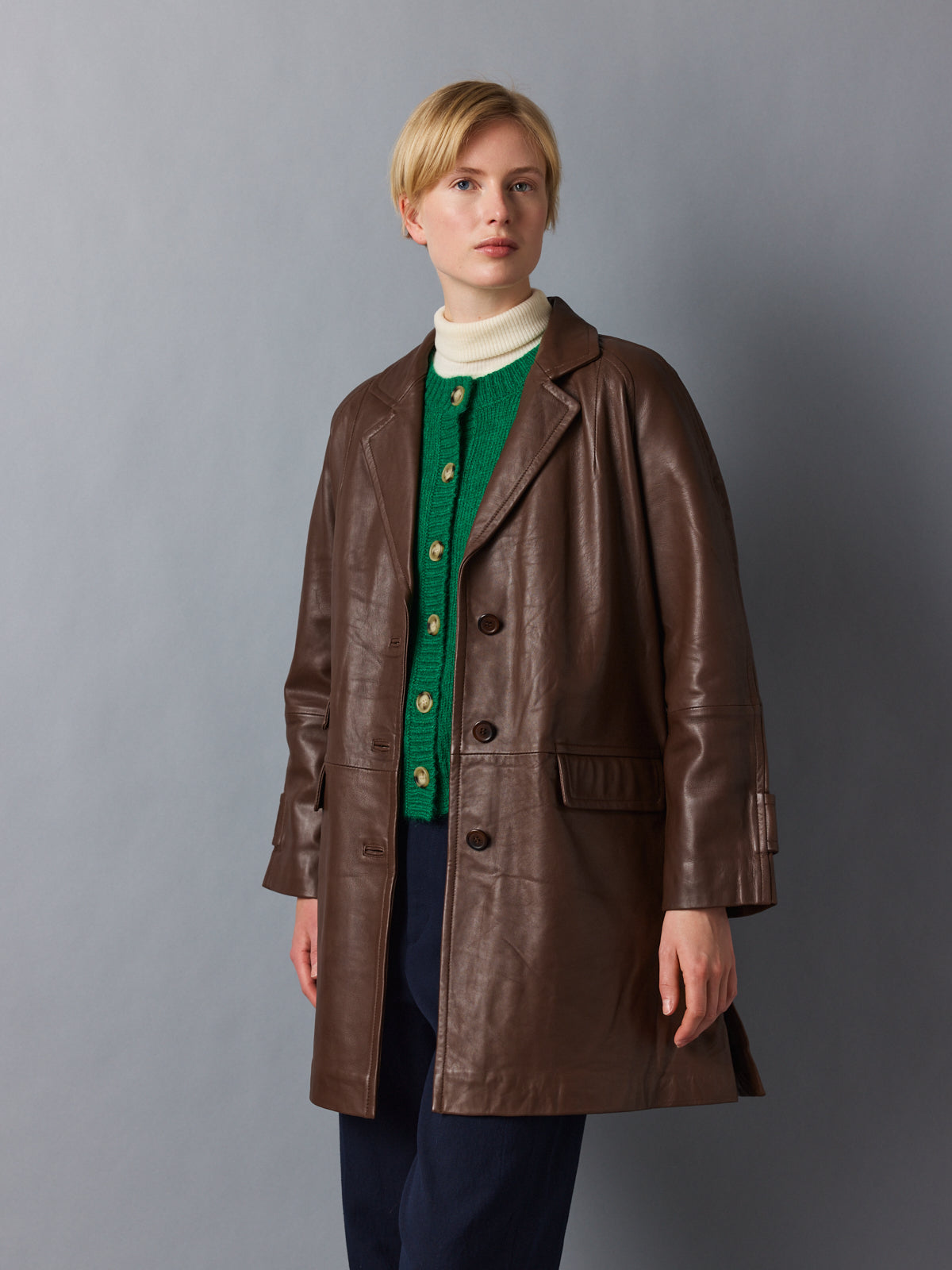 This knee-length winter coat is made from sturdy brown cow leather. It is cut for a generous fit, with raglan shoulders. It features a deep V-line, button closure, three front pockets, and a suit-collar. Made in India.