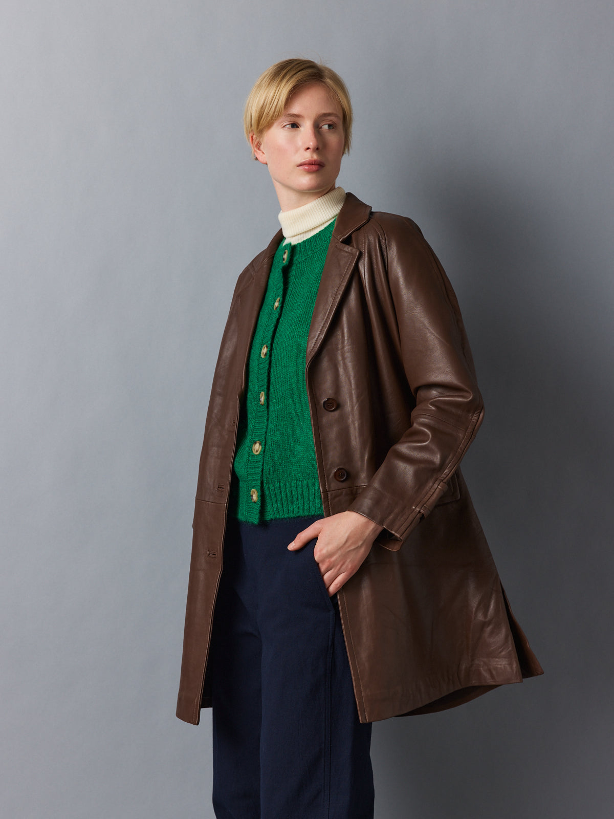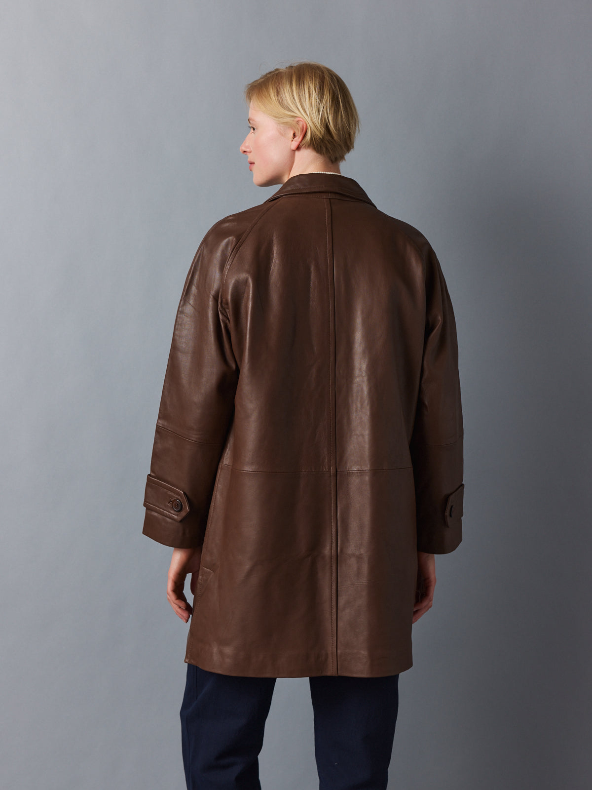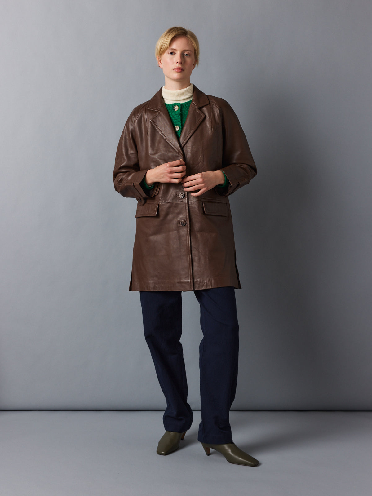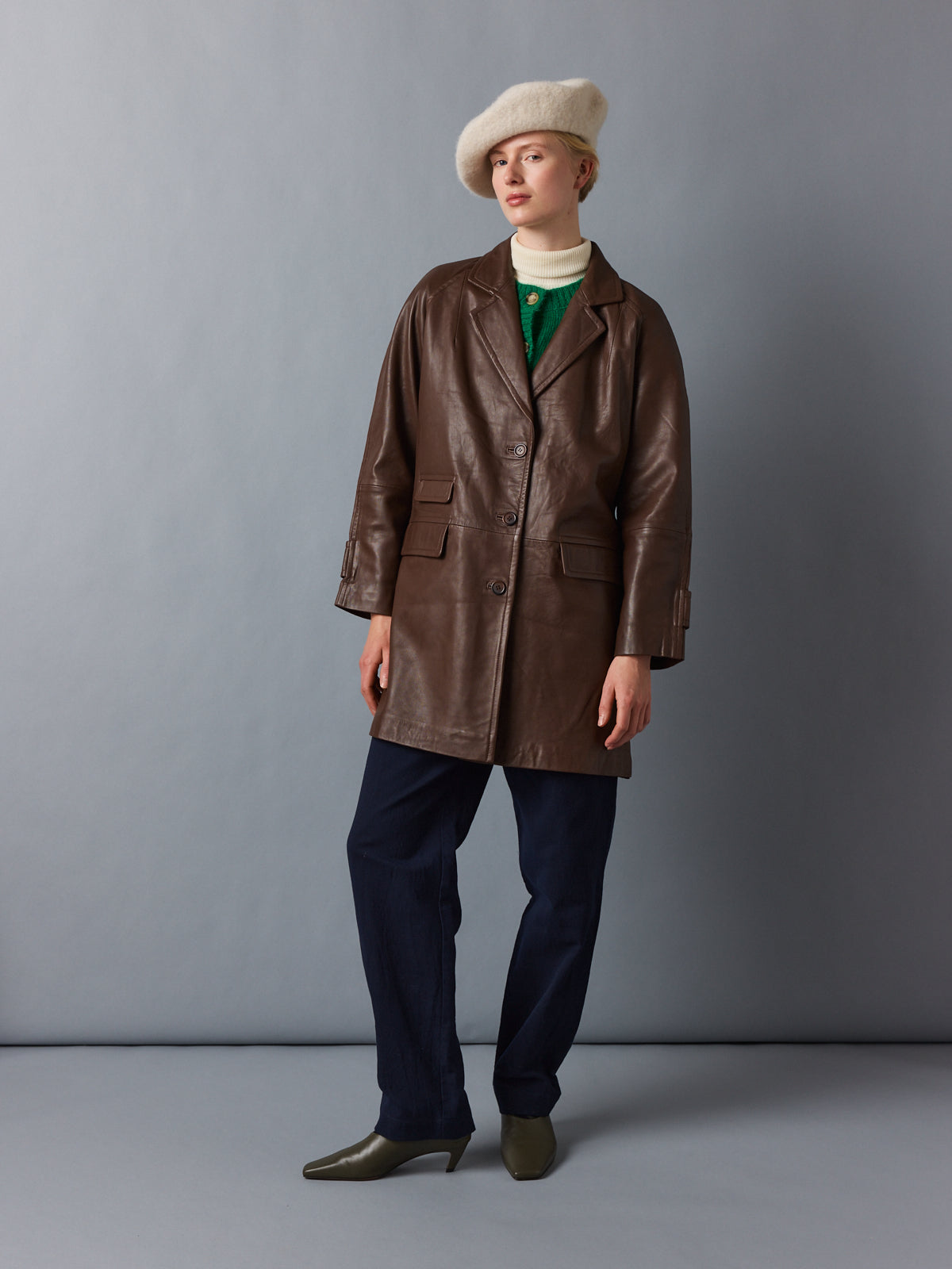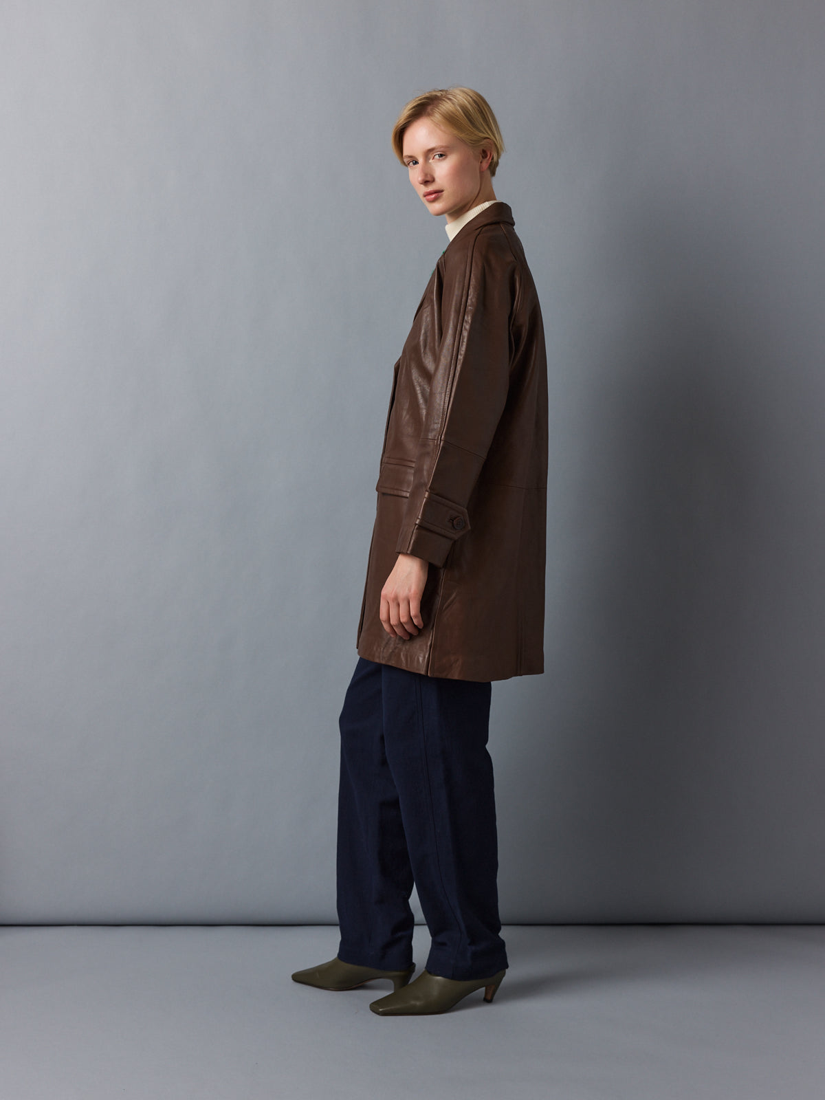 This knee-length winter coat is made from sturdy brown cow leather. It is cut for a generous fit, with raglan shoulders. It features a deep V-line, button closure, three front pockets, and a suit-collar. Made in India.